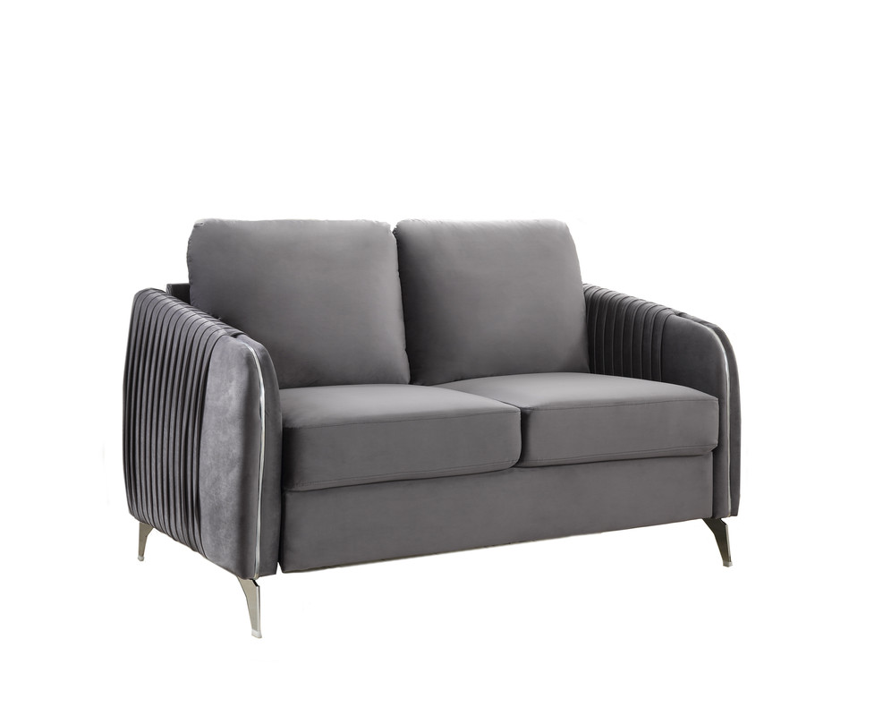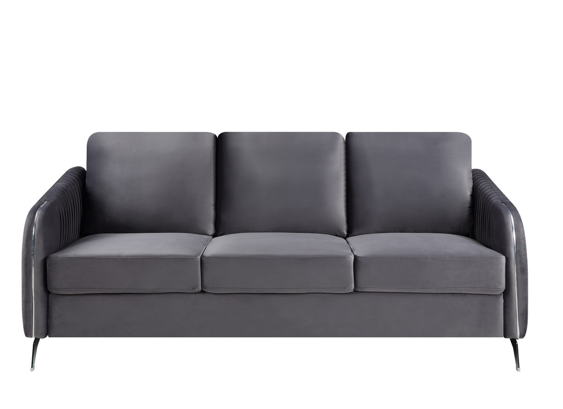 Glam up your living room with the Hathaway Collection! Crafted from fine wood and quality fabrics, the couches feature hand folded seams with chrome metal lining arms and chrome metal legs, wrapped in a soft velvet fabric. The design adds a touch of elegance to attract your guests and family members in comfort and style. Set includes 1 Sofa and 1 Loveseat.Vertical Channel-Quilted DesignChrome Metal Trim and LegsPocket Coil Springs provide Cushion SupportNon-removable seat cushionsRemovable Back CushionsSofa measures 77"x34"x36"HLoveseat measures 54"x34"x36"H19" Seat Height22.5" Seat Depth5" Leg Height7" Seat Cushion Thickness