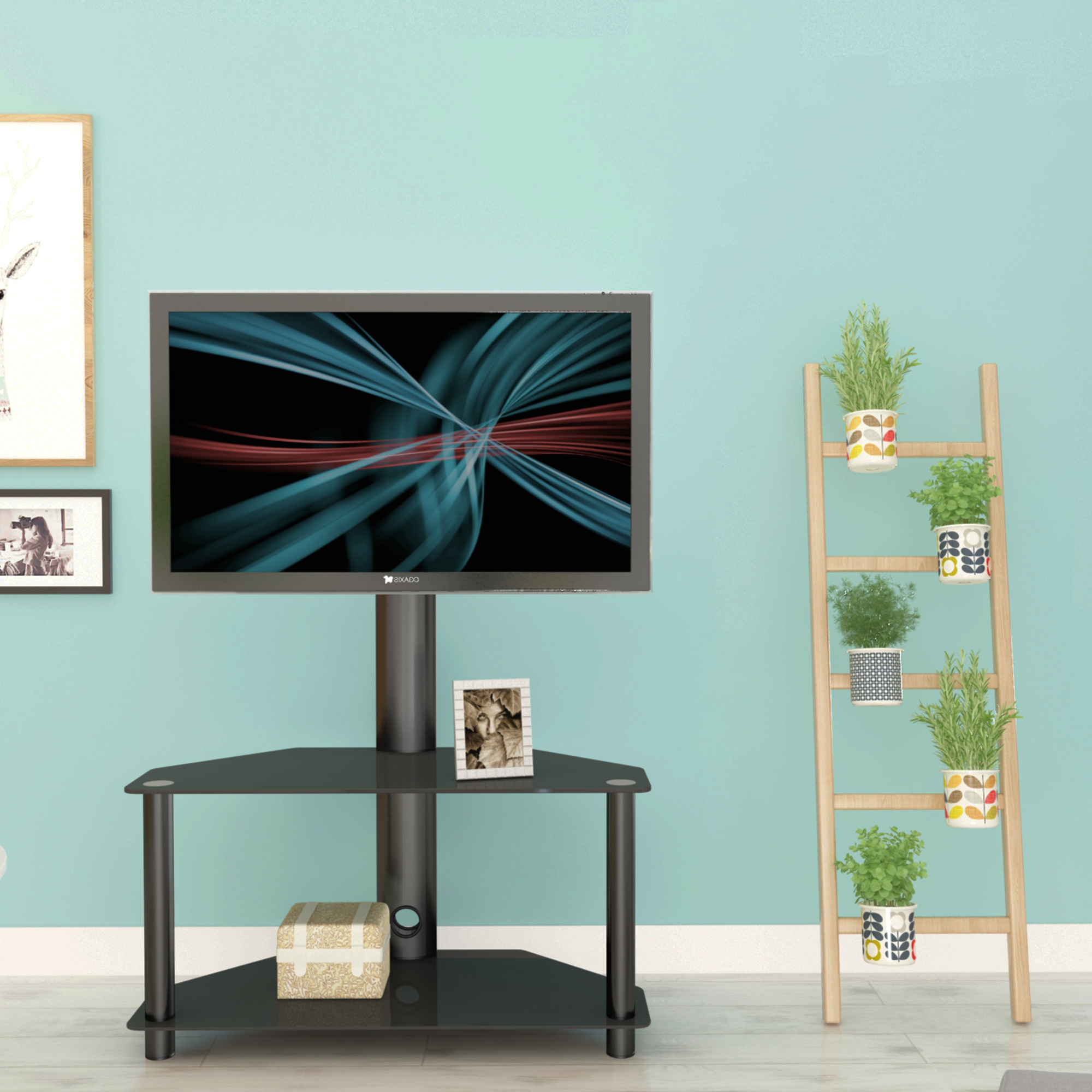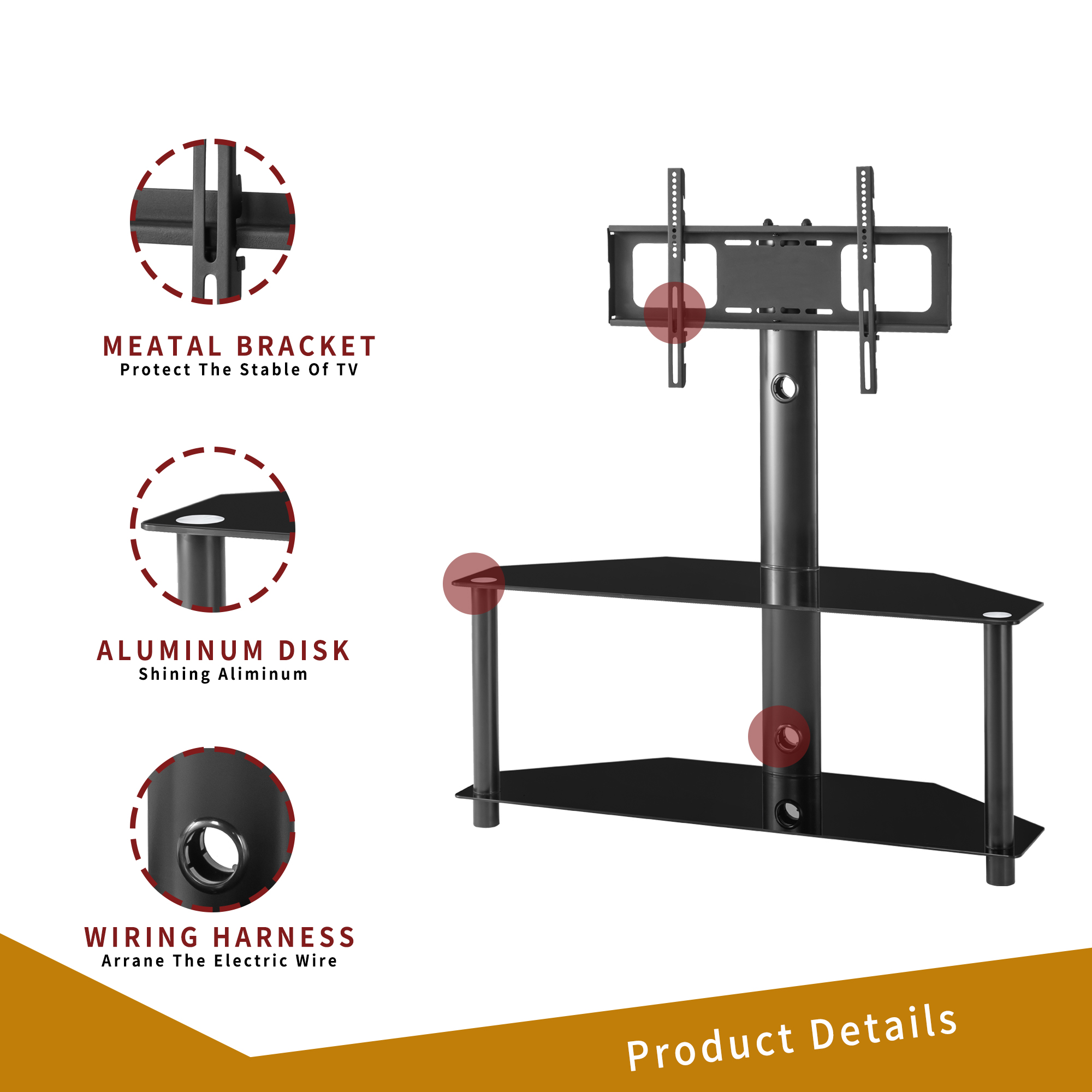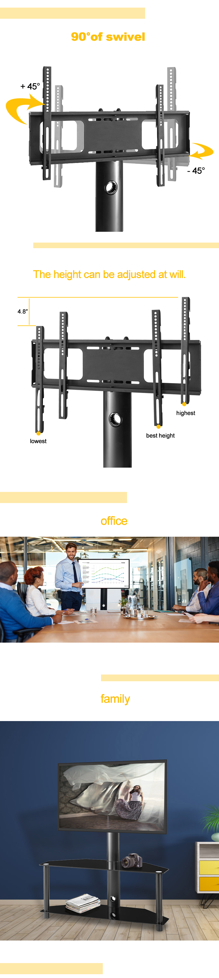 n The TV stand can swivel left and right 45 degrees and features height adjustments for different TV size or customer requirement.Security screw design prevent your TV from falling down and slipping.