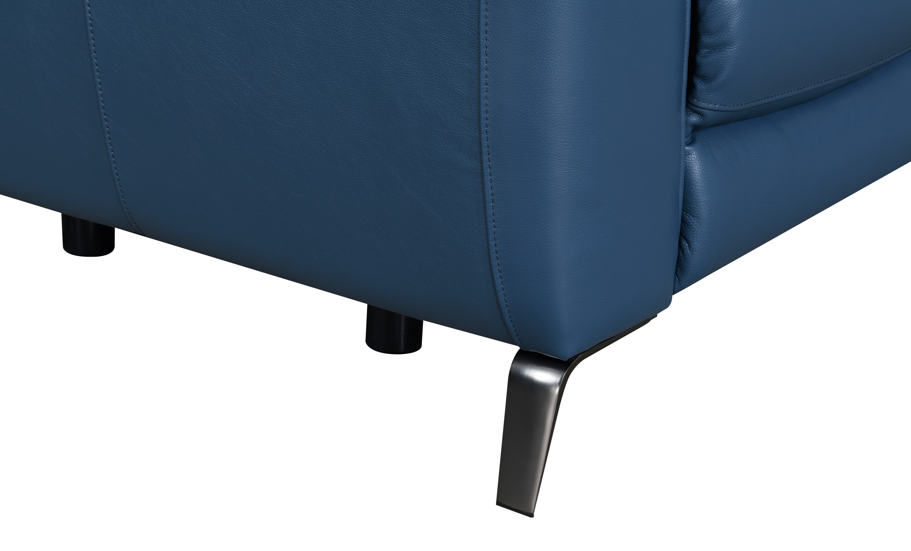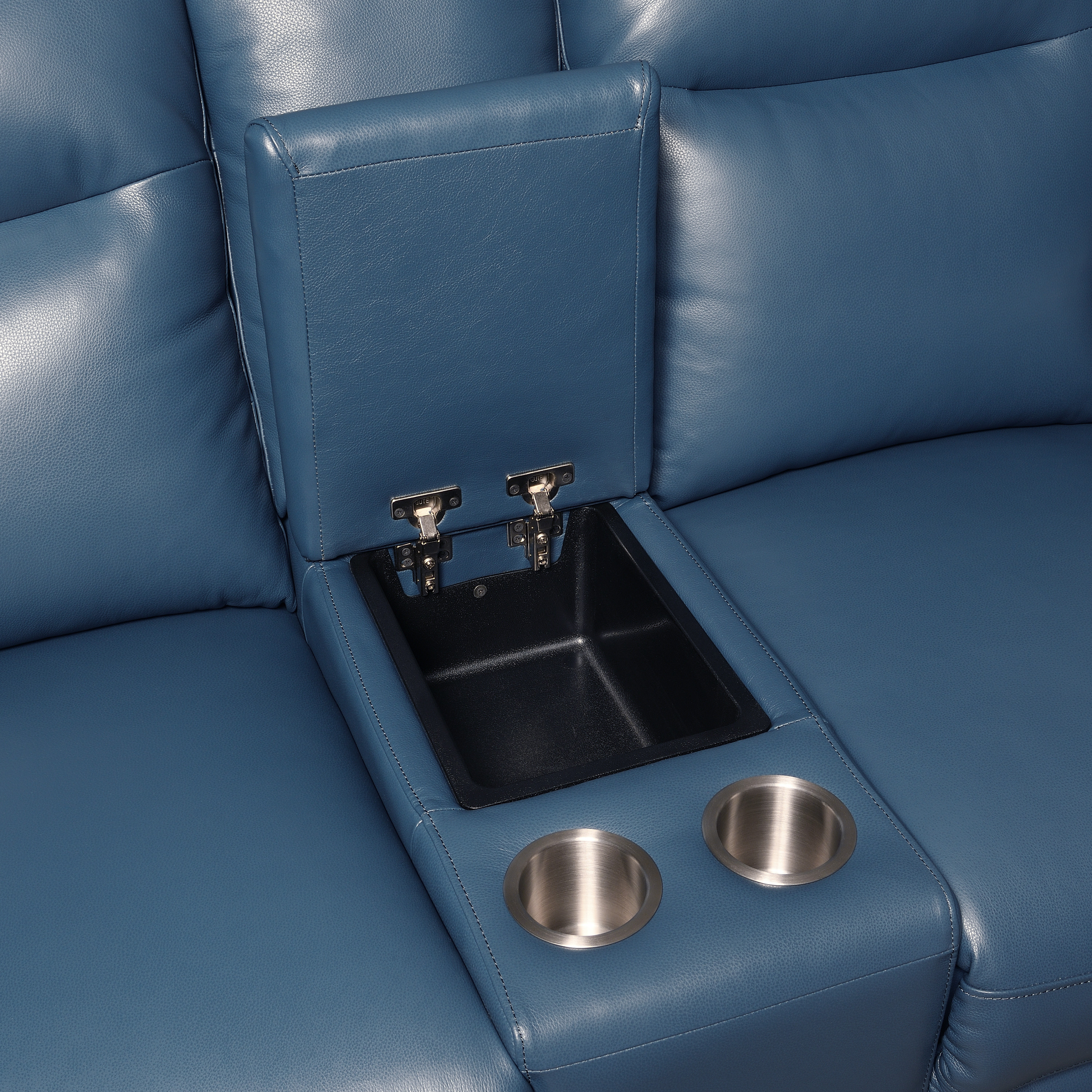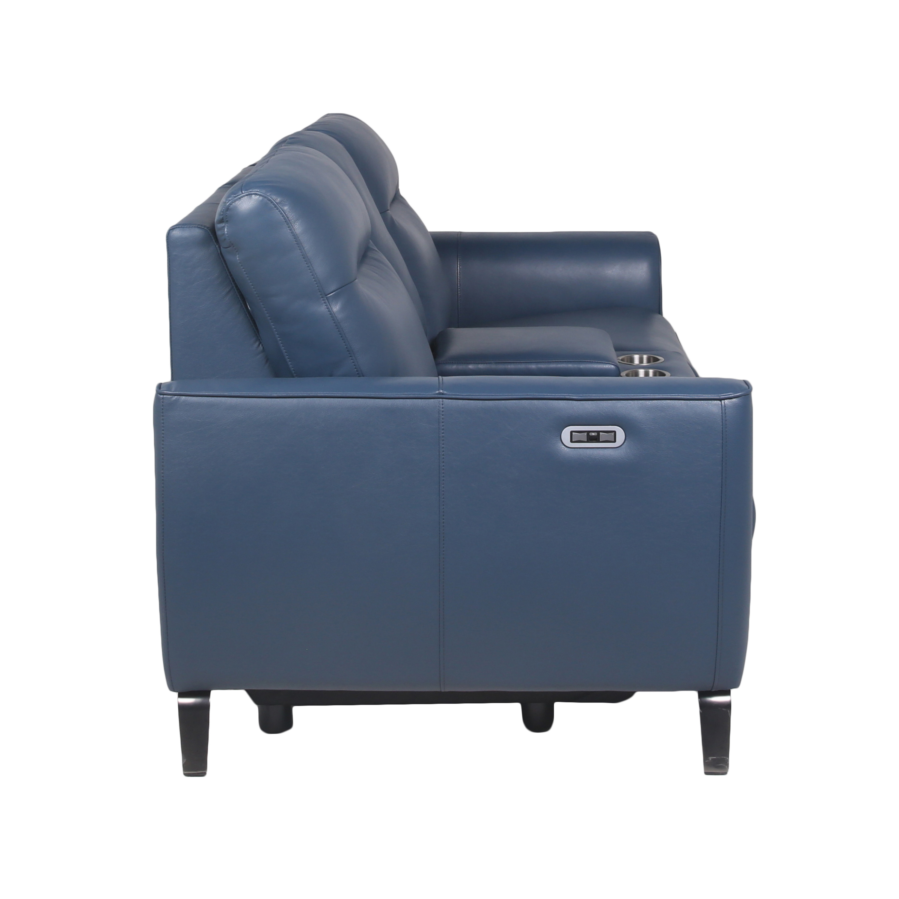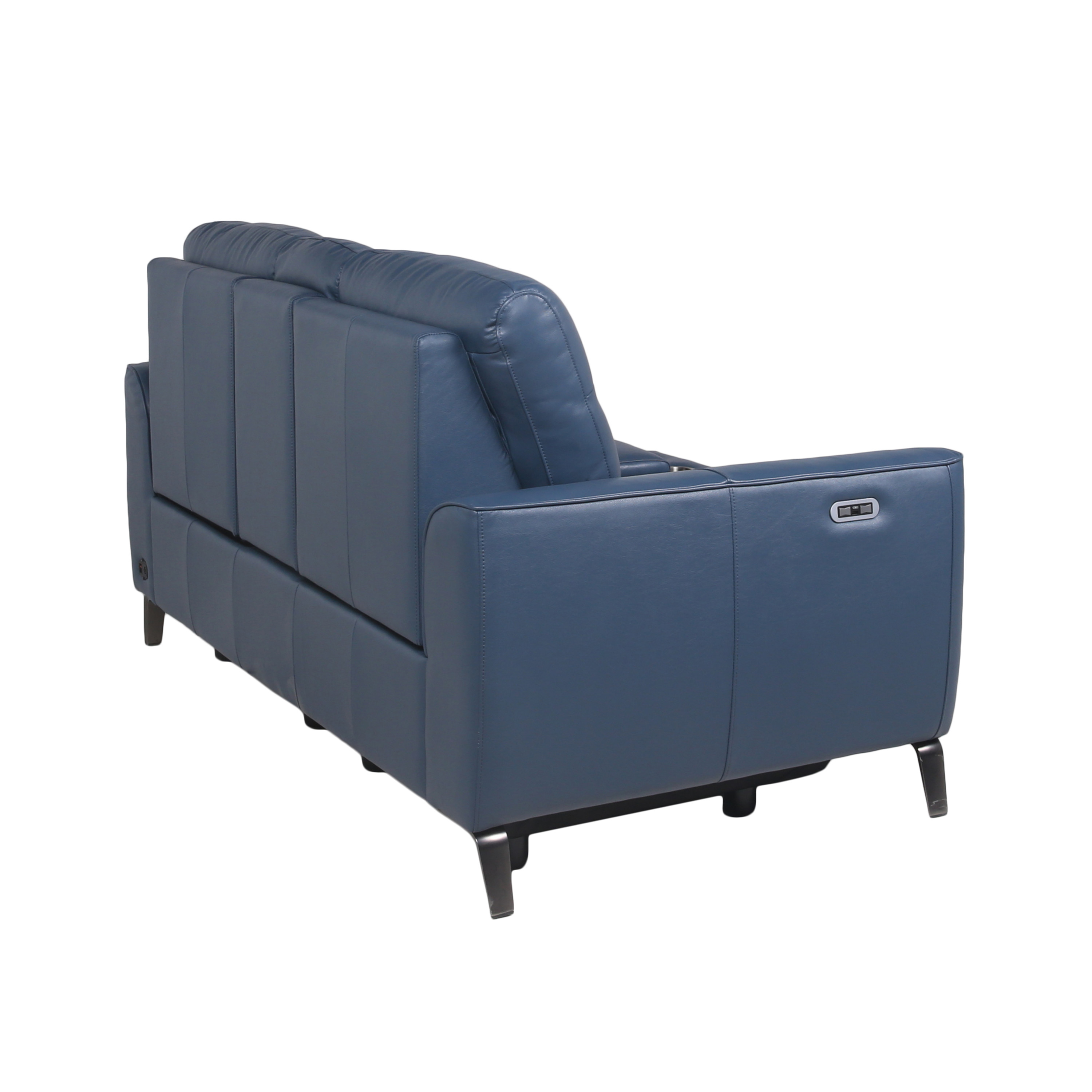 DimensionsCarton Dimensions L 74 x W 41 x H 34 Features-Top Grain Leather on all front surfaces, leatherette on sides and back-Dual-Power Reclining Console Loveseat features a dual-power footrest and power articulating headrest-Fashionable high leg silhouette has a stowaway dual-hinge footrest-The outer arm control panel has a USB recharging port, a control for the power footrest, a control for the power headrest and a home button that returns the headrest and footrest to the original closed position Product DescriptionExperience the perfect combination of functionality and style with this Console Loveseat. It offers all the features you demand from a recliner without compromising on aesthetics. Covered in luxurious top-grain leather, this high-leg Console Loveseat boasts a dual-hinge footrest that cleverly stows away under the Loveseat when not in use, giving it the look of a stationary piece. The dual-power unit includes a power footrest and power headrest, ensuring optimal comfort. Covered in Ocean Blue top-grain leather on all touchable surfaces and accentuated by a flared chrome leg, this Console Loveseat adds a dash of panache to your living space.