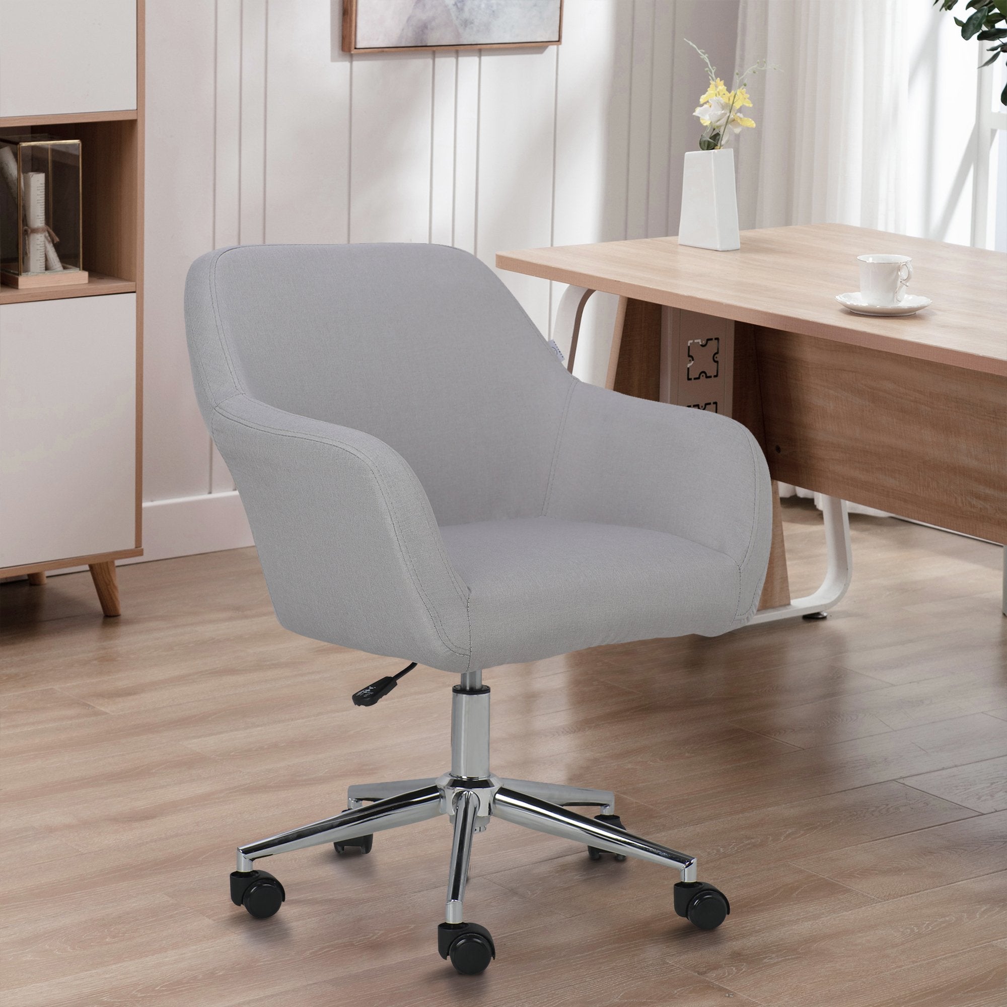 Completely upholstered in an attractive woven fabric, this task chair with optional wheels offers both comfort and style for the home or office. It features a unique and contemporary seat shape with sloped arms for a modern look. Classic and professional-looking base provides excellent support. It is ideal for use in any office setting, workspace, home office or even a game room table. The chair is easily assembled with minimal effort.