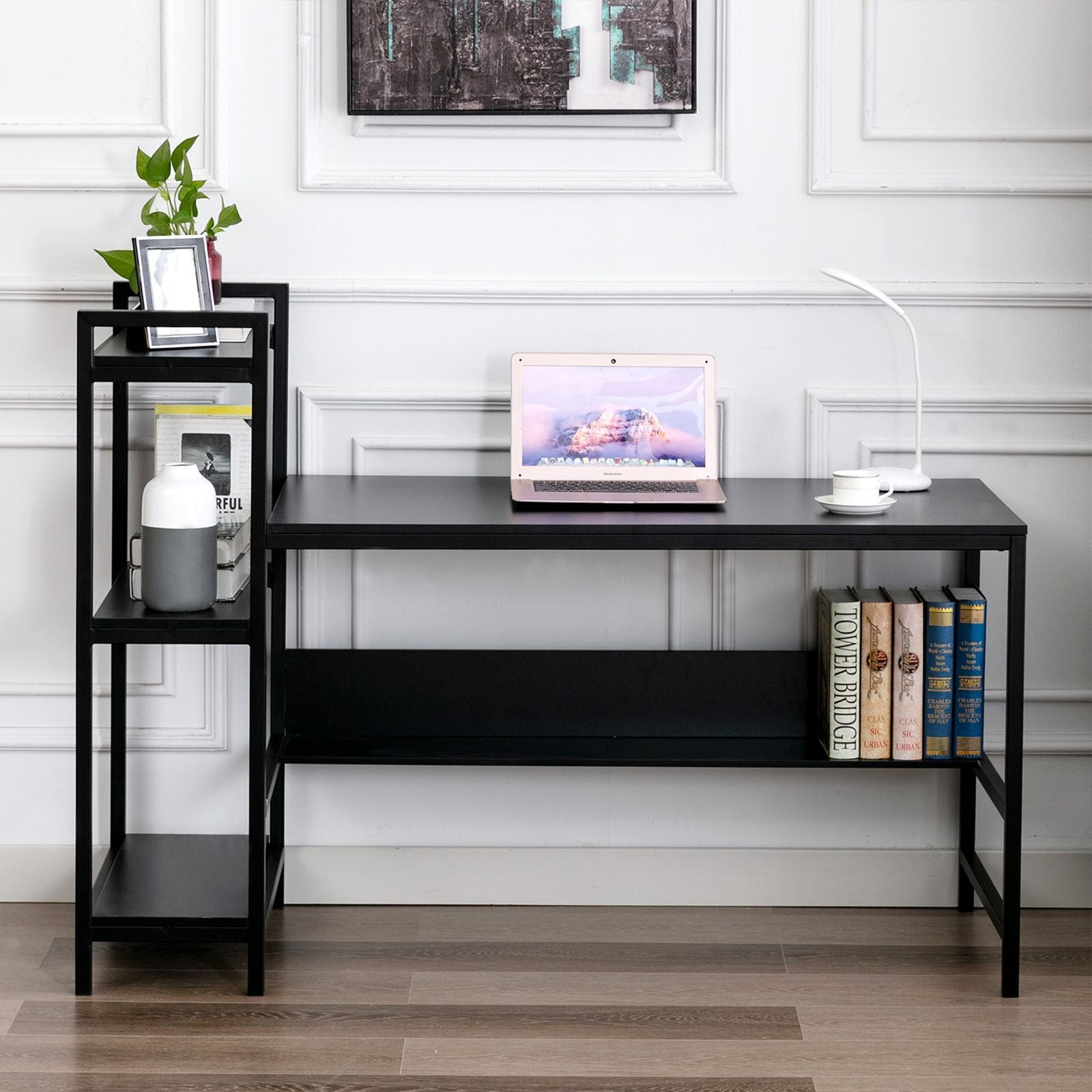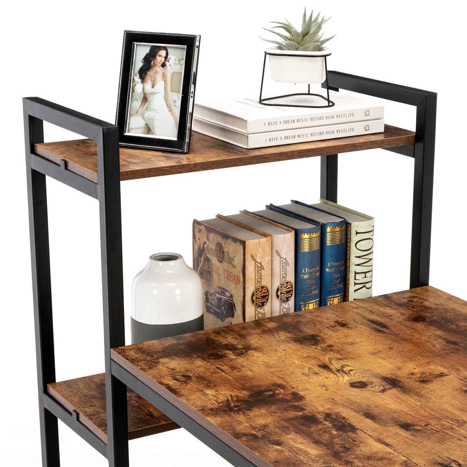 - Good Storage bookshelf: This computer desk features a large desktop and 4 tier shelves. You can hold your family photos, small plants, books, magazines on these shelves, which provide a relaxing time for you when you tired at work.