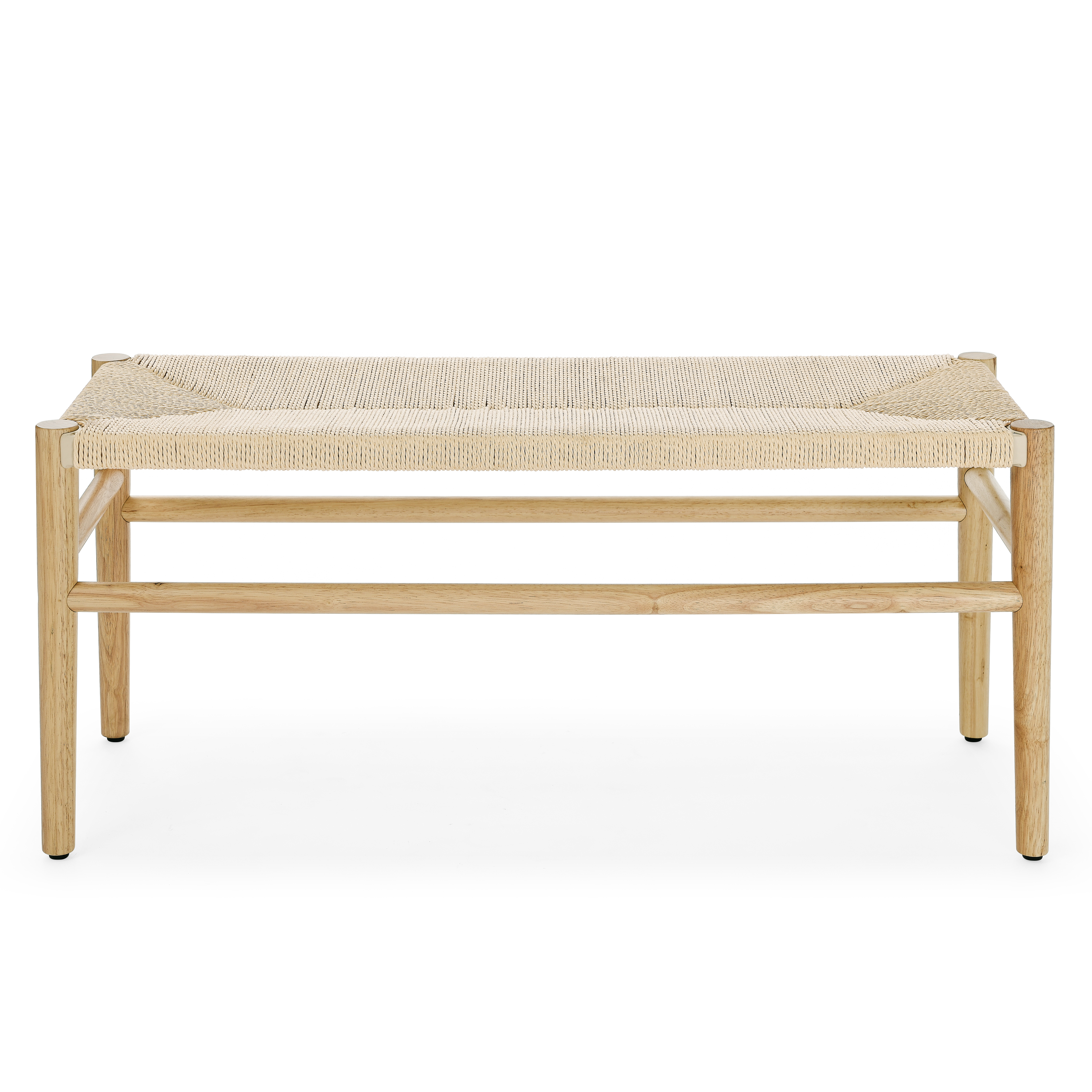 This bench is made with rubberwood. Featuring a long-lasting basket weave rope pattern, this style is not only incredibly durable but also provides a versatile appearance. Suitable for living room, bedroom and porch. The simple design makes it more atmospheric. It can well match your space design.