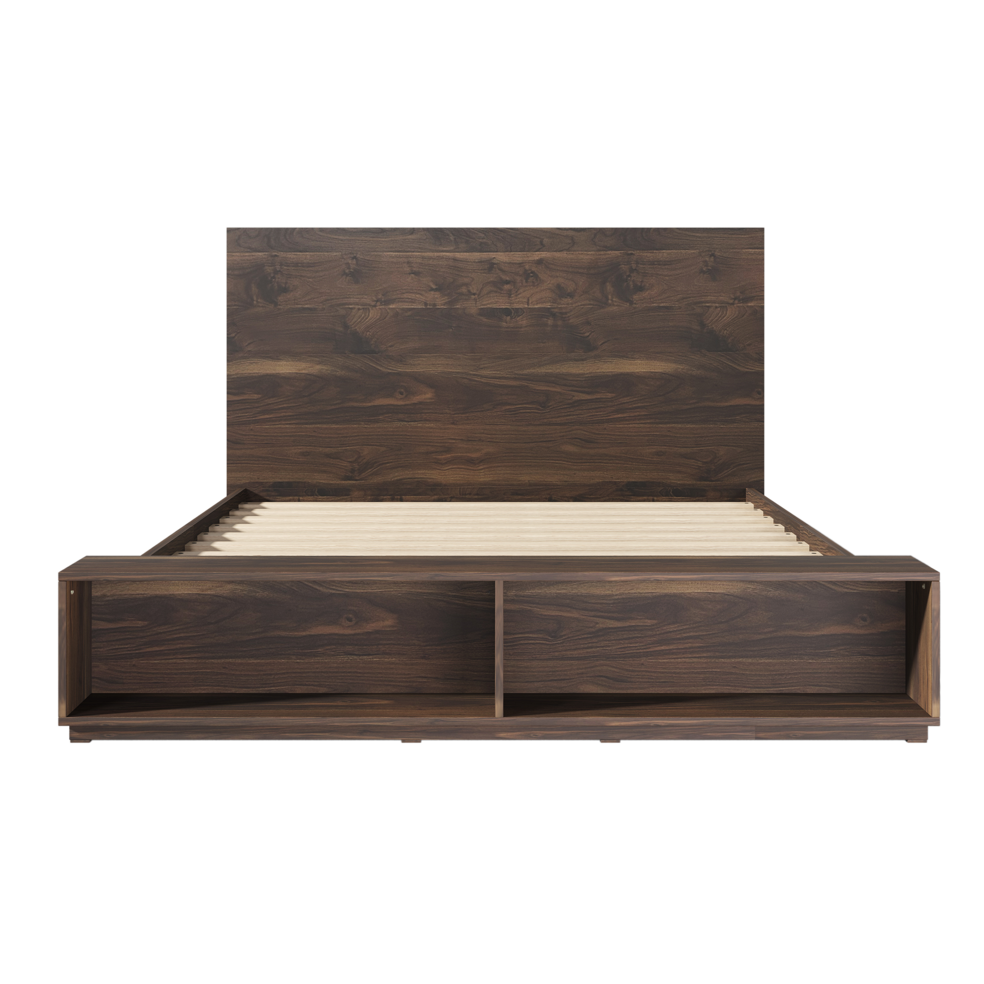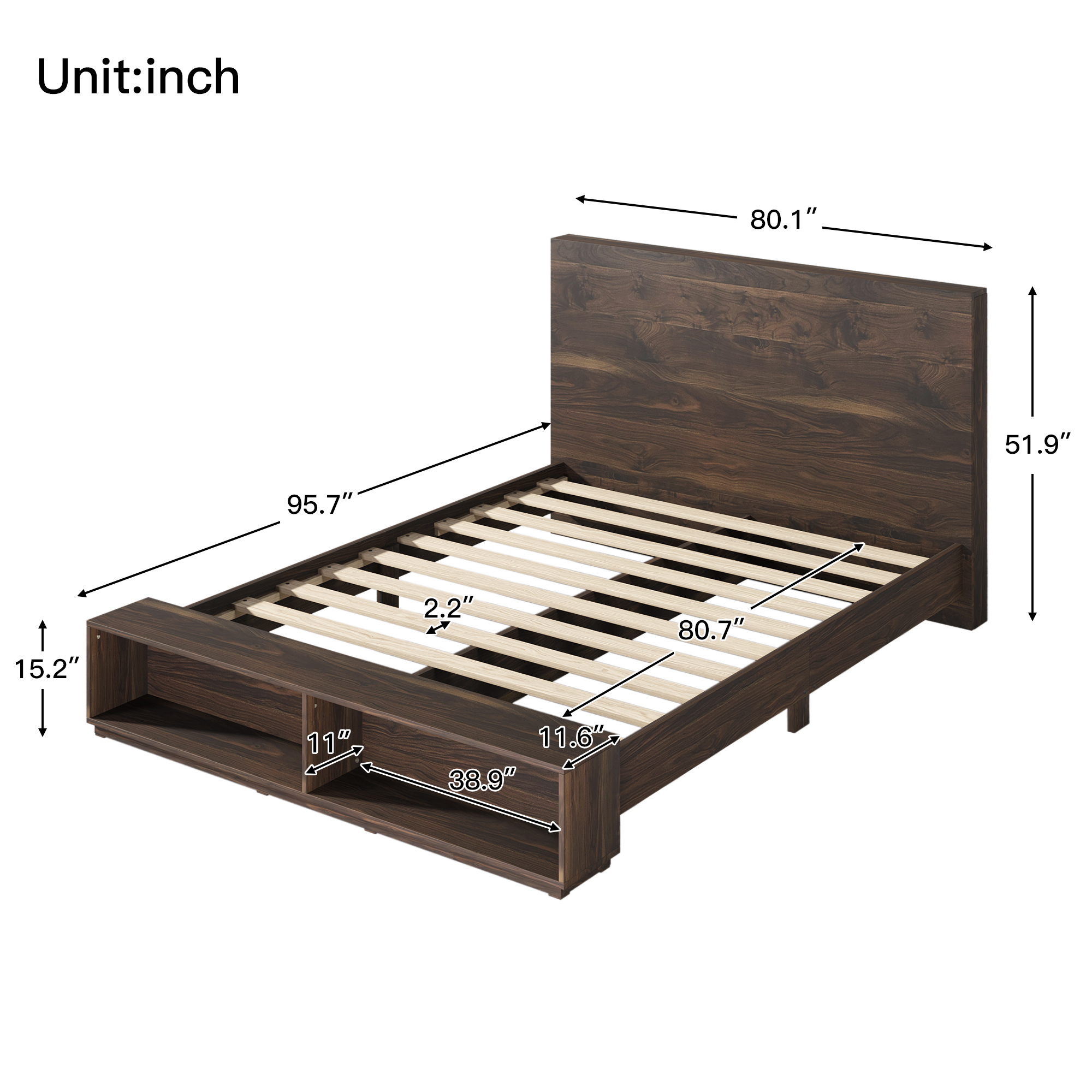 Create an atmosphere of natural warmth with the bed. Fitted with two spacious shelves at the footboard, the bed adds convenience to tight spaces. This wood bed is made in Malaysia and includes a paneled headboard, giving the piece a fantastic rustic charm. Assembly is required and a box spring isn’t necessary, as the bed comes with internal slats for mattress support. Sharp craftsmanship and ash walnut brown finished wood give the item a strong yet relaxed look that enhances any bedroom. Features:1. Makes a stylish and functional addition to your bedroom2.The bed is made of Superior MDF board, which is durable and easy to clean.3.A wood bench fitted with two shelves lines the front of the frame, perfect for showcasing books or decorations. 4.Its classic color is easy to integrate with your furniture and bring comfortable visual experience for your home.5.Assembly is required and a box spring isn’t necessary, as the bed comes with internal slats for mattress support.