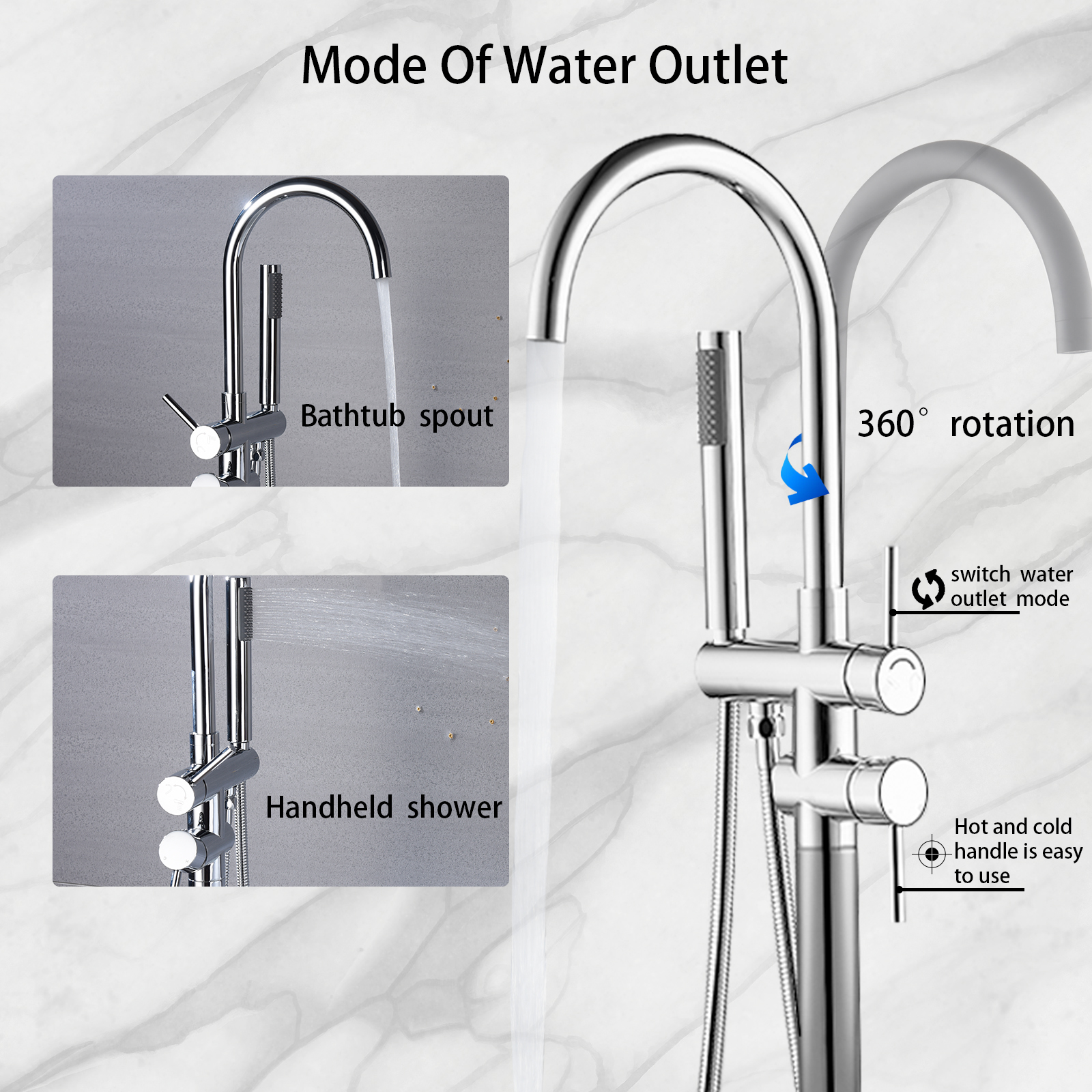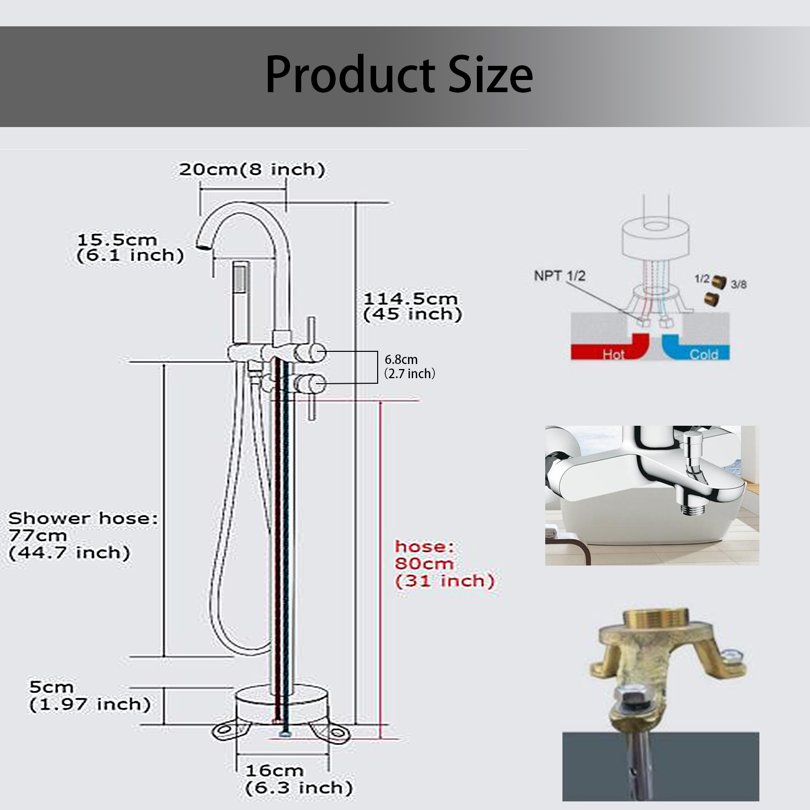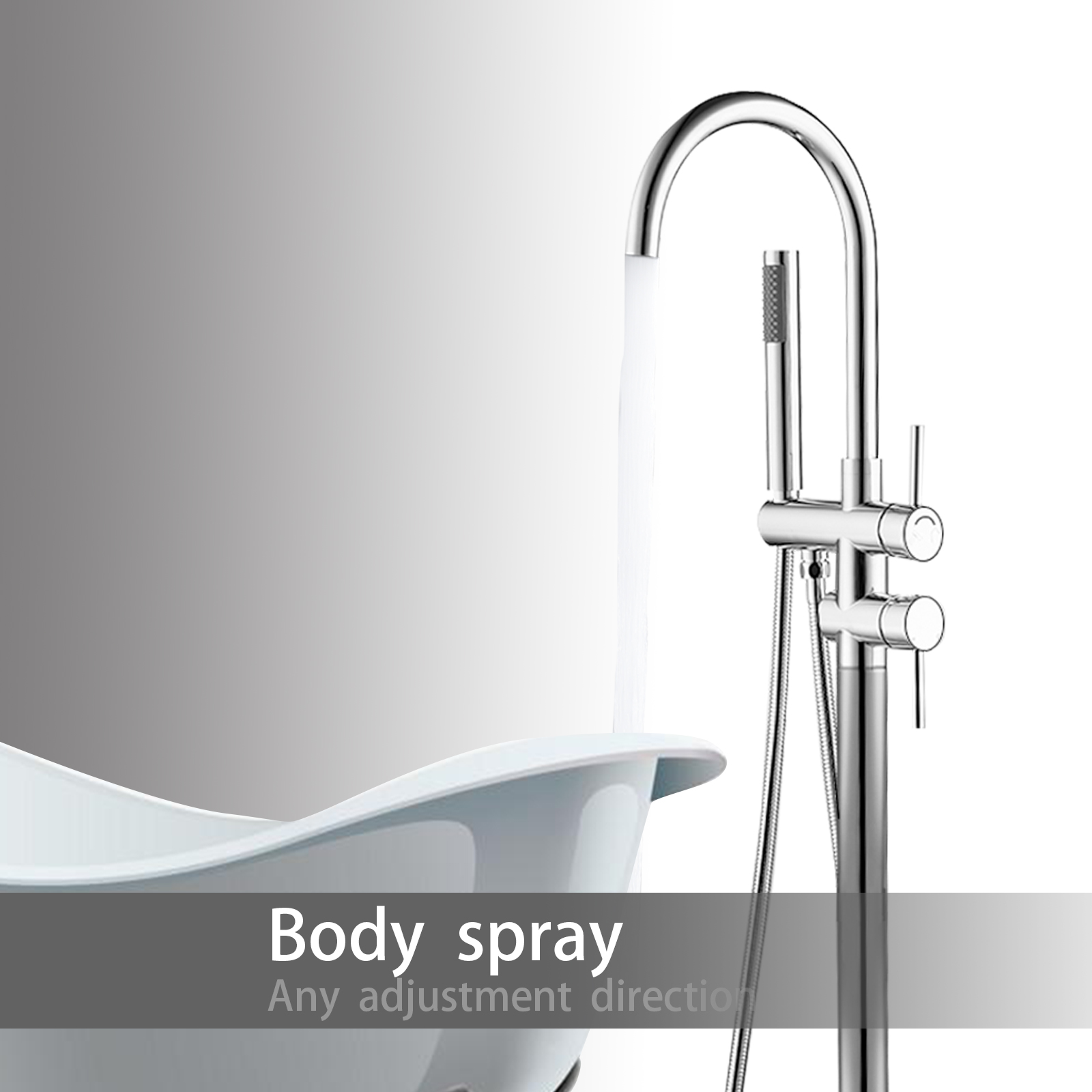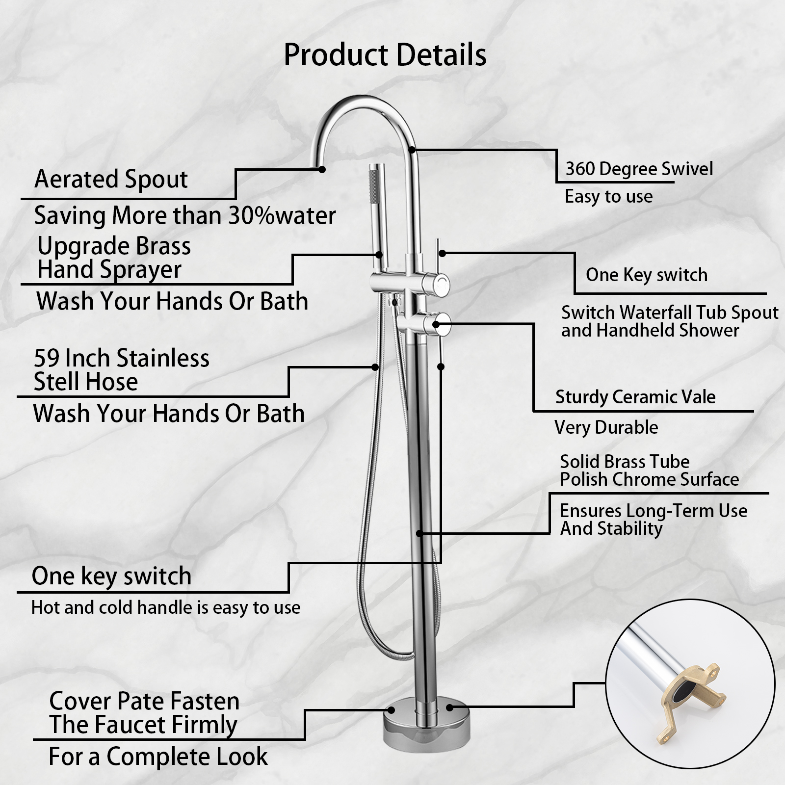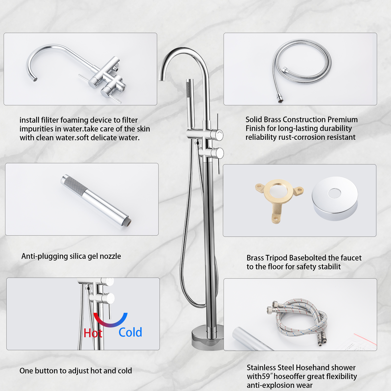 Product introduction:All-metal structure: made of high-quality solid copper, with corrosion resistance and rust resistance, durability and reliability.Function: Dual function. 30-degree rotating nozzle and handheld shower. Diversion switch between bathtub nozzle and hand-held showerInstallation: Floor installation, including all installation hardware.Reliable design: the height from 45inch base to the highest point of the faucet; The 6.1inch spout extends into the sink, and the stainless steel hose is connected to the shower, which is helpful for washing the bathtub or washing it after bathing, and is very convenient for cleaning.