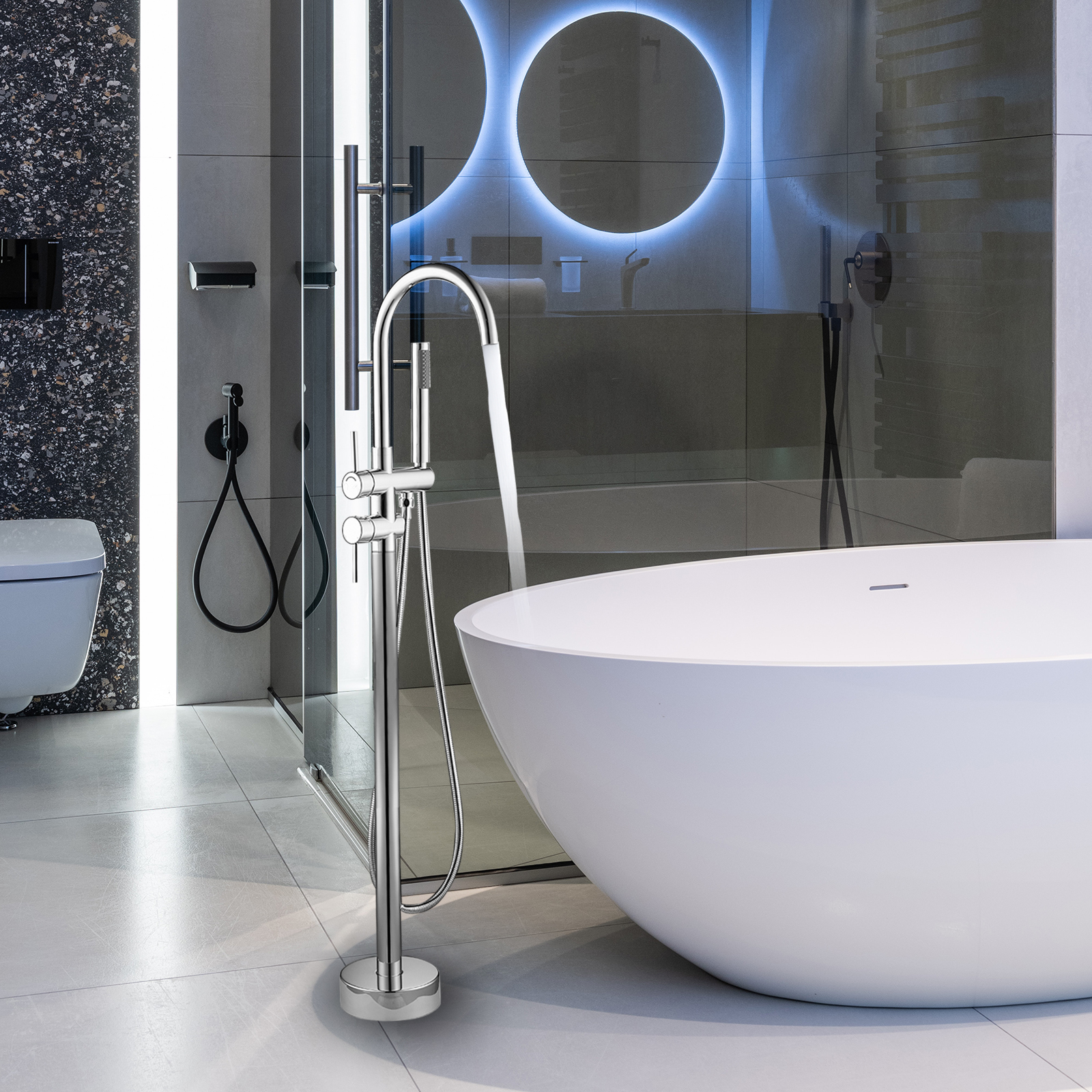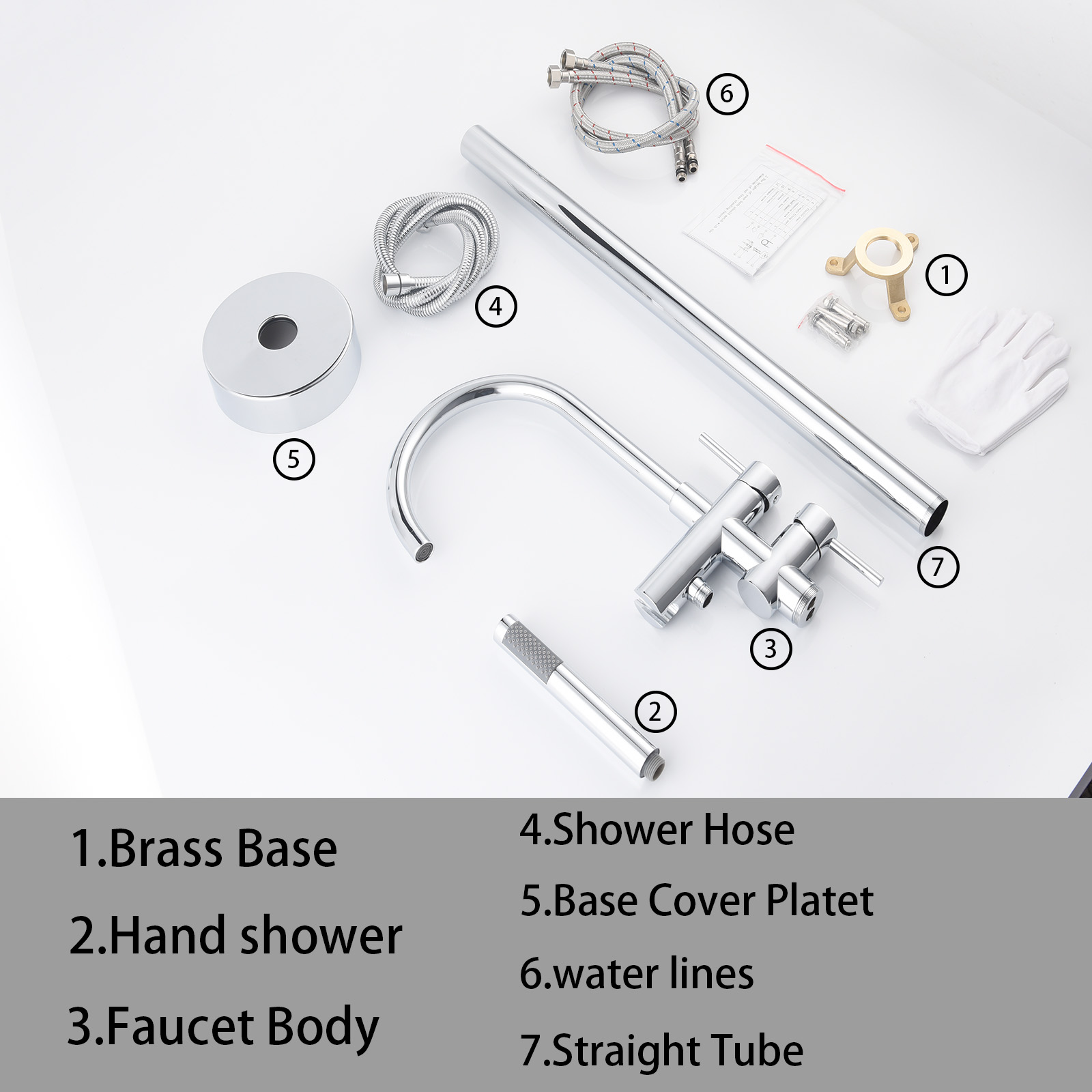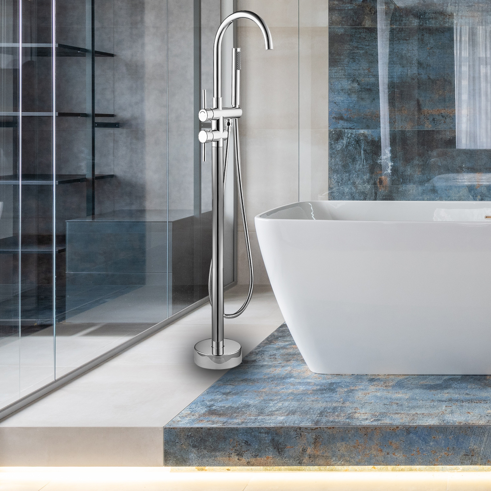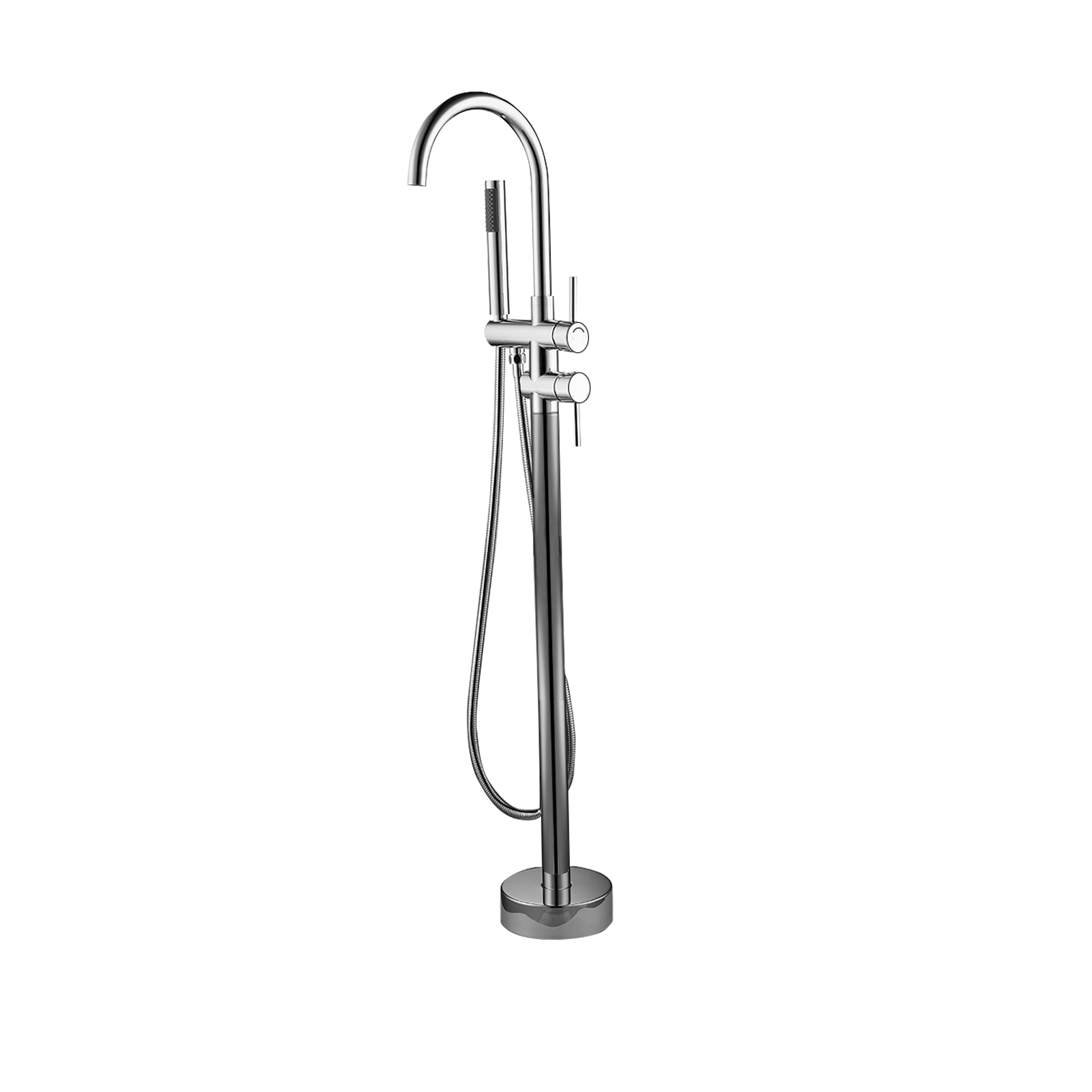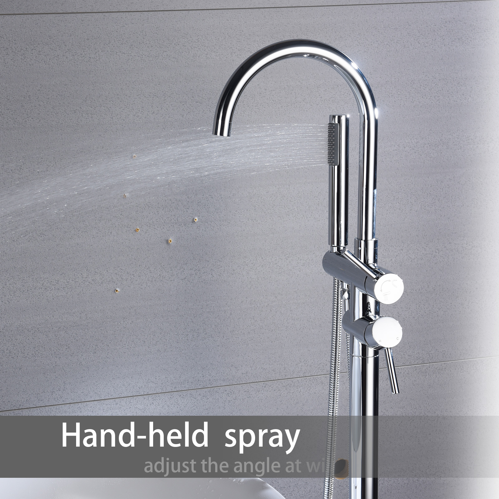 Product introduction:All-metal structure: made of high-quality solid copper, with corrosion resistance and rust resistance, durability and reliability.Function: Dual function. 30-degree rotating nozzle and handheld shower. Diversion switch between bathtub nozzle and hand-held showerInstallation: Floor installation, including all installation hardware.Reliable design: the height from 45inch base to the highest point of the faucet; The 6.1inch spout extends into the sink, and the stainless steel hose is connected to the shower, which is helpful for washing the bathtub or washing it after bathing, and is very convenient for cleaning.