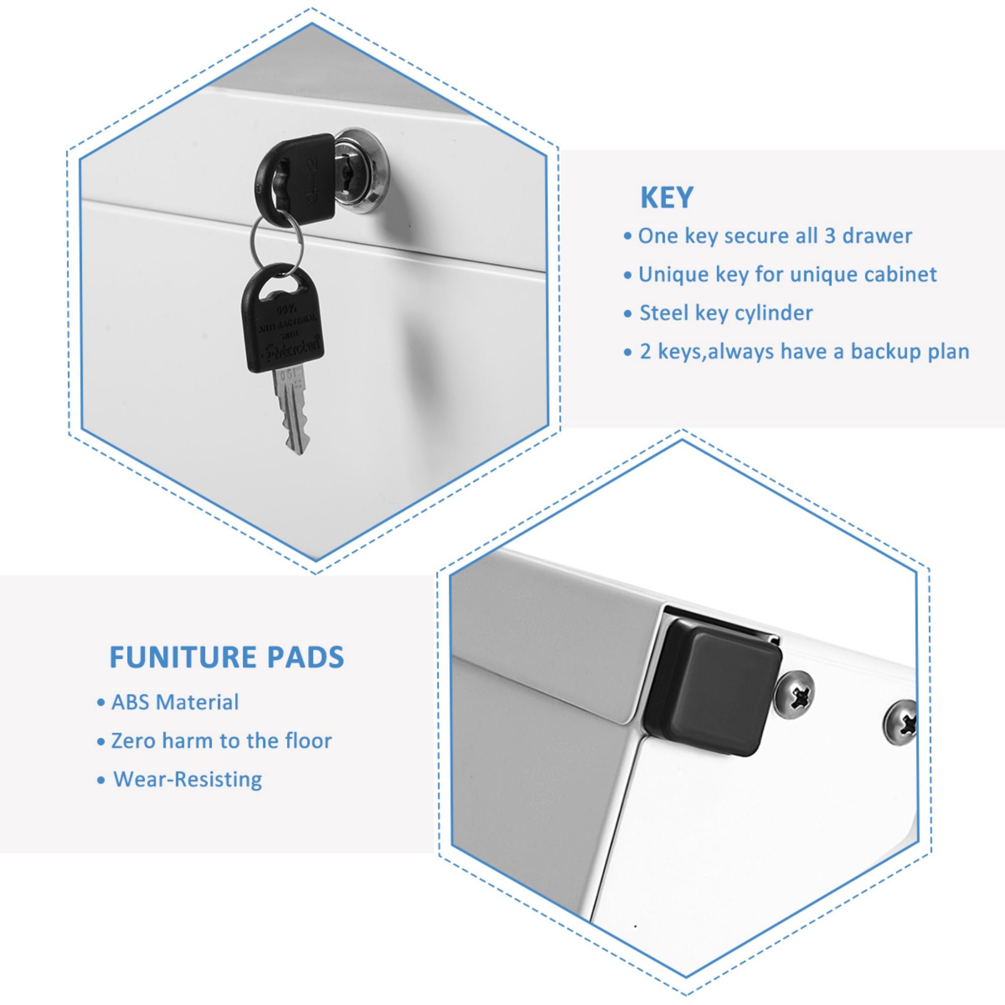 Electrostatic spraying and high-standard welding to ensure the durability and the Smoothness. Can prevent rust. 2 keys are included, lock secures all 3 drawers. When one drawer had be open, interlocking drawer system prevent another drawer from opening, thus can prevent tipping. If you want to open two drawers at the same time, need pull the two drawers together, but please don't do that.