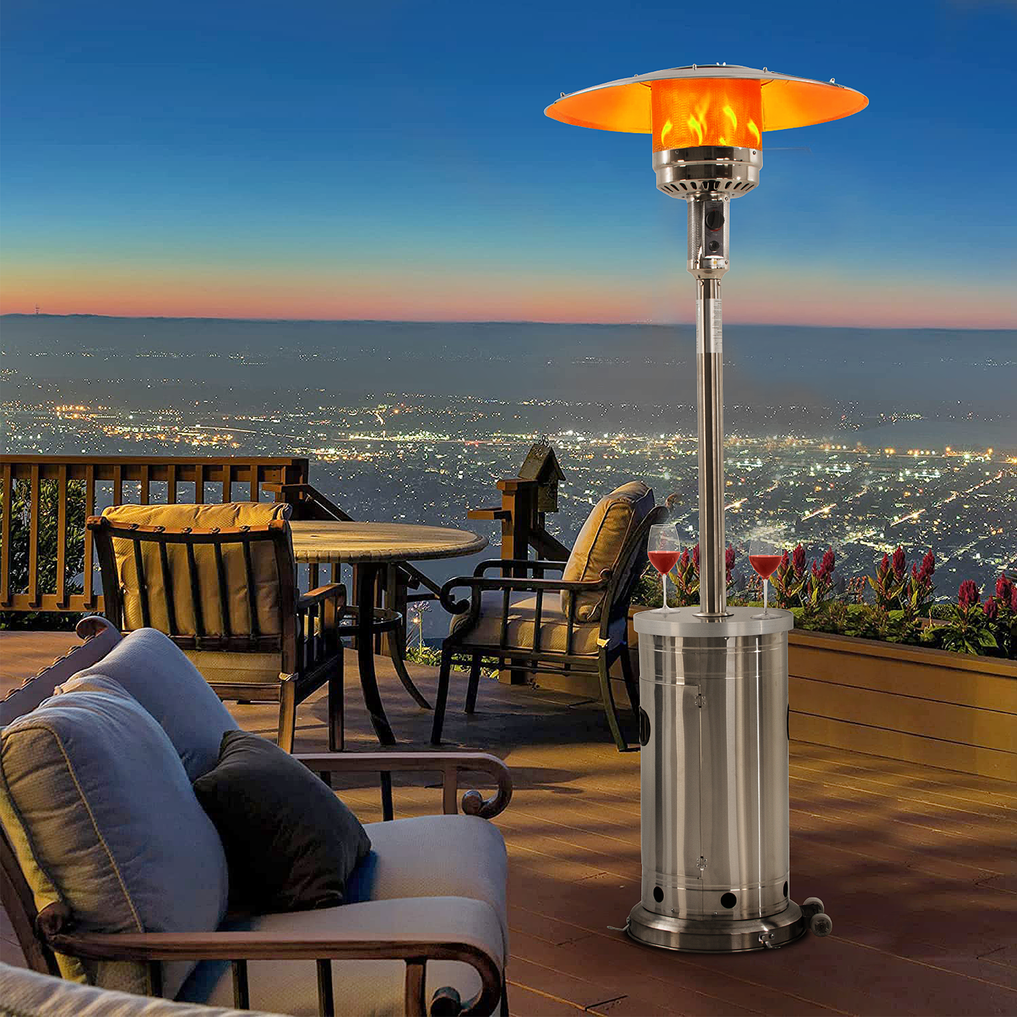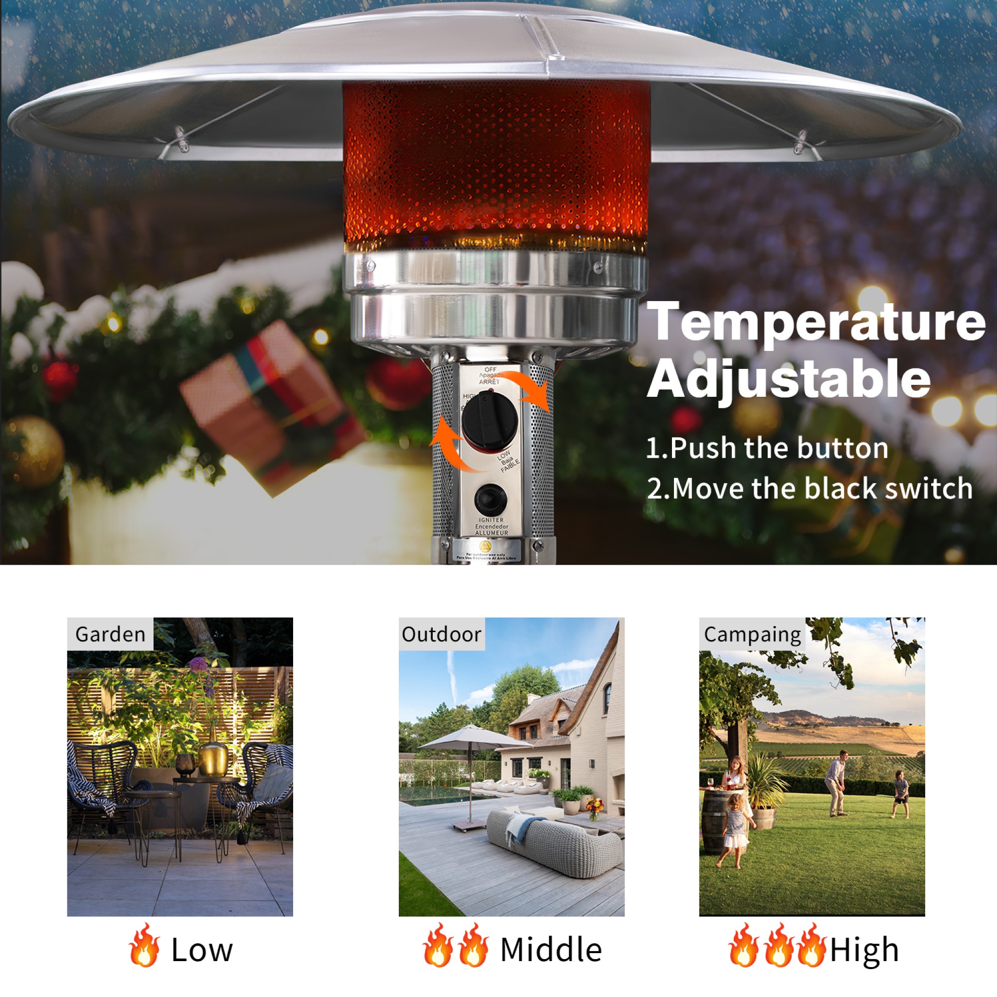 【Rapid Heating & Excellent Warm Range】:The 48000 BTU propane patio heater heats up immediately,quickly raise the surrounding temperature in SERVERAL seconds.The aluminum reflector can reflects the infrared rays generated by combustion to the aIr. It can radiate within 10 feet in diameter, and the usable area is 81 to 100 square feet.