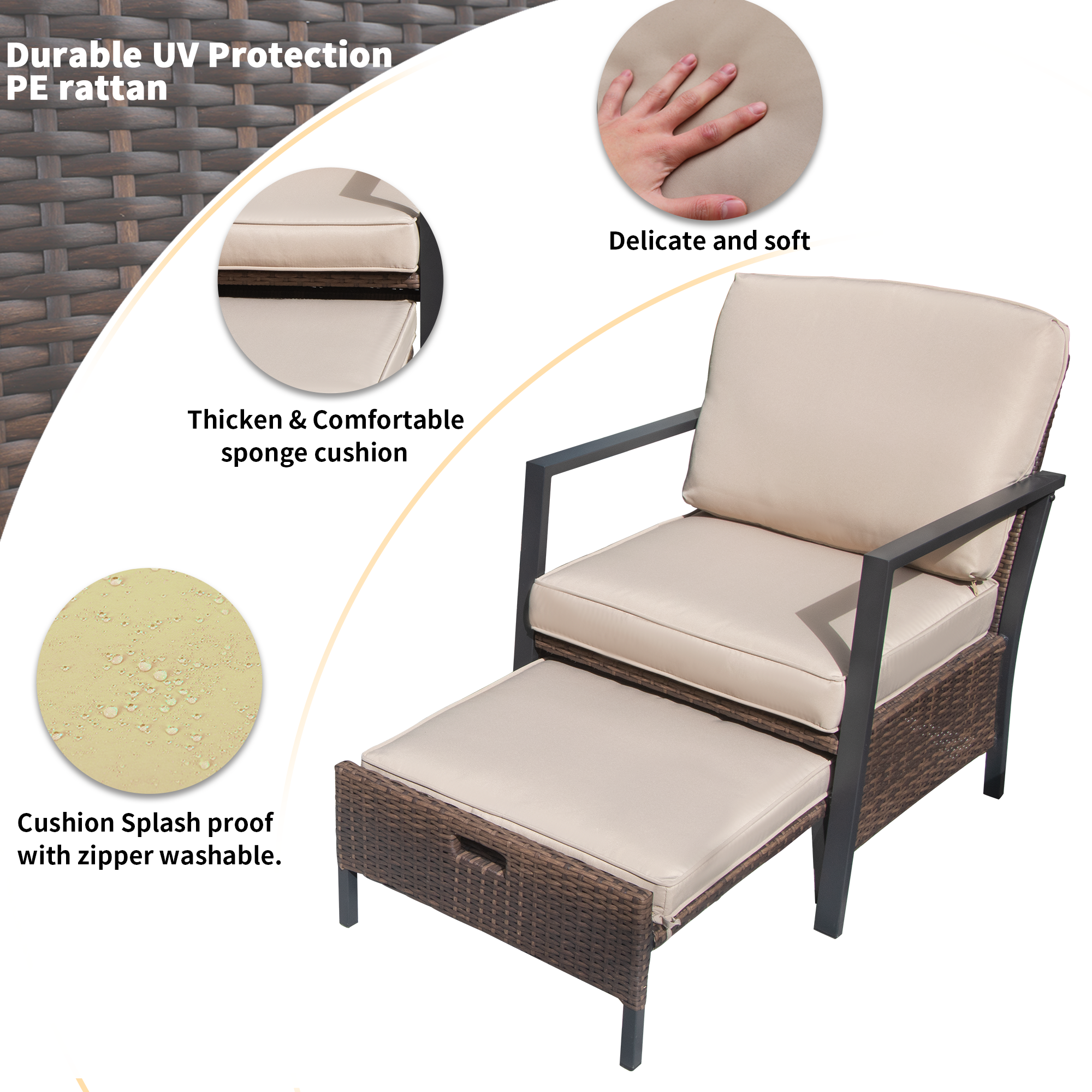 Sturdy and durable:This comfortable set is constructed from rust-resistant steel frame and PE rattan wicker,which is durable and weather-resistant. Each chair can load capacity of 264lbs and the ottoman can bear 220lbs.