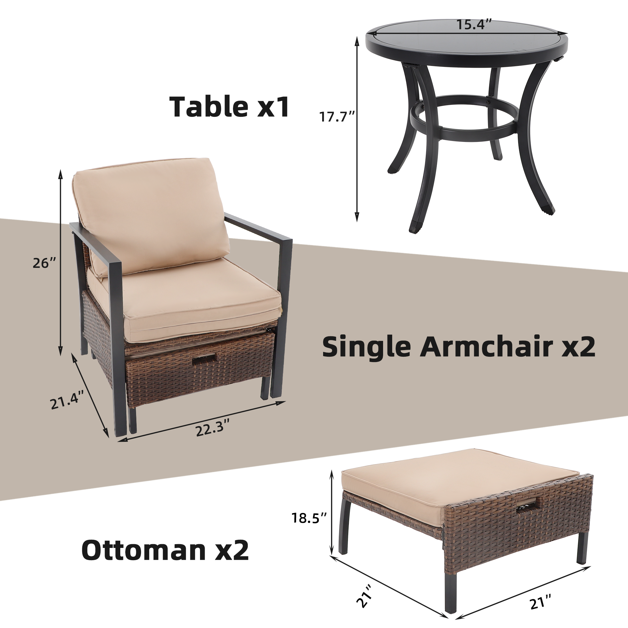 Demension size:Single chairs-22.3"Lx 21.4"W x 26"H;ottomans-21"Lx 21"W x 18.5"H;side coffee table-φ15.4"x17.7"H