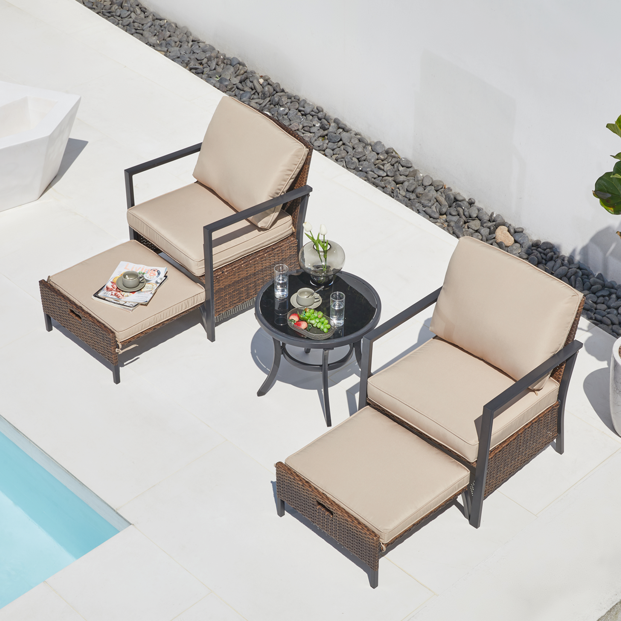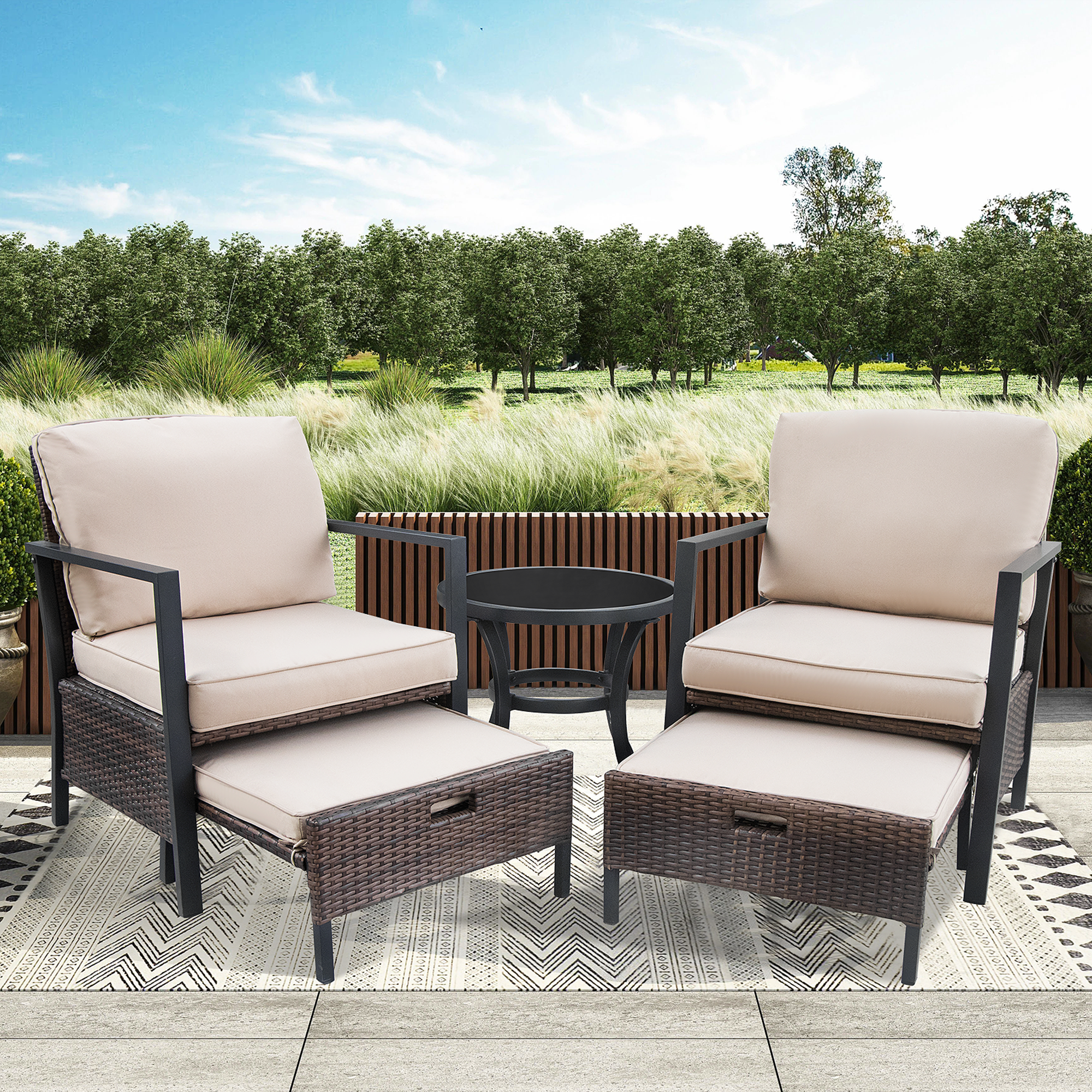 Fit for small space:Our 5pcs patio furniture set includes 2 single chairs,2 ottomans and 1 glass top side table;The ottomans can be stored under the rattan wicker chair,which is perfect for small patio areas.