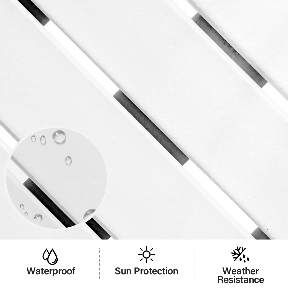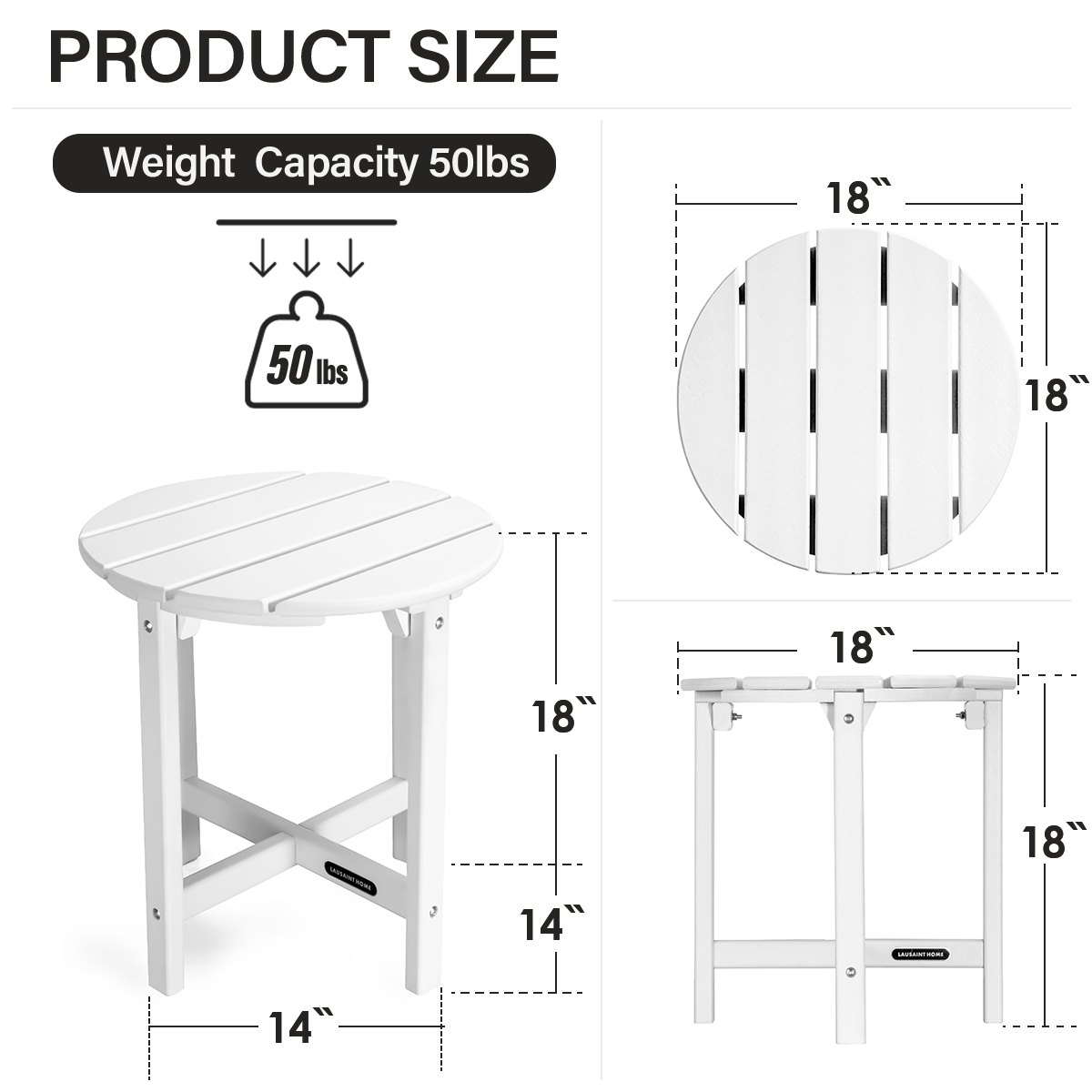 Measures 18 inches wide by 18 inches deep by 18 inches high,weight capacity 50 LBS.Patio side table is just the right size for resting drinks snacks or other small itemsPremium Material:The outdoor side tables are made of the eco-friendly polystyrene material with a textured grain finish and the realistic wood-like look,which is free of burrs to prevent stabbing of the skinAssembly Required:Only need to tighten screws to splice parts according to the manual included,only needs a few steps to assemble, hassle-free.All the screws and nuts are made of high-strength stainless steel,never rustWeather Resistant:Our side table has outstanding durability and strong weather resistance,which can withstand a variety of harsh weather such as heavy rain and hot sunCleans effortlessly with soap and water.Outdoor side table is the perfect companion for adirondack chair, chaise lounge and rocking chair