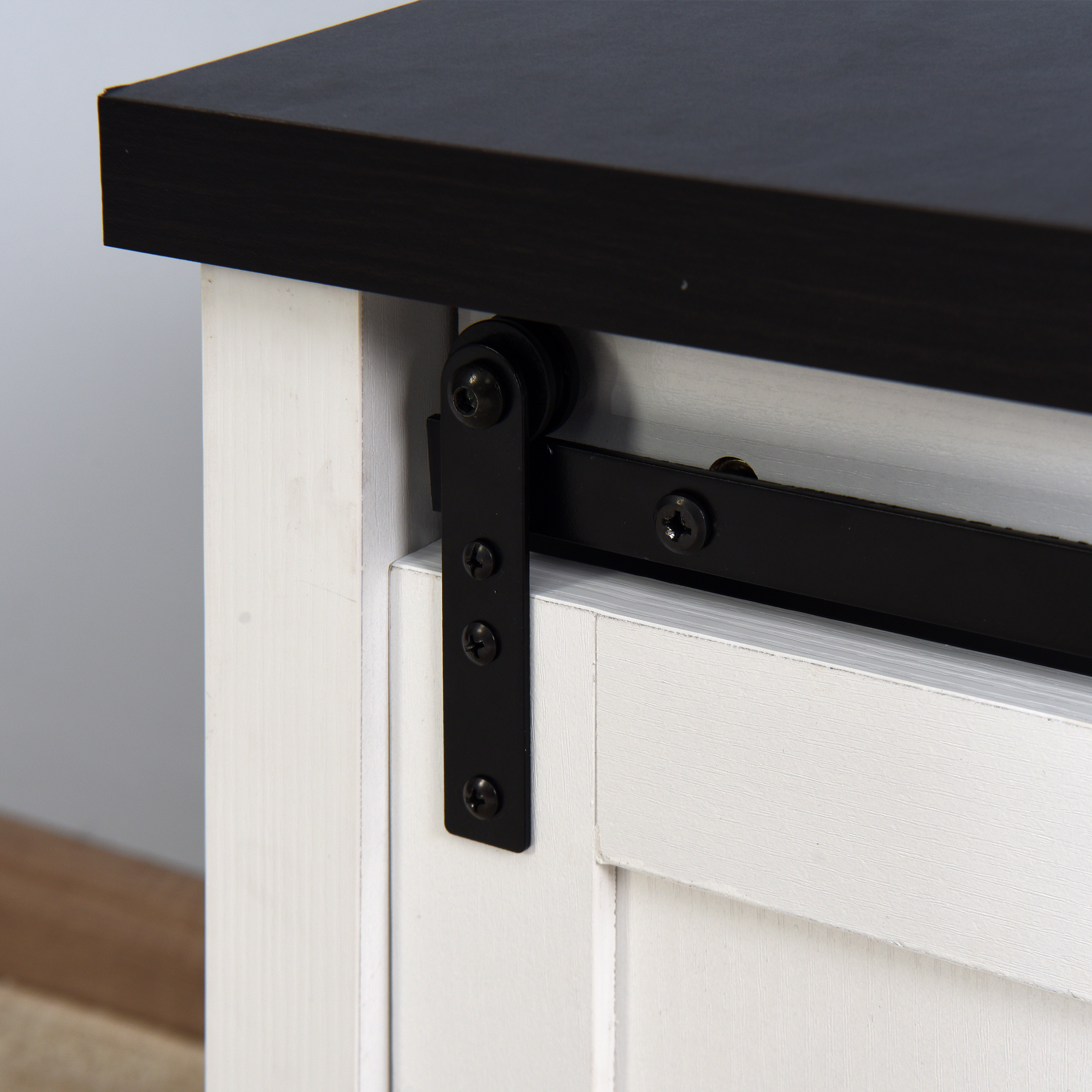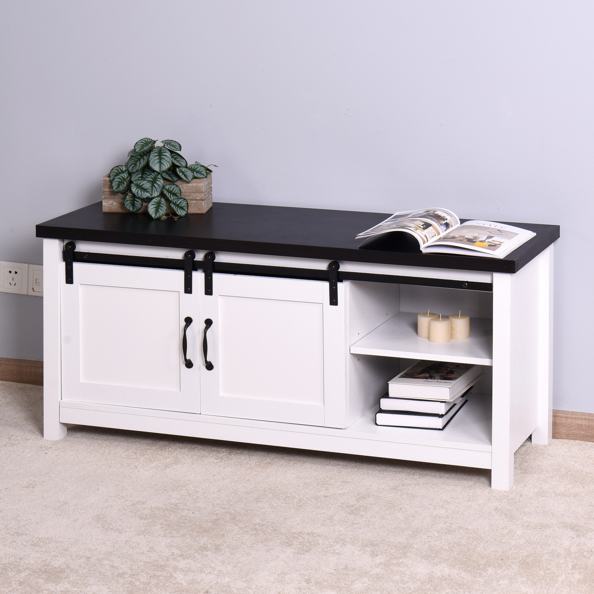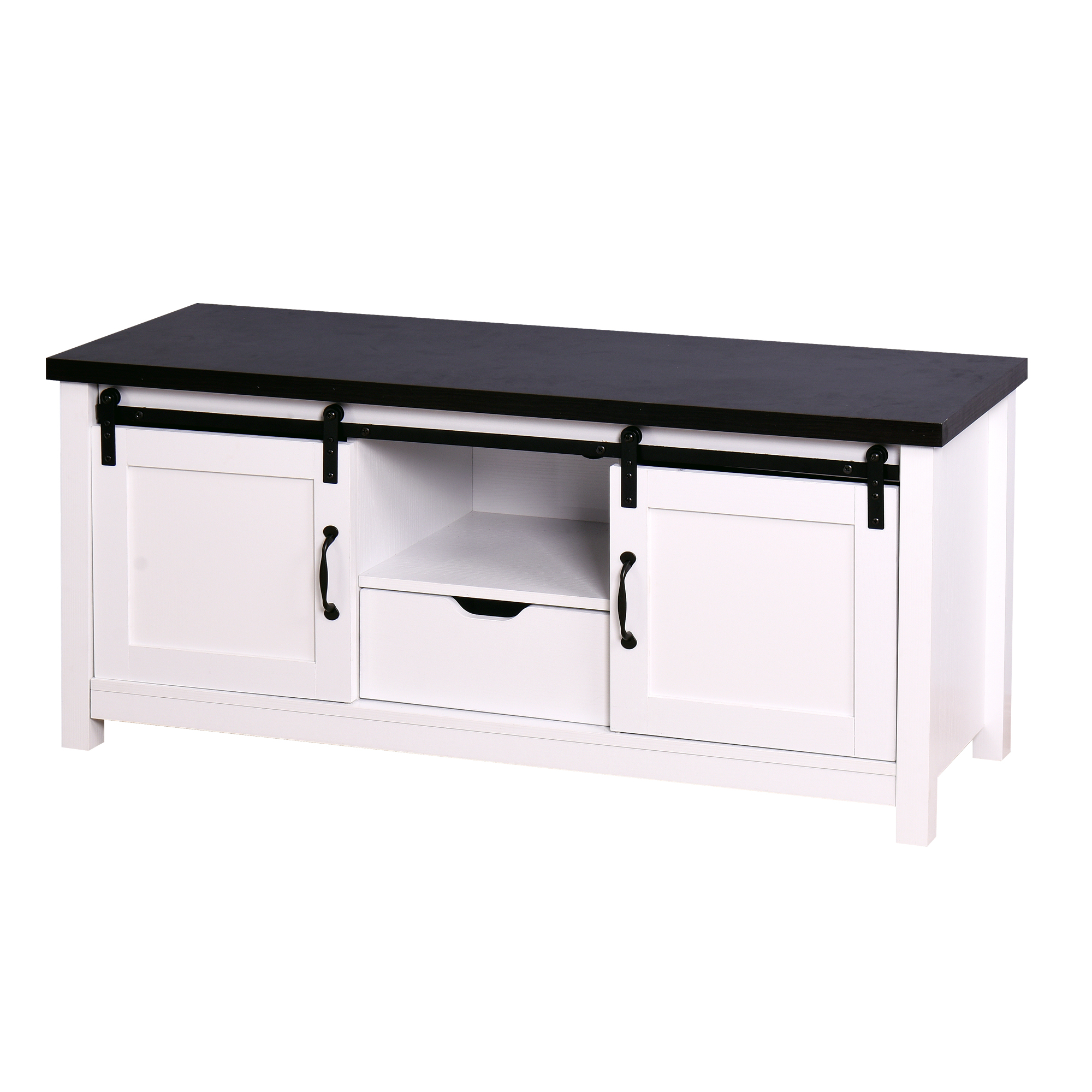 Features: Showcasing a modern and traditional farmhouse style Functional barn door sliding cabinet fronts for added style Includes cord management features in back