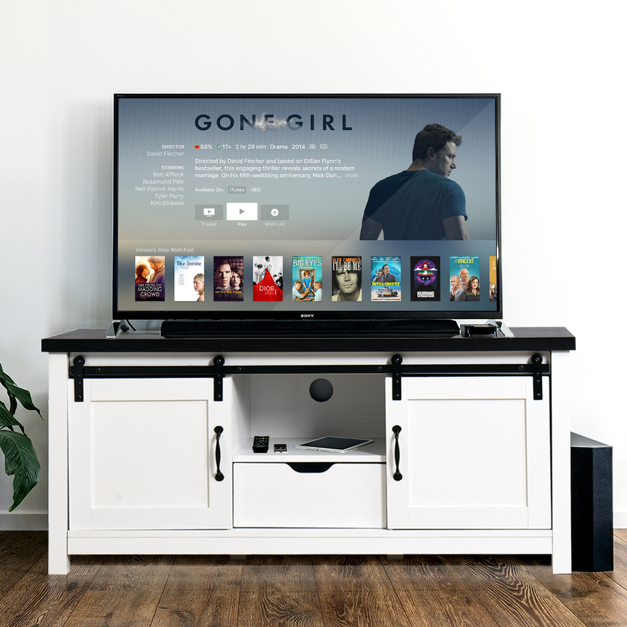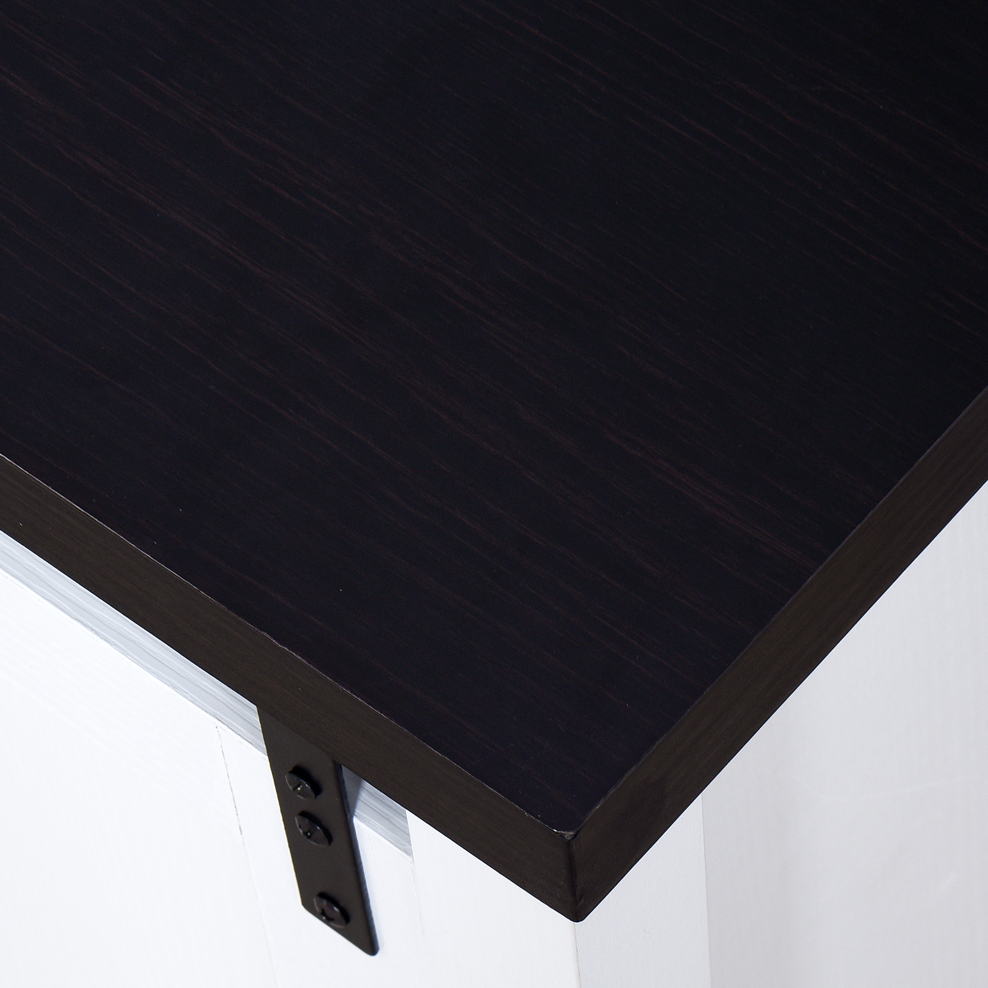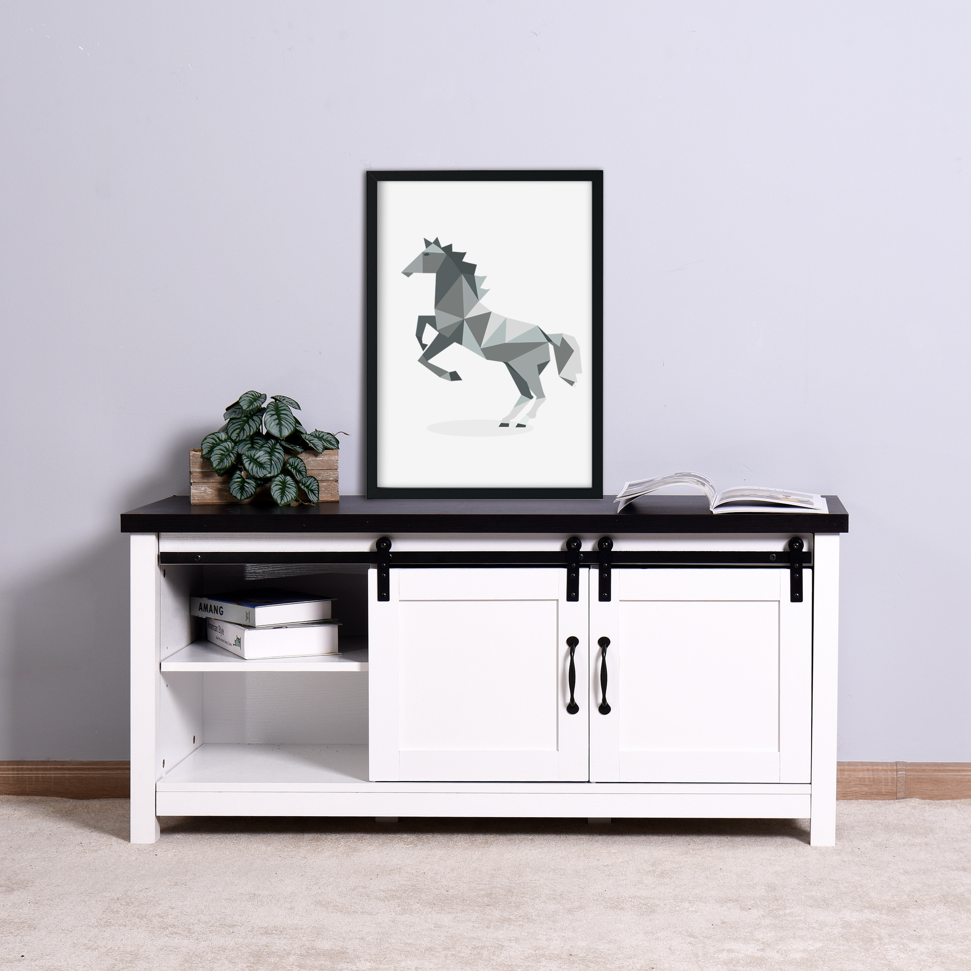 Features: Showcasing a modern and traditional farmhouse style Functional barn door sliding cabinet fronts for added style Includes cord management features in back