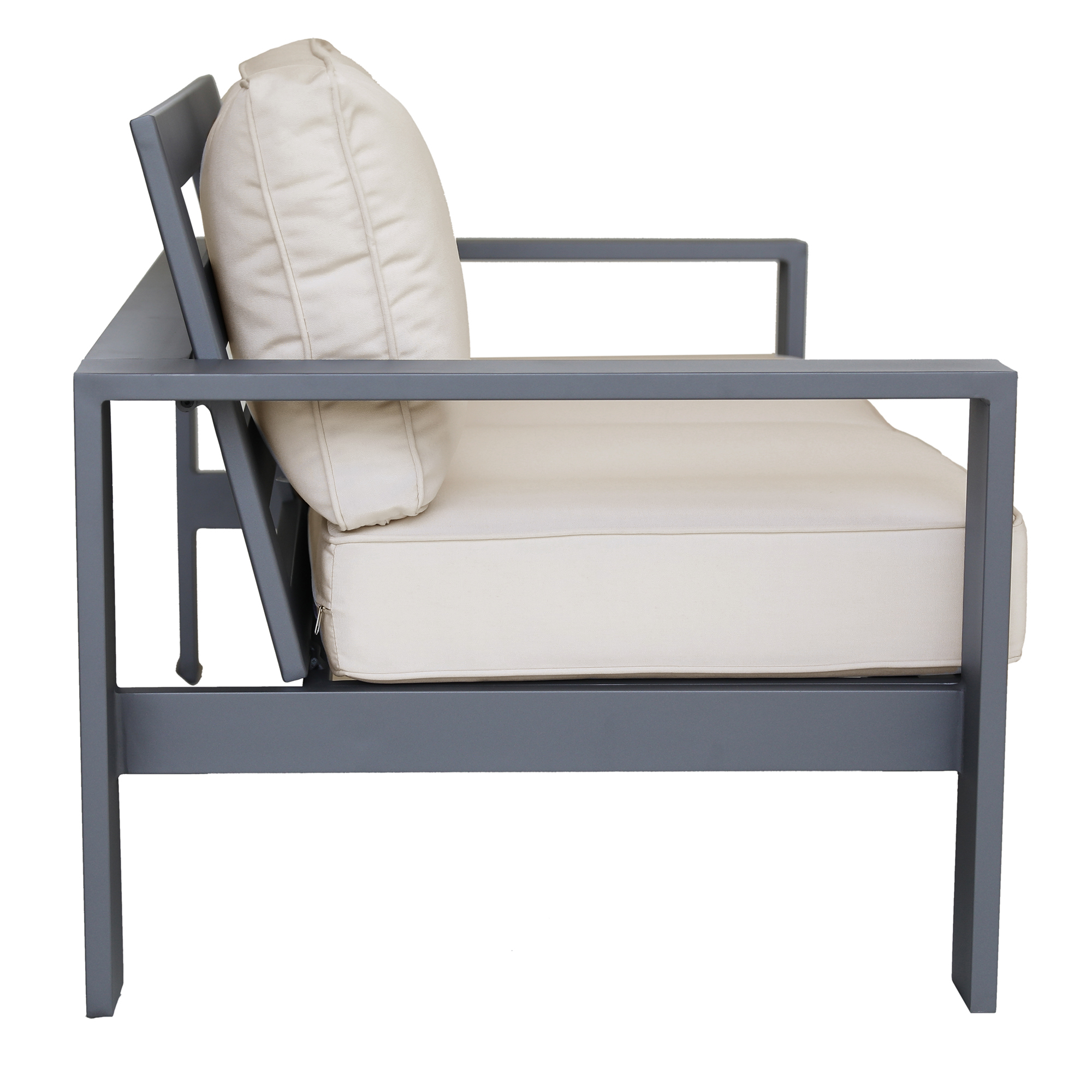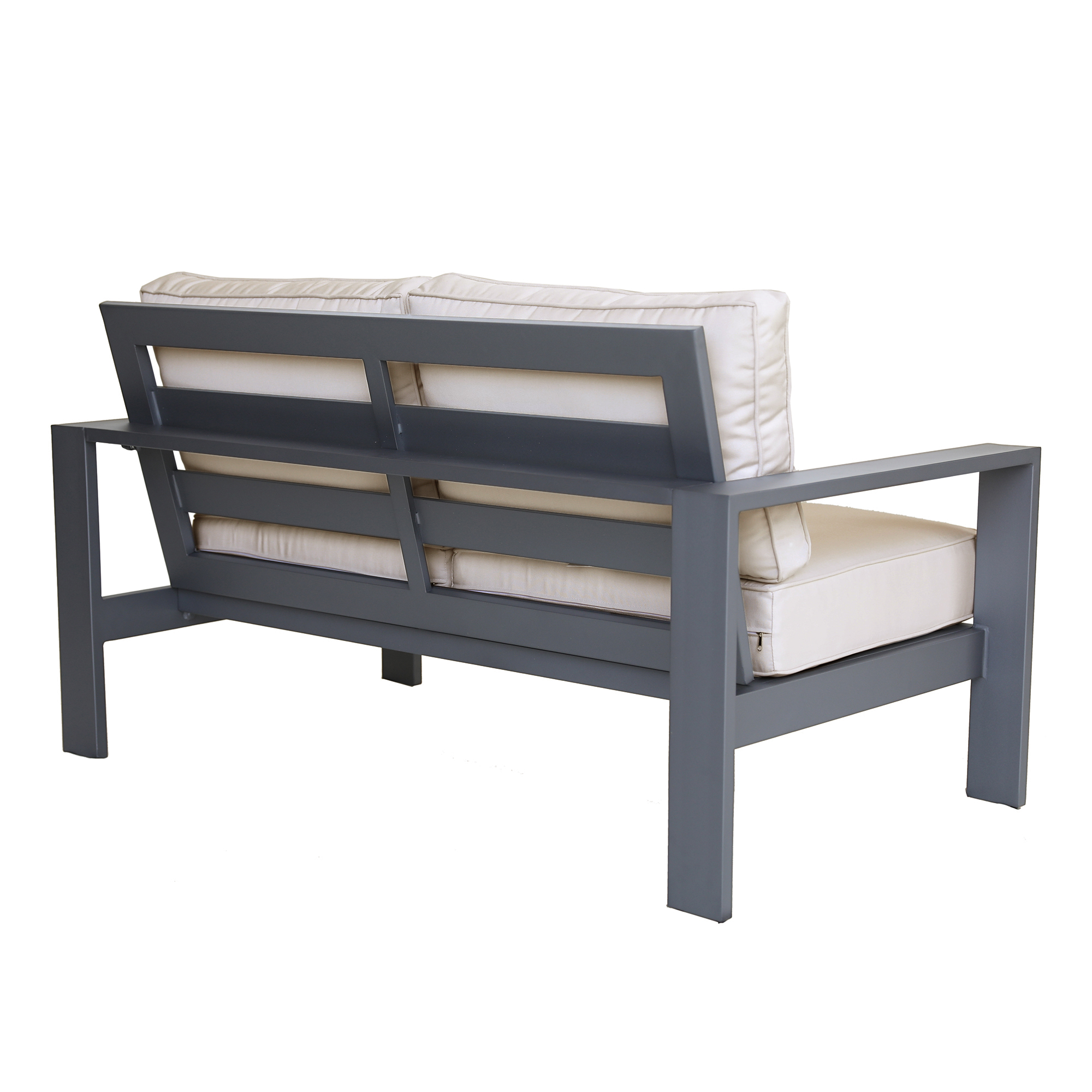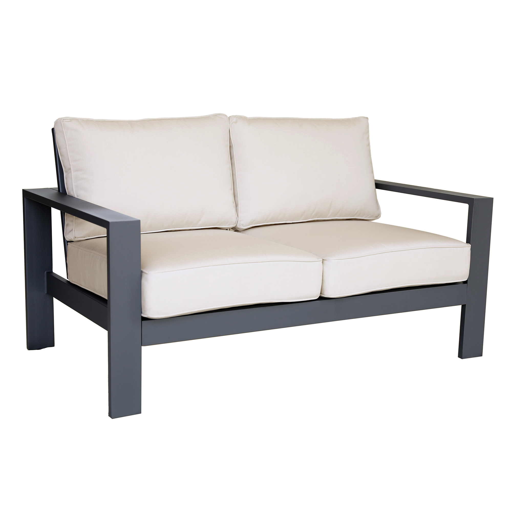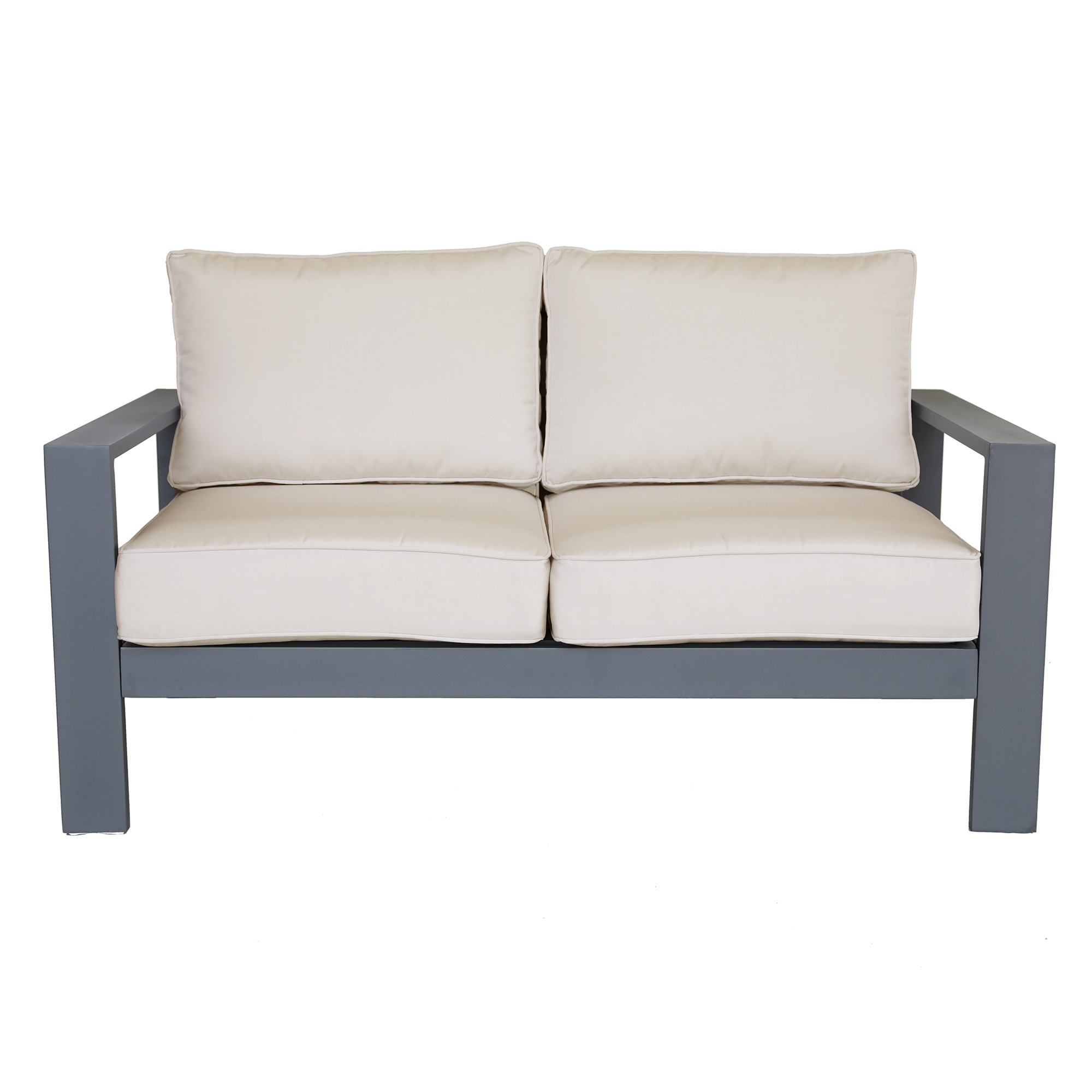 The Alassio Collection is the perfect addition to the any outdoor living area in need of a contemporary flare. This modern tube aluminum Loveseat with cushion is patently lightweight despite its bold appearance.