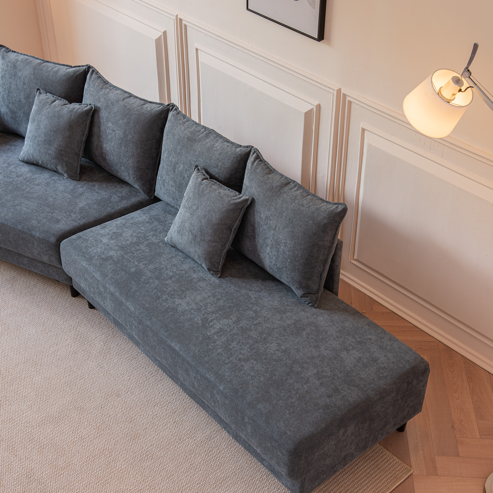 1. With a streamlined silhouette, the living room sectional sofa chaise lounge attracts guests to sit down and relax. Bring luxurious comfort and modern fresh style to your home.