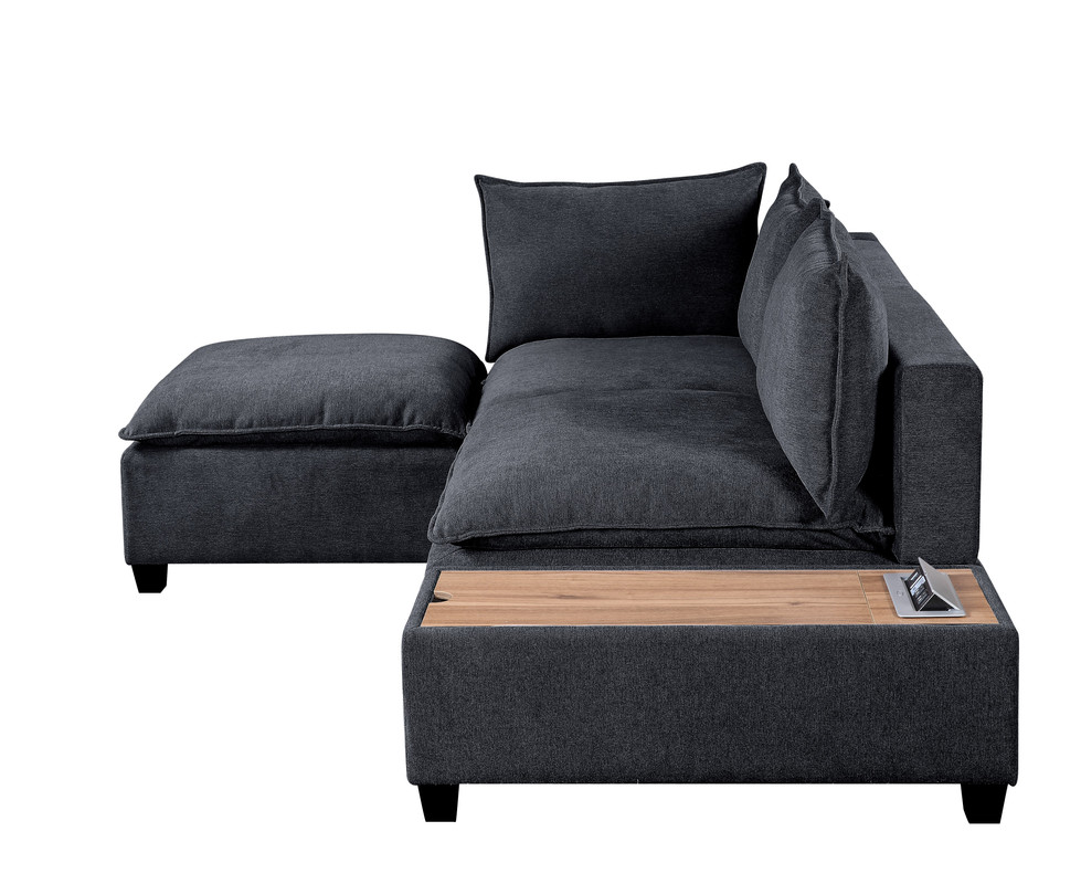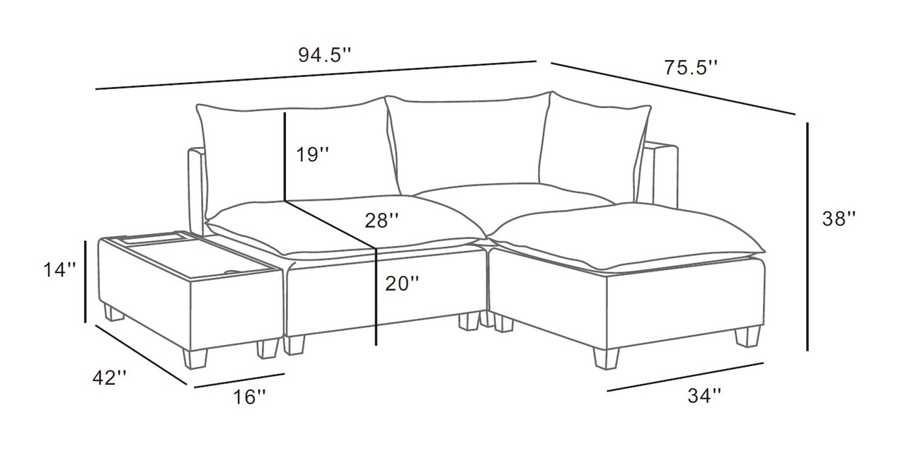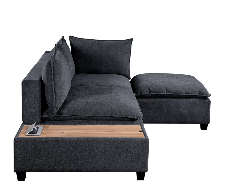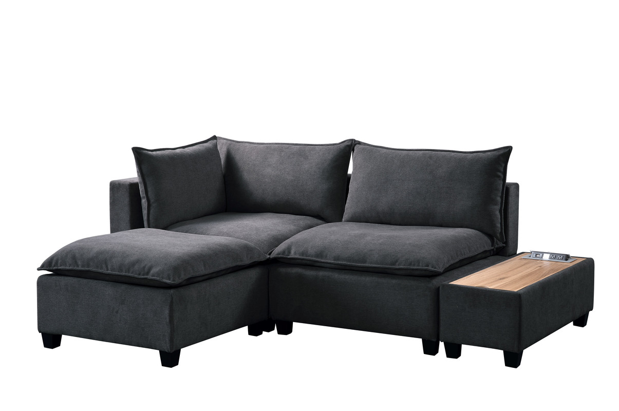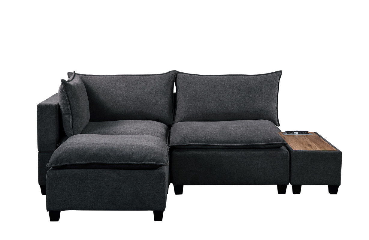 Sit back and relax in the Madison Collection! Crafted from solid wood and fine fabrics, this modern contemporary style couch with ottoman and storage console with USB and charging ports will welcome you and your guests to enjoy your activities with style and comfort. Featuring down feather filled cushions, pocket coil and foam seating, quality woven fabric, and storage USB console, this European Style living room set offers a timeless look and is the leader of furniture trends. Includes 1 Single-Arm Chair, 1 Armless Chair, 1 Ottoman, and 1 Console TableCushions are filled with Down FeatherPocket Coil Springs provide Cushion SupportConsole Table with Storage, USB and AC Charging PortSolid Hardwood FrameLoose Seat and Back CushionsAll pieces attach interchangeably via alligator clips (included)Ottoman measures 34"x34"x20"H20" Seat Height28" Seat Depth29" Arm Height6" Cushions Thickness
