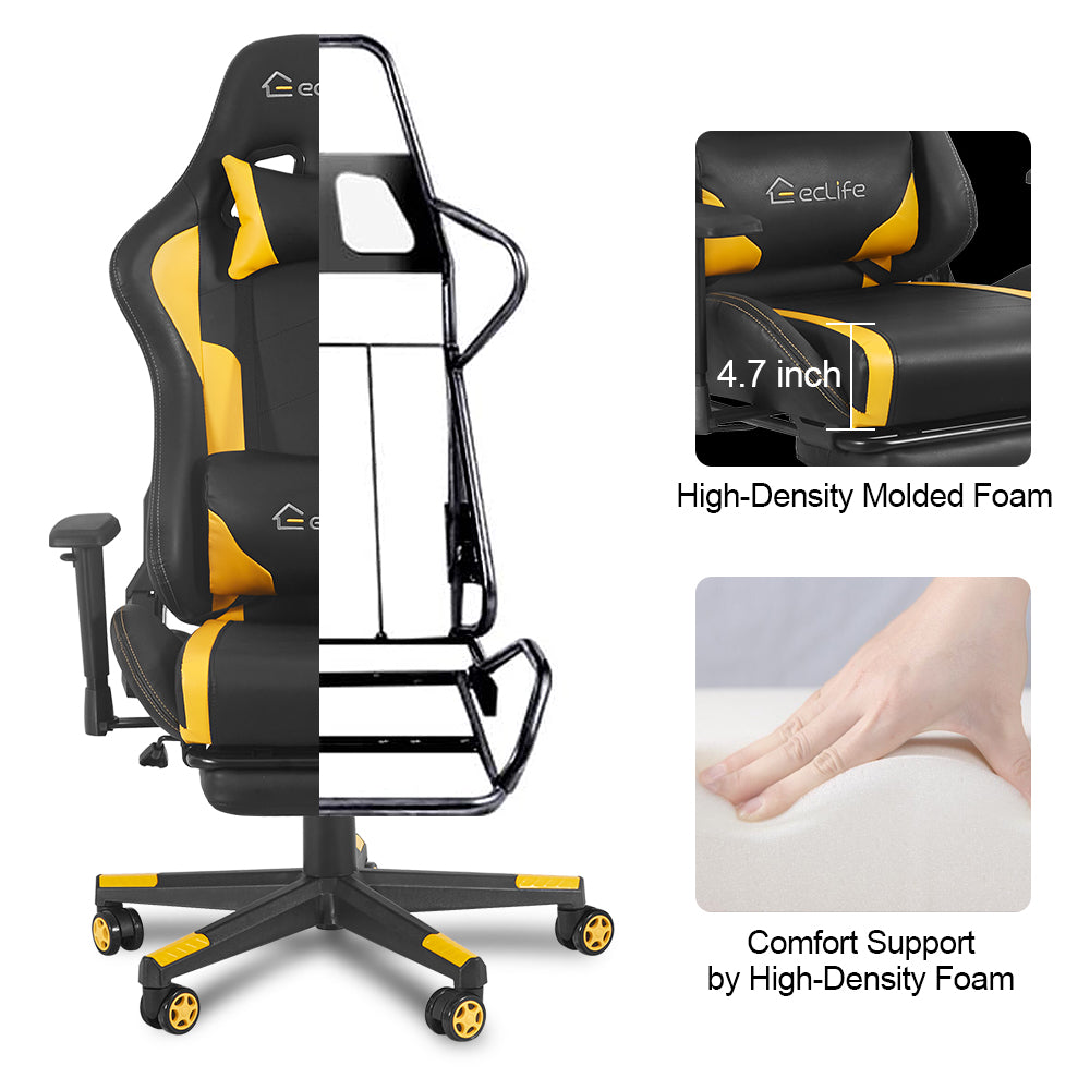 Full Material & Playful Functional: Dual Stitching / Stylish hemming rim / 2 Color Segmented Gen-2 Wear-resist PU leather adding gloss & elasticity / 4-inch Multi-layer Memory foam maintain shaping & support through bucket seat ergonomics / Cool Combination of Wax Leather & Matt Leather / Simplistic Headrest & Removable Lumbar Pillow for upgraded comfort all dimensional / 360 Swivel / Height Adjustable / 90-150°SILENT Reclining / Retractable Footrest / Gen-2 Enhanced Arm