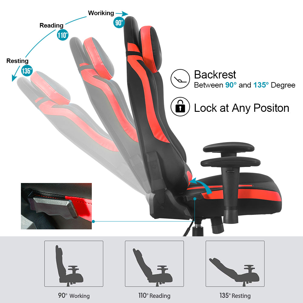 ERGONOMIC DESIGN: Racing style chair designed with human-oriented ergonomic construction for providing comfort sitting experience, inside heavy wooden s-shape frame construction provides ultimate stability, can be locked in any position when you recline, have the safe angle 90-135 degree.