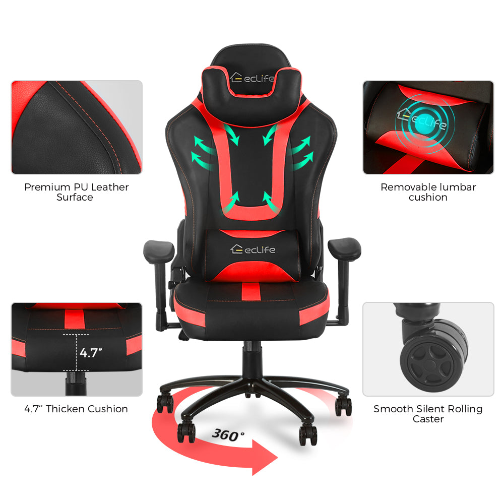 Massage Gaming Chair with Silent Rubber Casters-Red