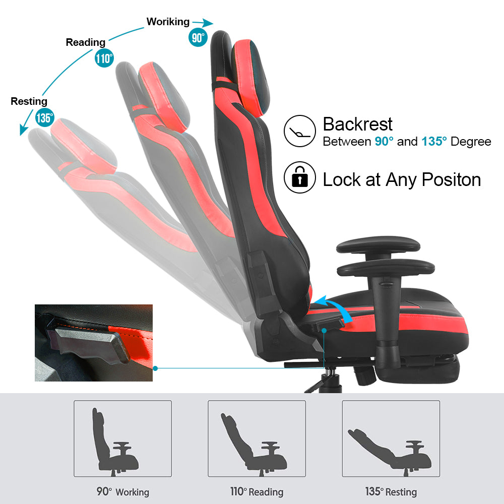ERGONOMIC DESIGN: Racing style chair designed with human-oriented ergonomic construction for providing comfort sitting experience, inside heavy wooden s-shape frame construction provides ultimate stability, can be locked in any position when you recline, have the safe angle 90-135 degree.