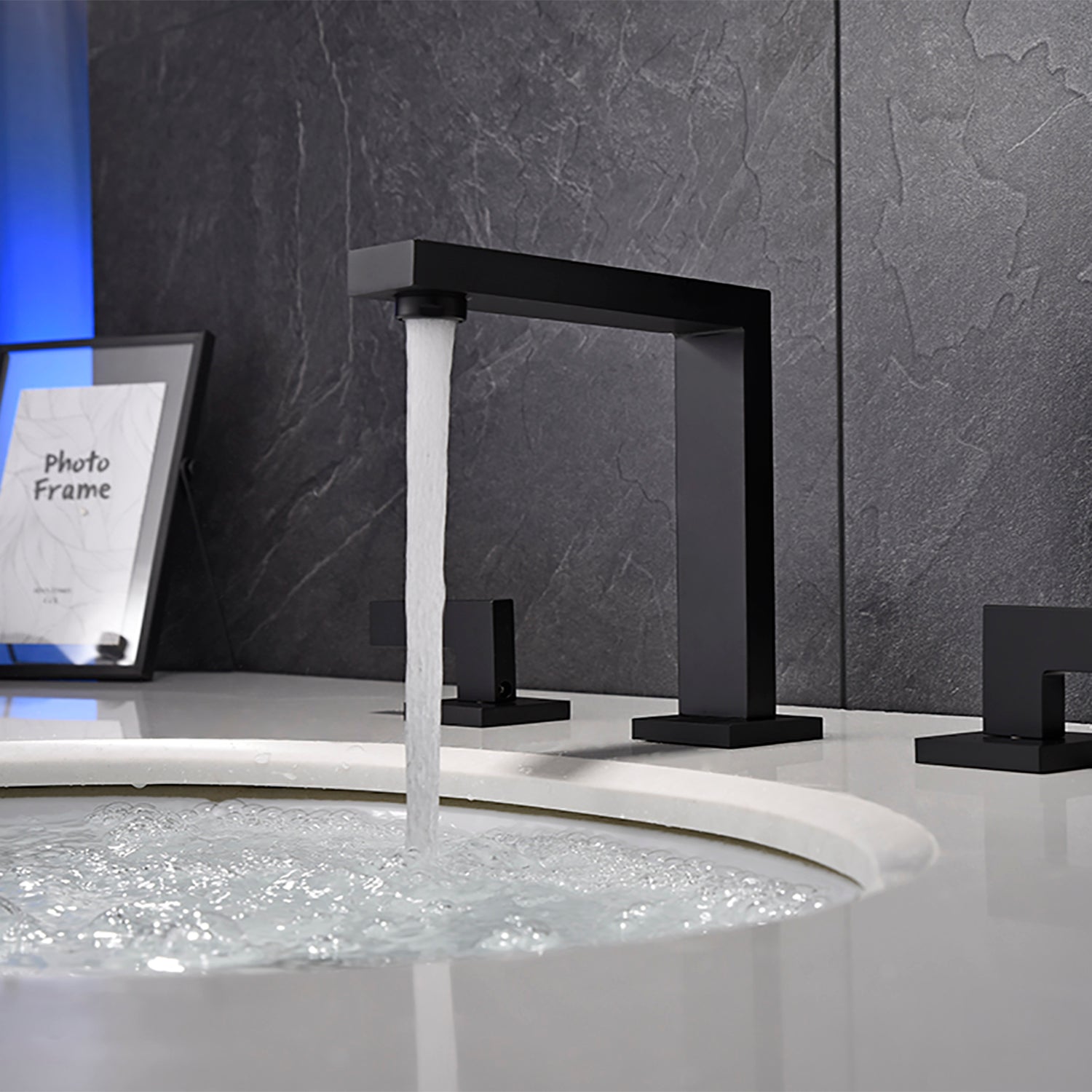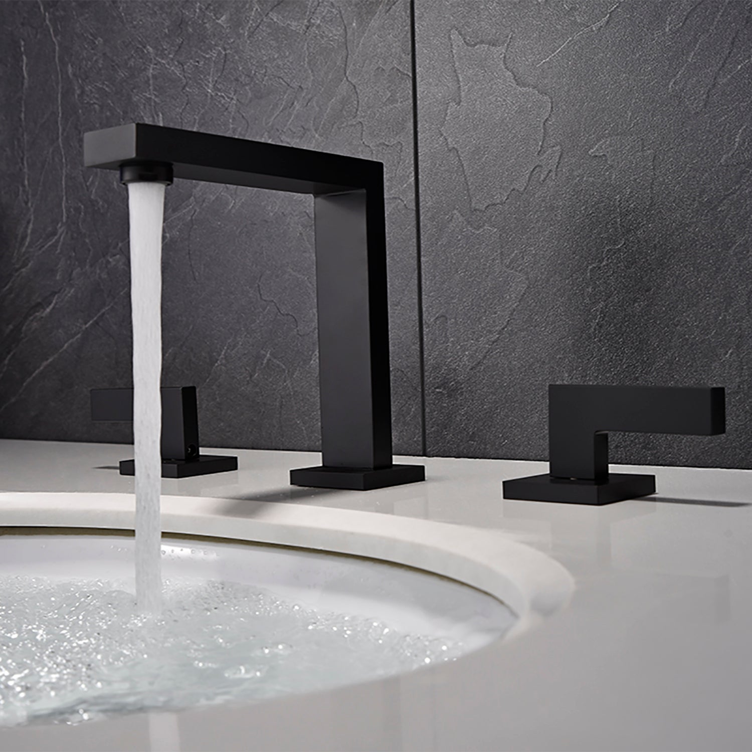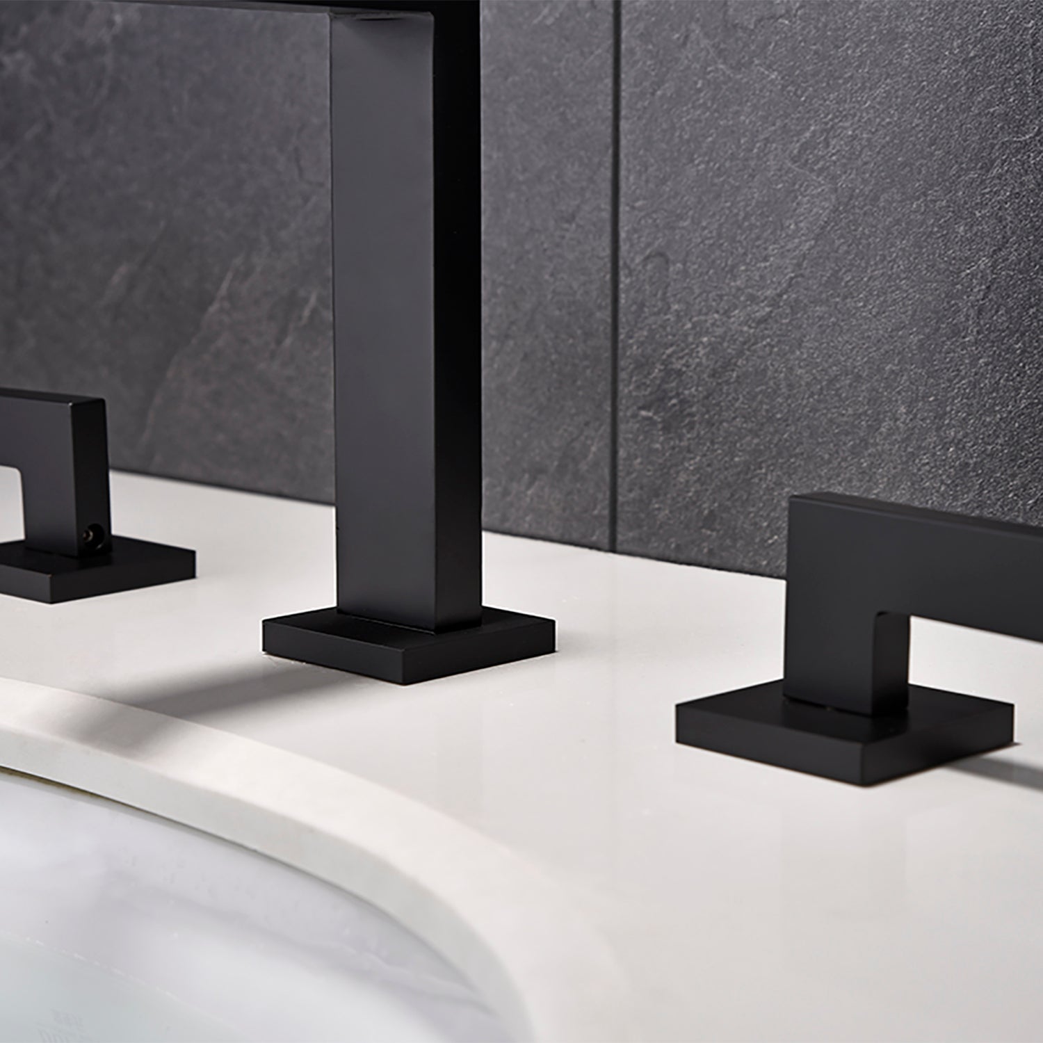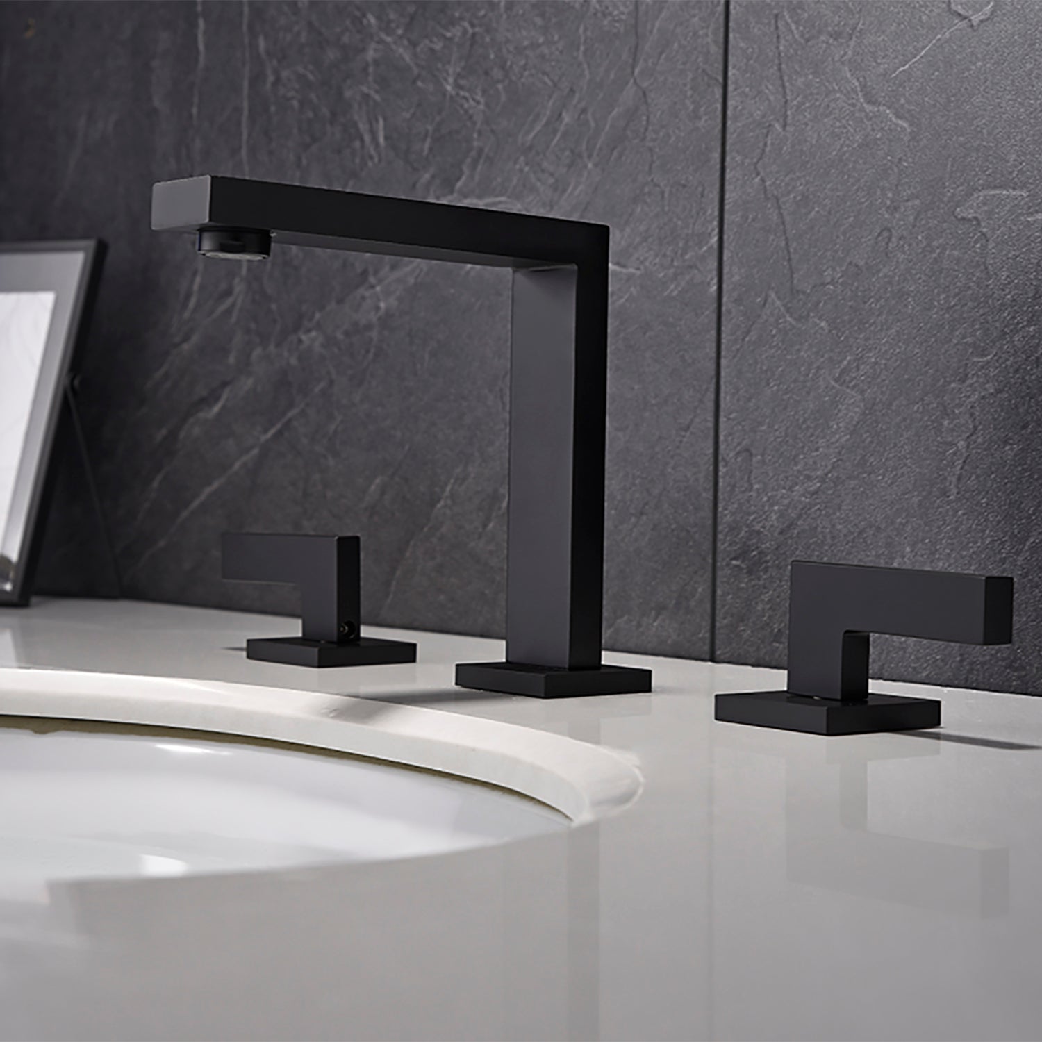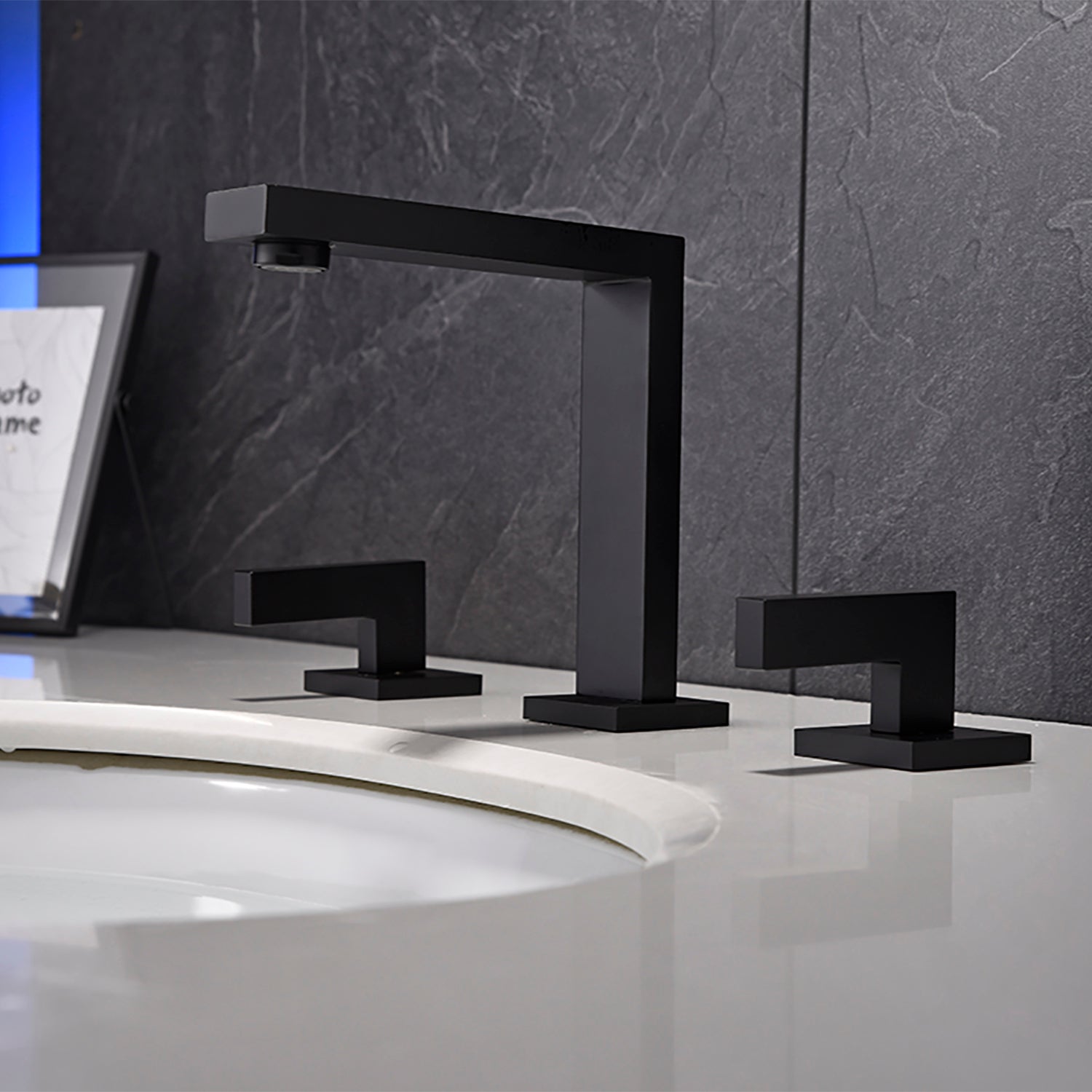 Low-key luxury in a pure black finish, suitable for creating modern and classic bathroom decoration style. Clean right-angled faucet body boasts the beauty of geometry and provides a gentle water flow. Double handles complete the design perfectly and offer effortless control.