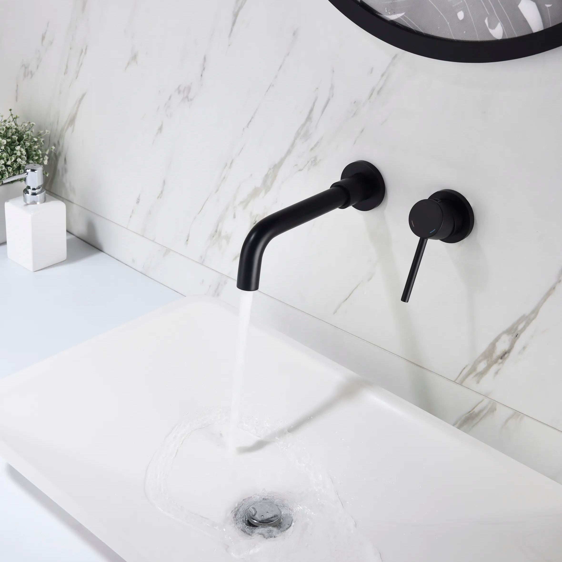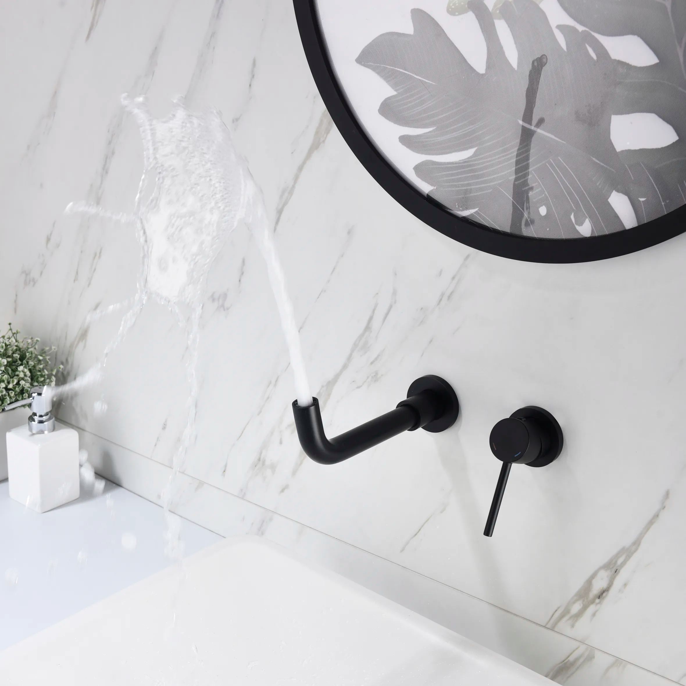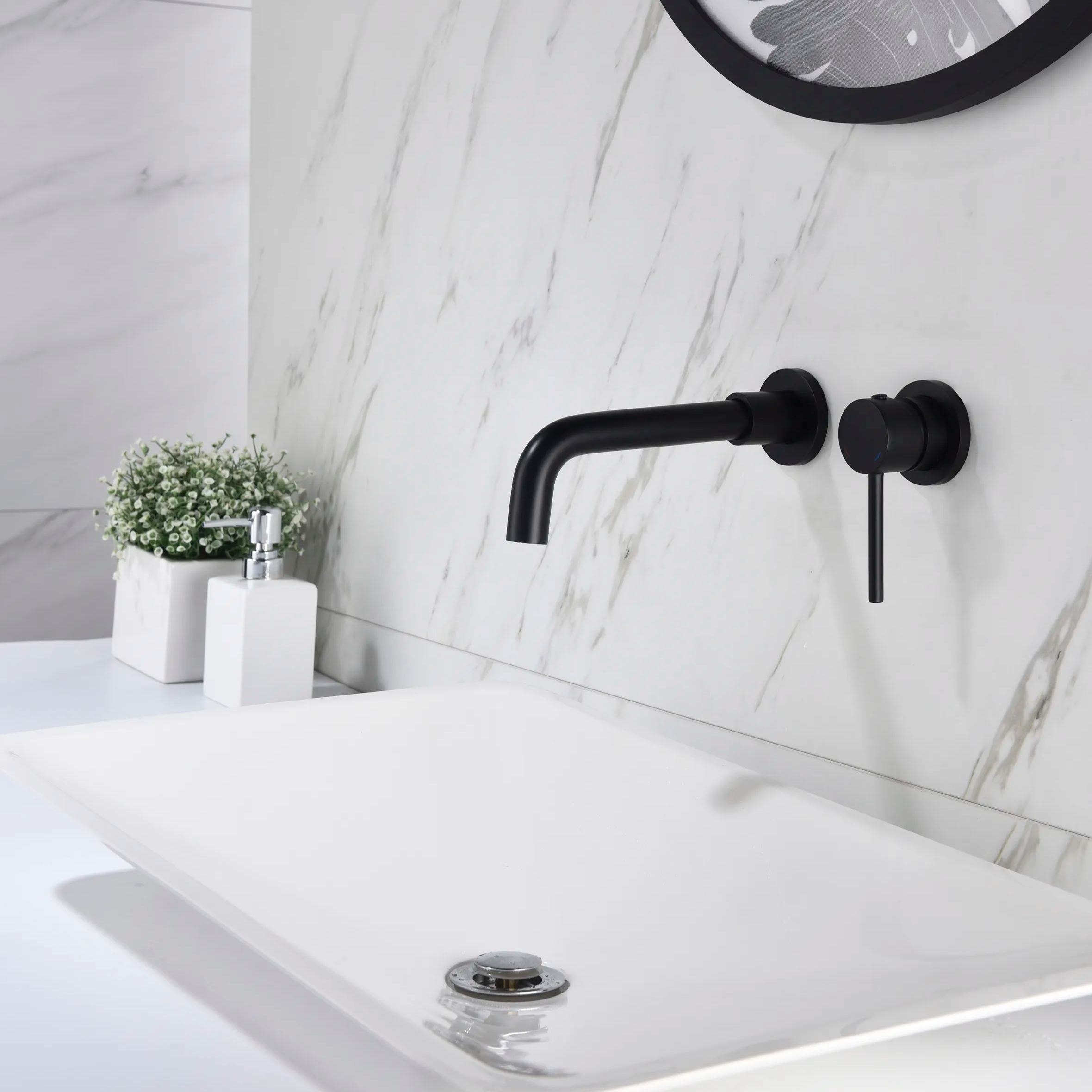 - The wall-mount bathroom faucet boasts contemporary, curved edges for an appealing, yet substantial style that brings a sleek feeling to the bathroom.