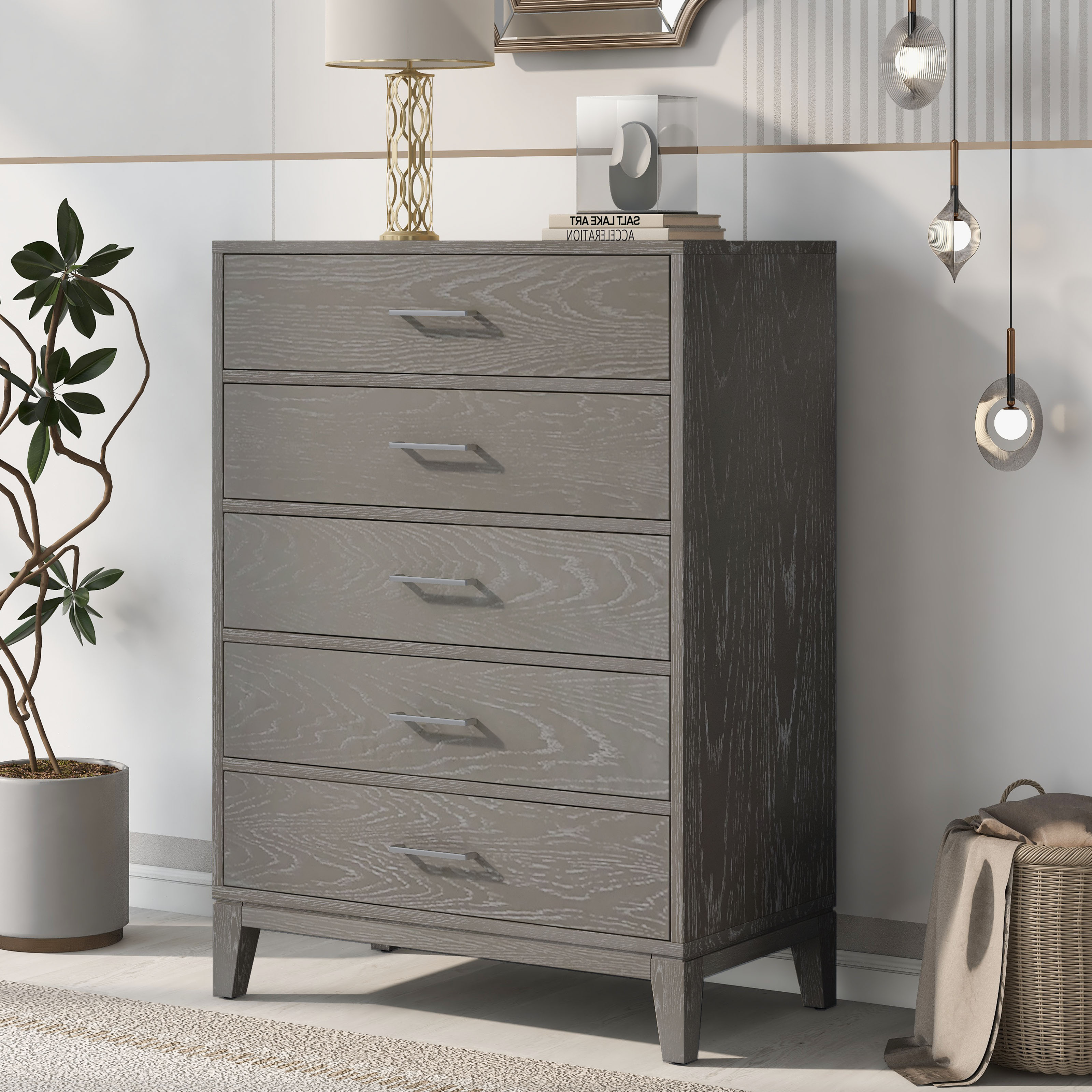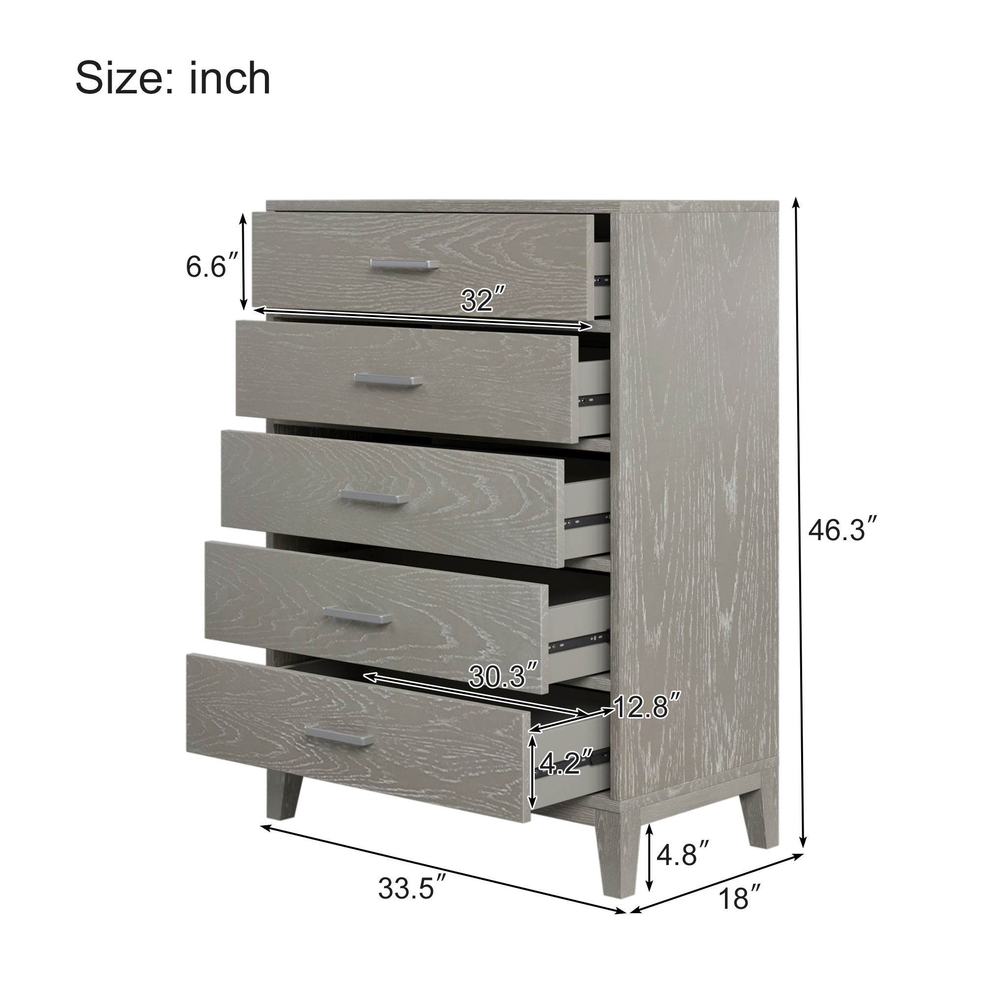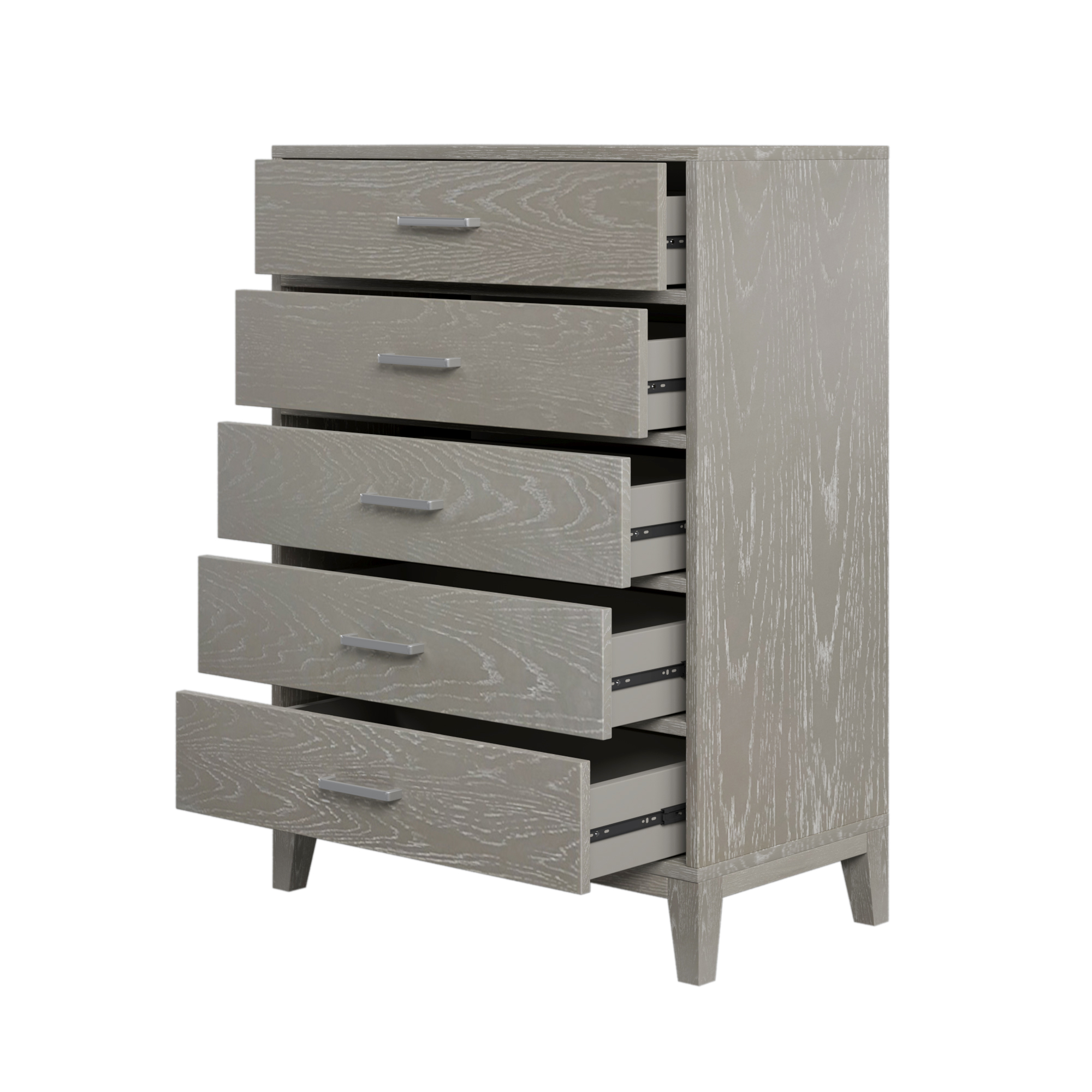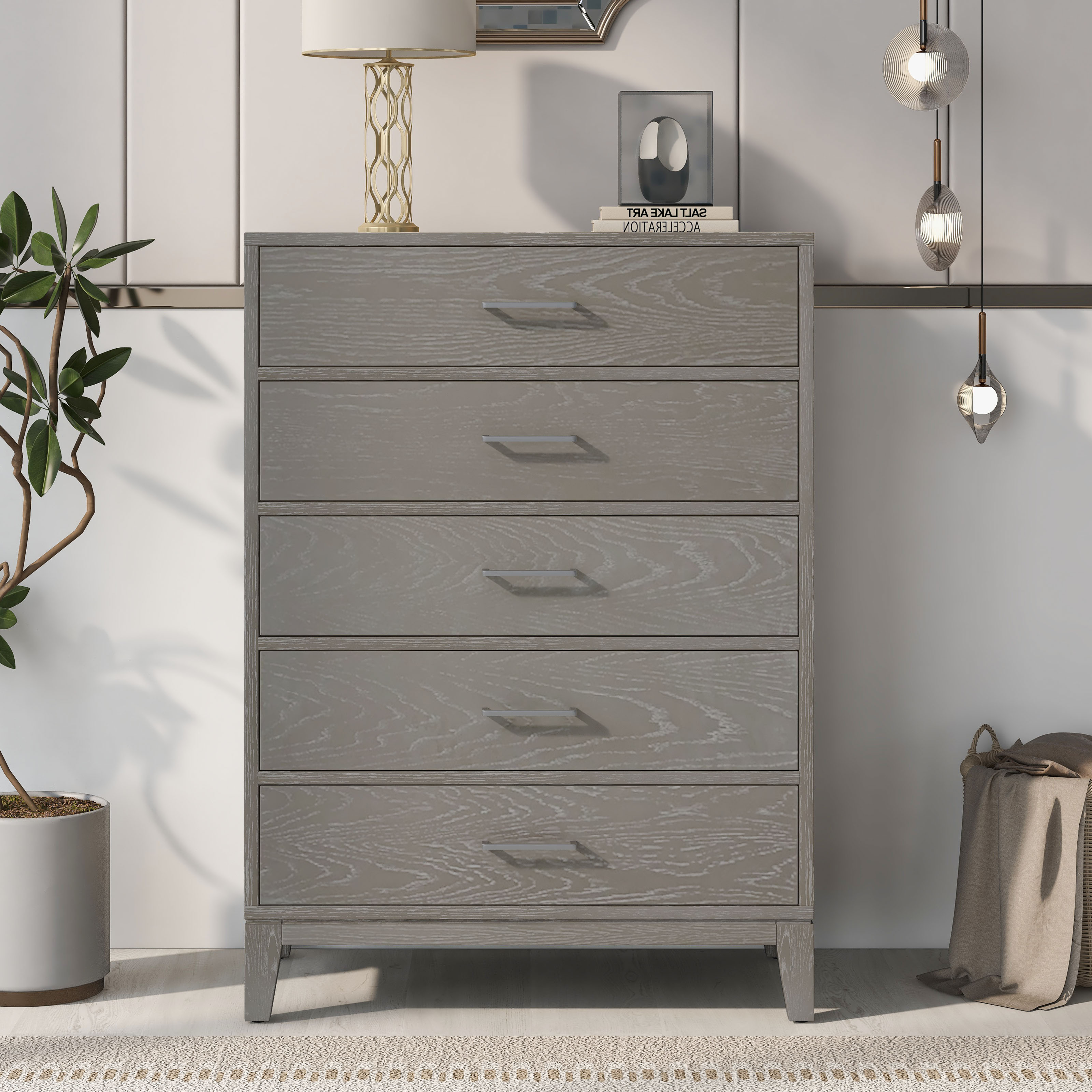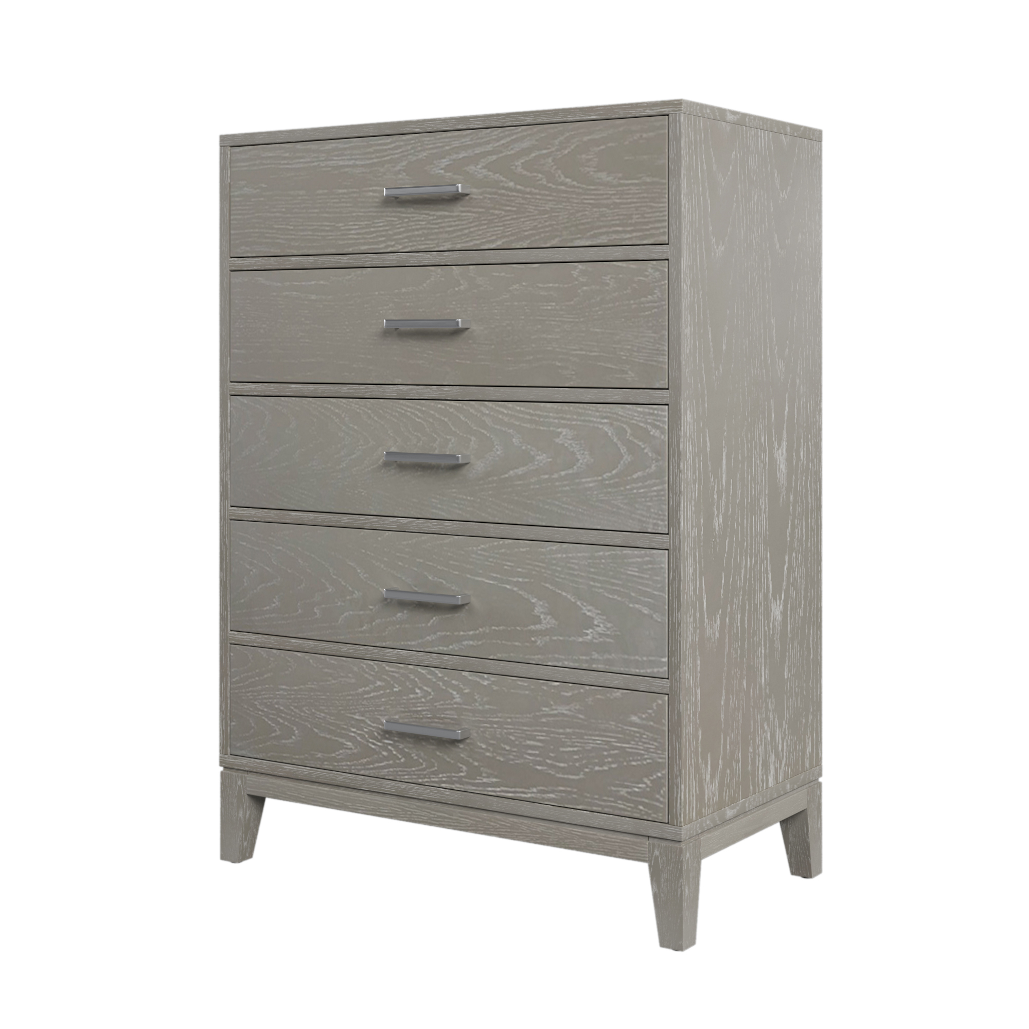 The five-drawer chest surface has visible wood grain, greatly added to the modern design style. The surface is easy to clean, not easy to stain, not easy to scratch. Chests of drawers add more storage space to your bedroom or guest room. This chest has a natural wood feel to it which also adds a great amount of durability as well.