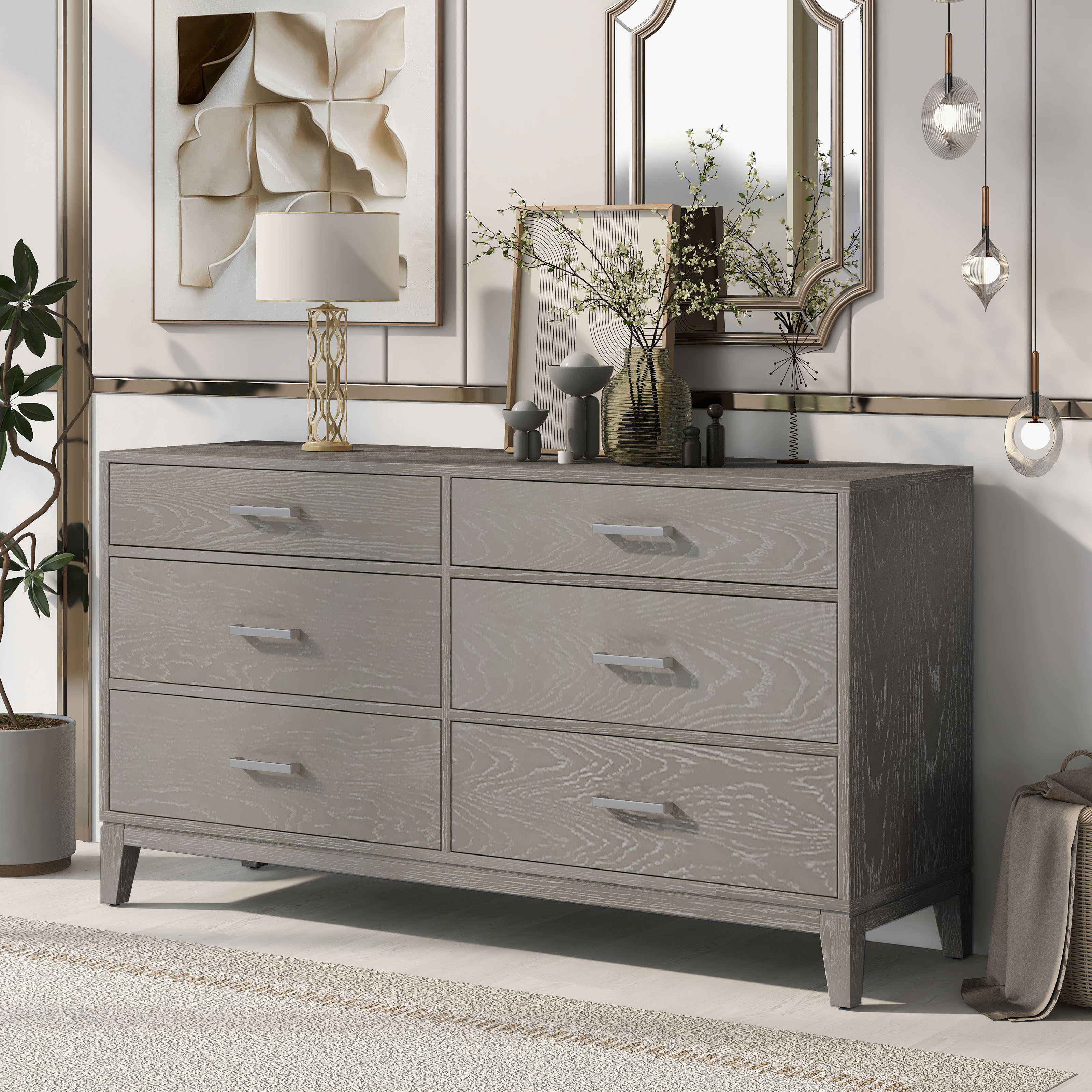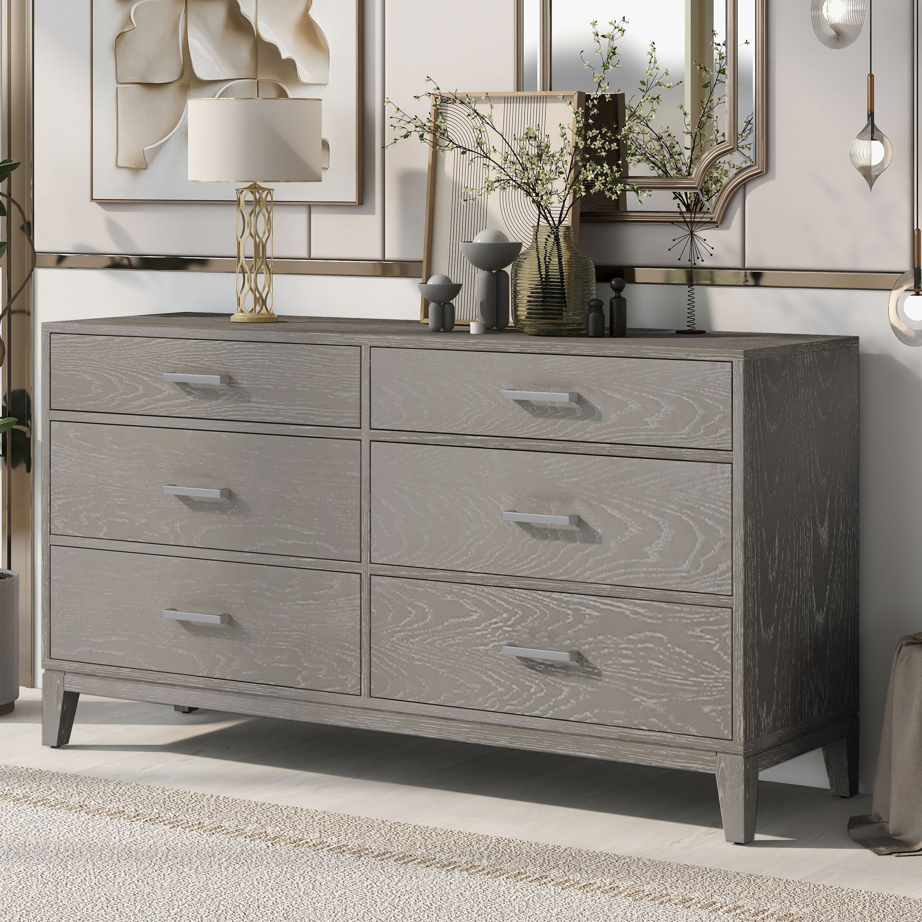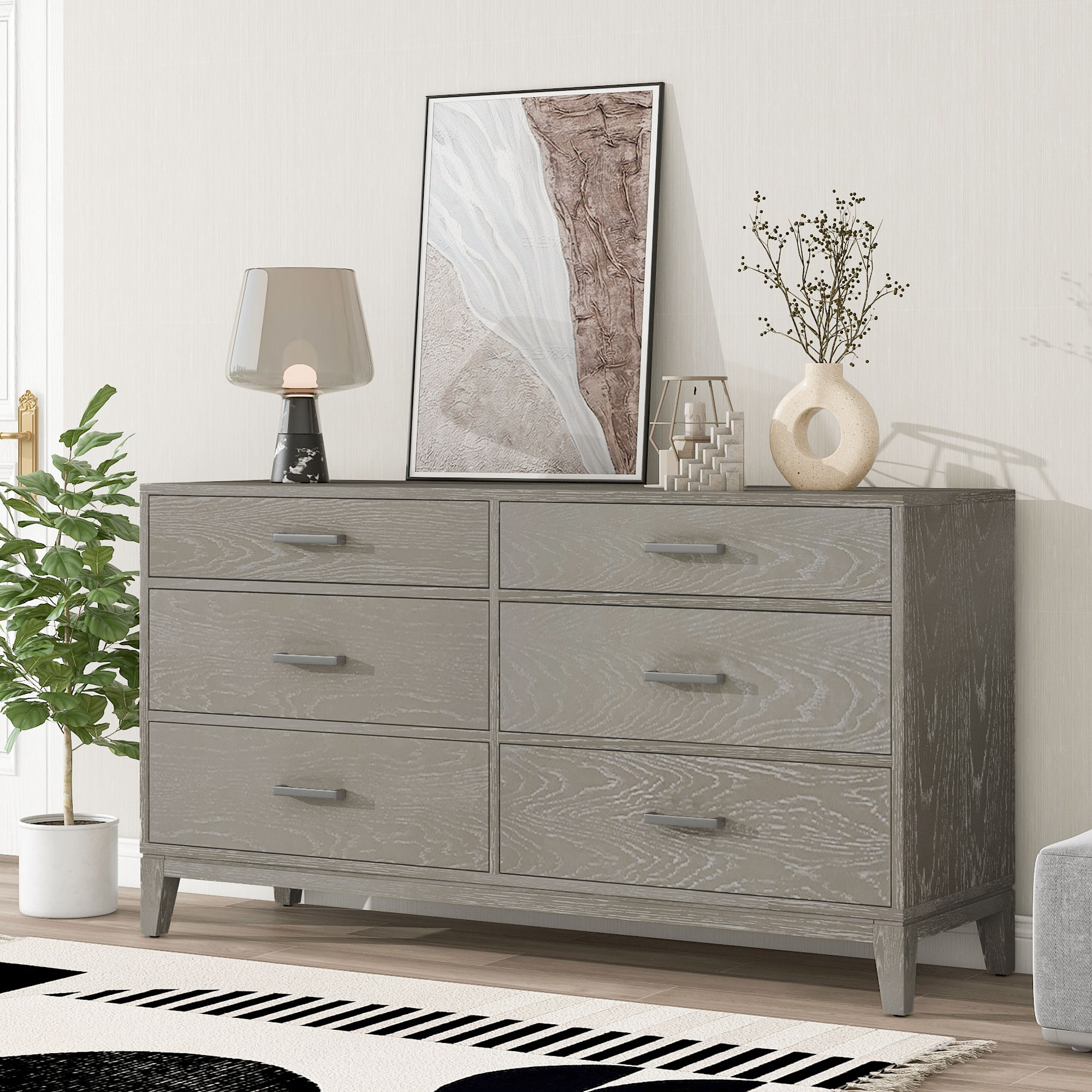 The six-drawer dresser surface has visible wood grain, greatly added to the modern design style. The surface is easy to clean, not easy to stain, not easy to scratch. Chests of drawers add more storage space to your bedroom or guest room. This dresser has a natural wood feel to it which also adds a great amount of durability as well.