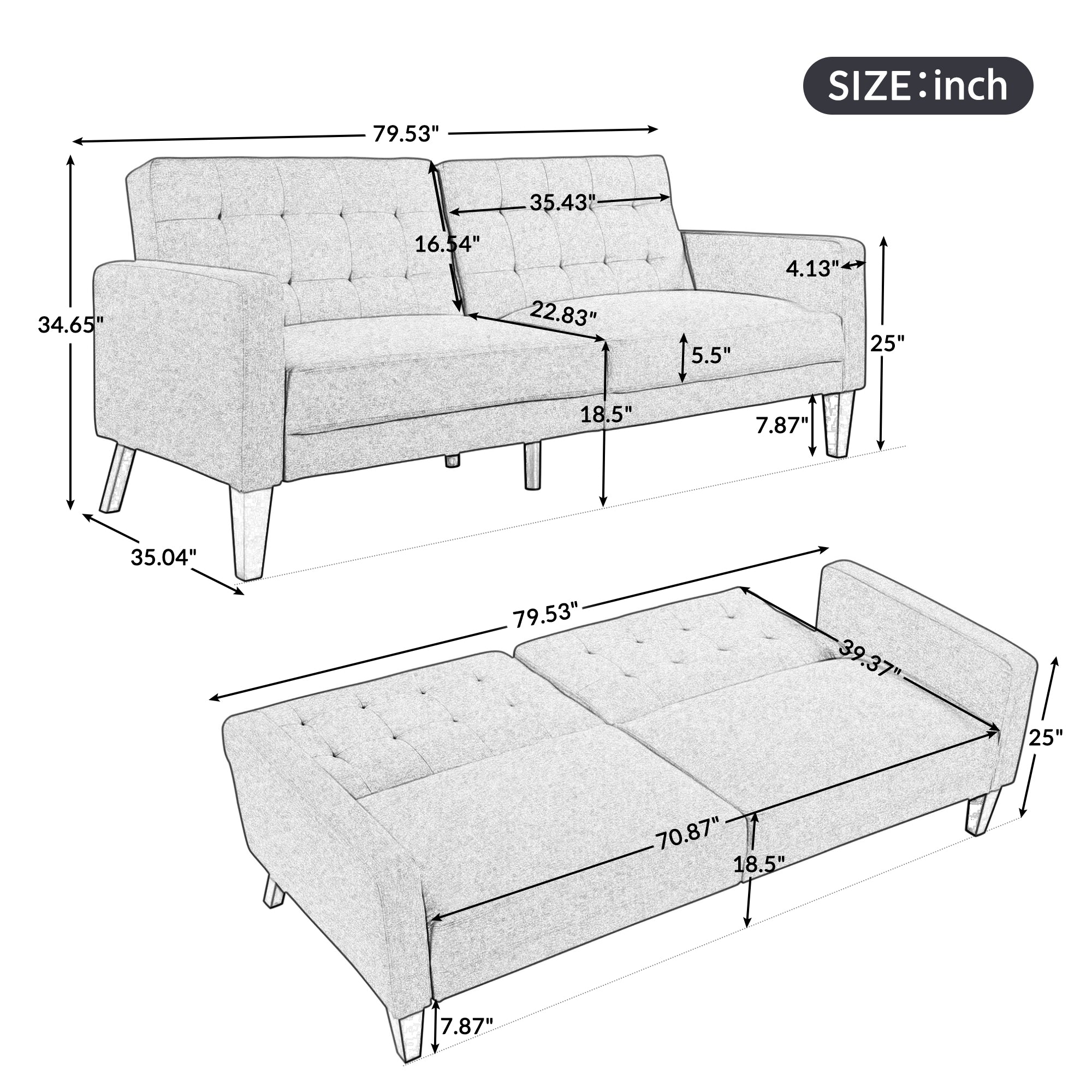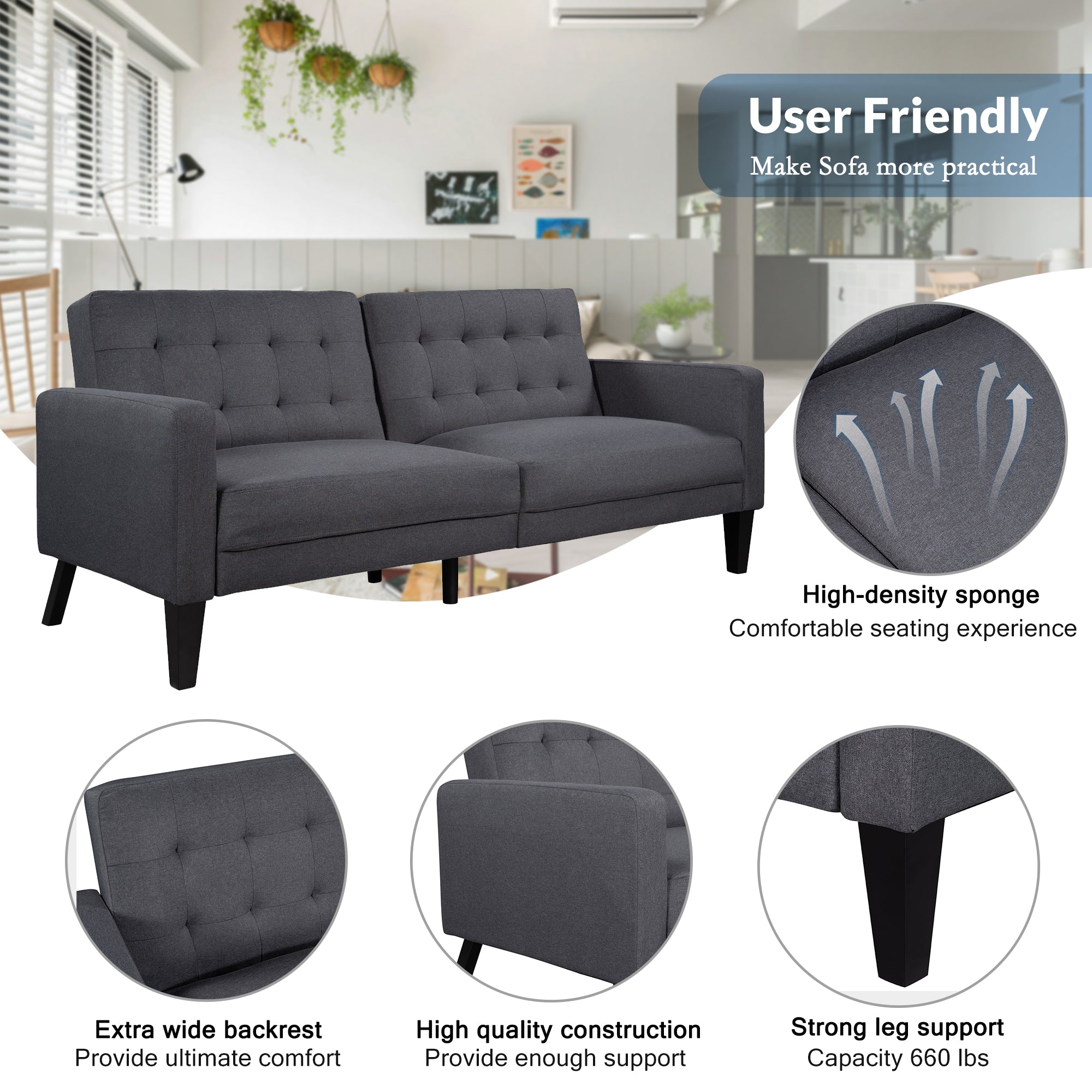 Firm and Sturdy: Strong wood frame wrapped by supportive foam and durable linen fabric, this love-seat couch offer a great support with weight capacity of 660 lbs.