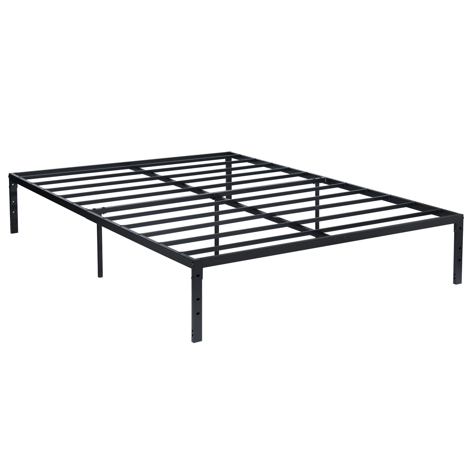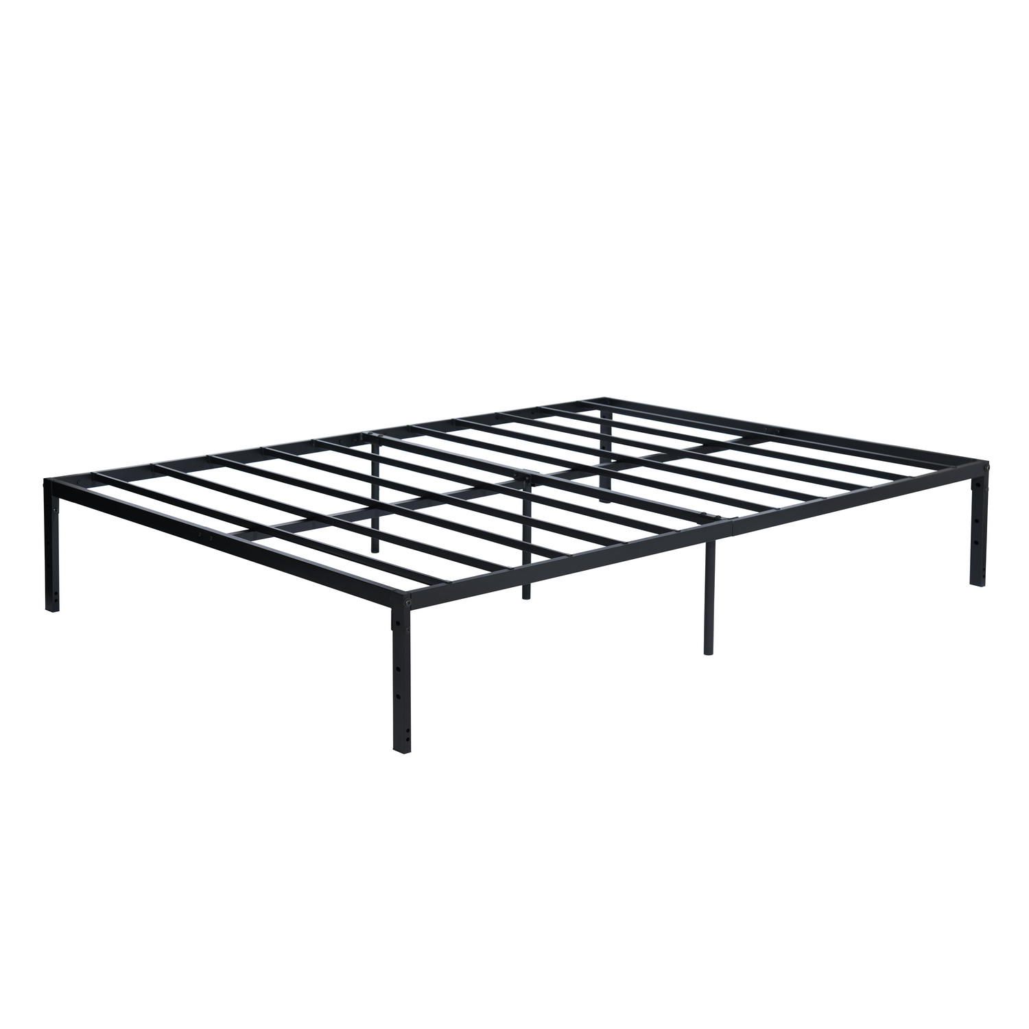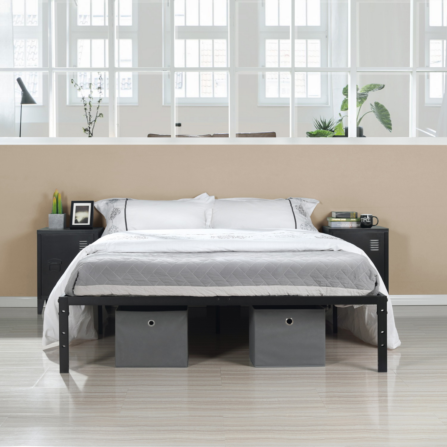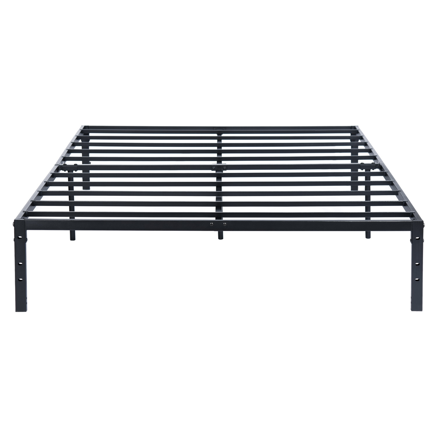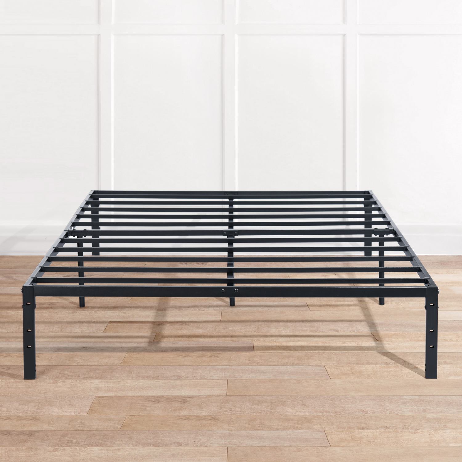 Set a solid foundation in your master suite or guest room with this 14” tall bed frame. Crafted from strong steel in a slick black finish to match with any aesthetic, this piece strikes a clean-lined, angular silhouette and includes a series of sturdy metal slats to support your preferred mattress. Perfect for those looking for a sleeker, more modern bedroom, this frame can be used with or without a box spring, and features 14” of clearance for convenient under-bed storage.