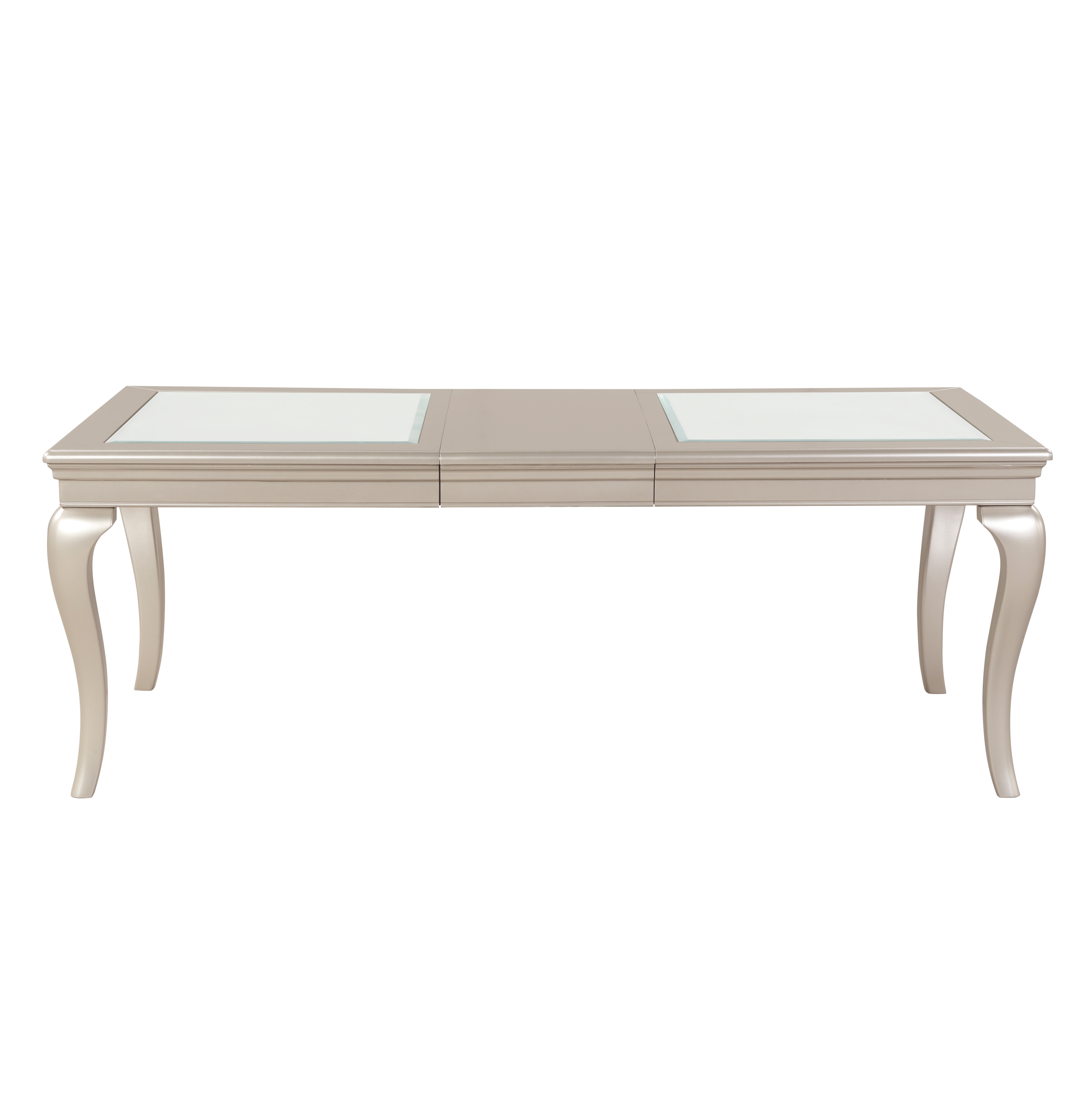 Features:-•Made of wood and engineered wood•Silver finish•Separate extension leaf•Table extends by pulling both ends and dropping in leaf•Seats capacity 6Product Description:-Blending traditional lines with modern glamour is this Collection. Finished in an eye-catching silver, the dining table will be a dramatic addition to your home’s dining room. Cabriole legs and insert glass panels lend traditional accent.Product Dimensions:-Overall Dimension: 42" x 66" - 84" x 30.5"HApron to floor: 25.5"Length of leaf: 18" x 1Listing Includes :- One Dining Table Only.Chairs: NOT INCLUDEDSimple Assembly Required.Shipment Service:Shipping Service Include Curb Side Delivery With Free Lift Gate Service.NOTE : No Inside Home Delivery.Shipment will take around 8-14 Business days