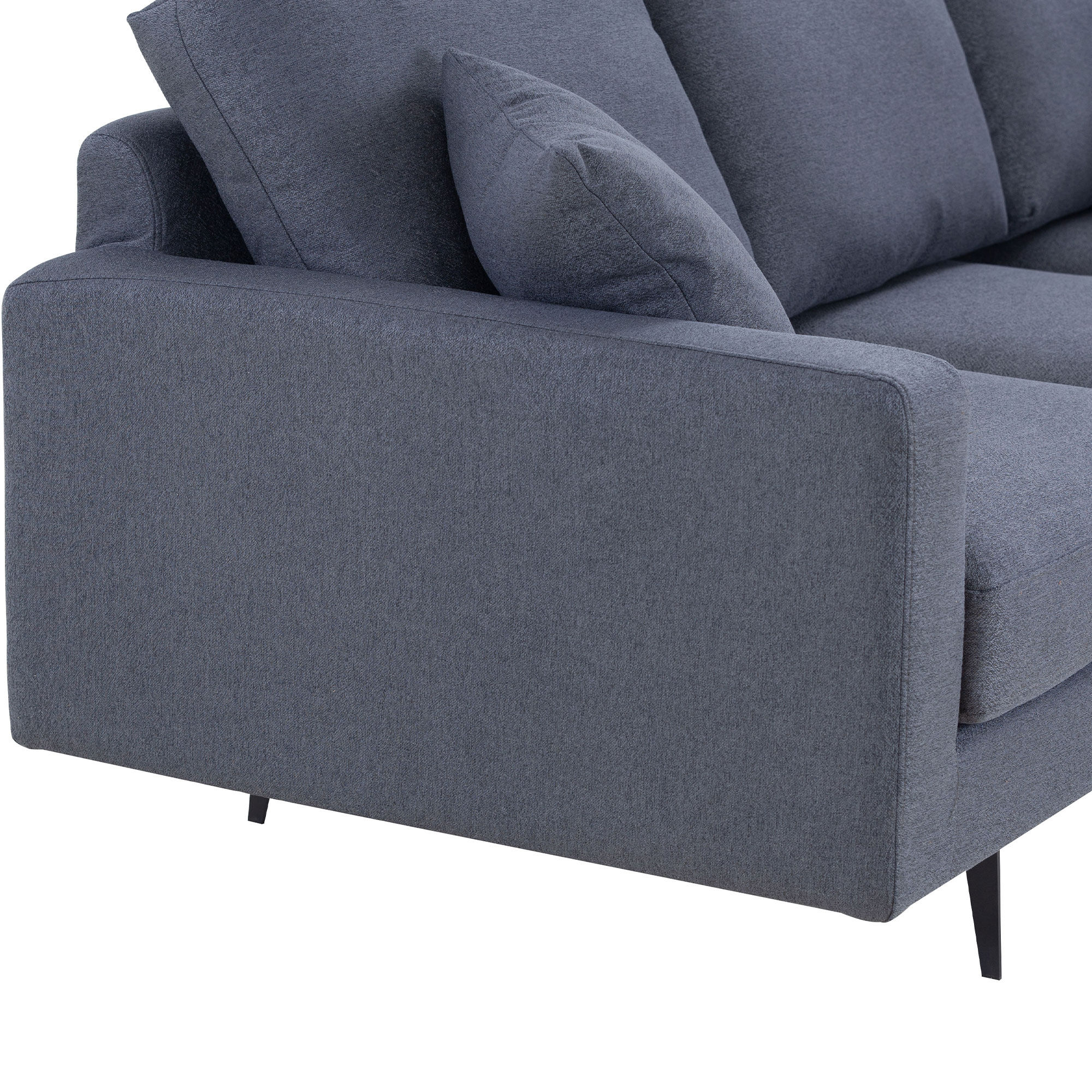 Comfort is key with our three-seater design, featuring thick sponge padding and two plush pillows for ultimate relaxation. The high-density spring and solid wood structure ensure durability and longevity, while the metal legs provide a sturdy base and add a touch of contemporary flair.