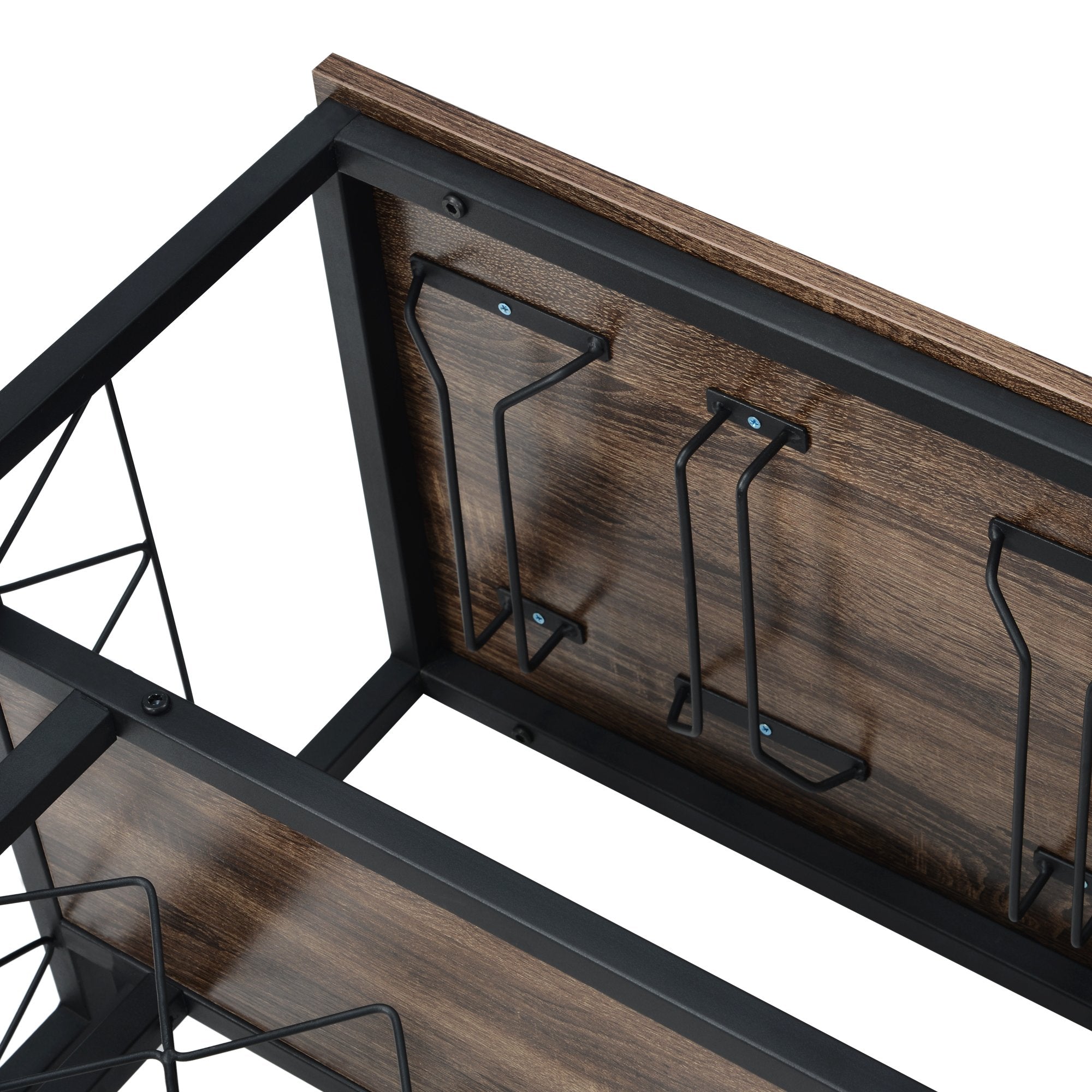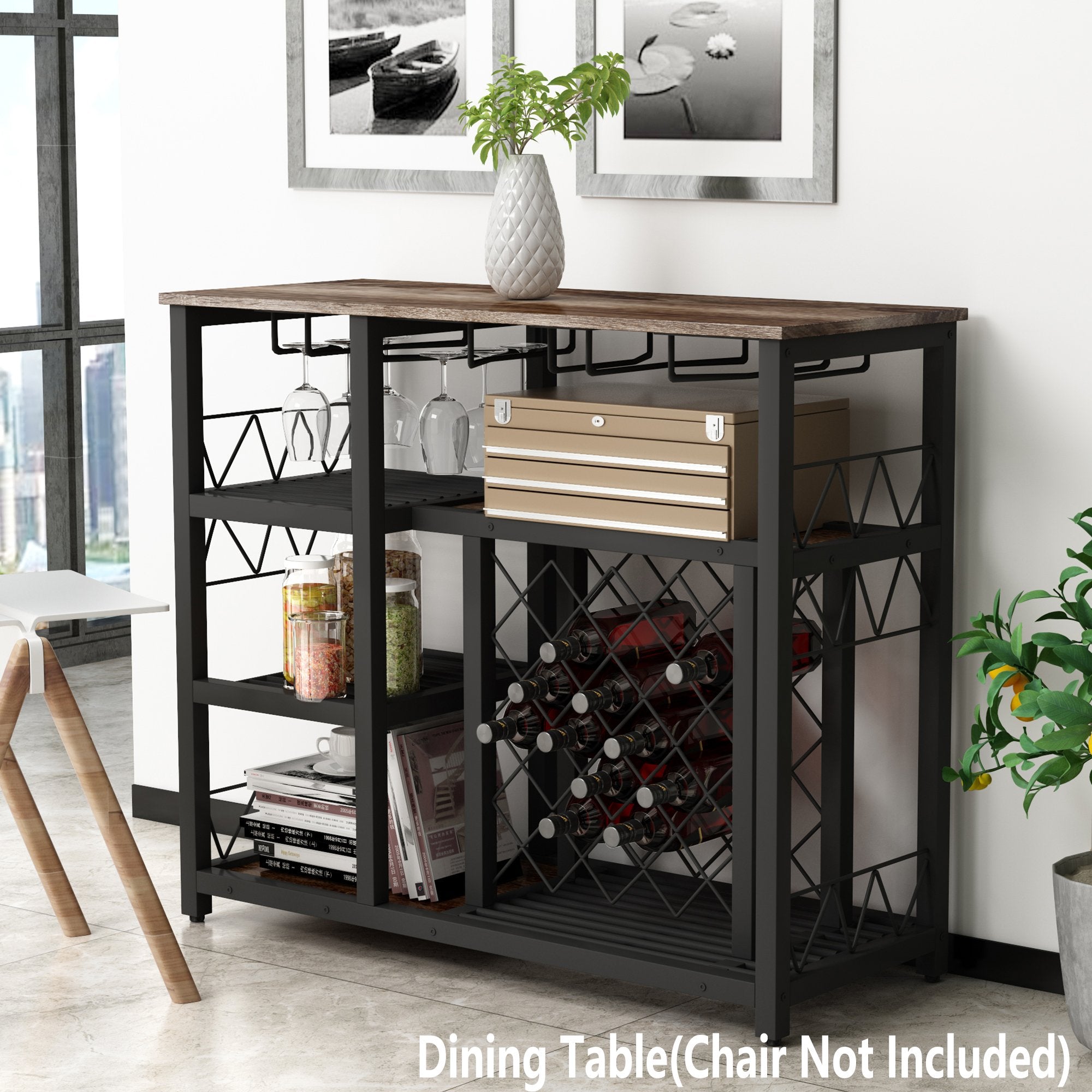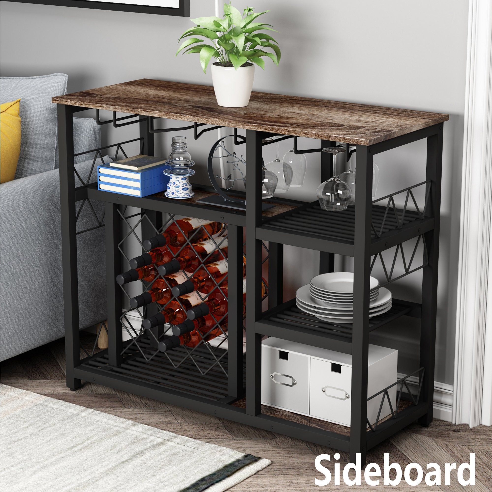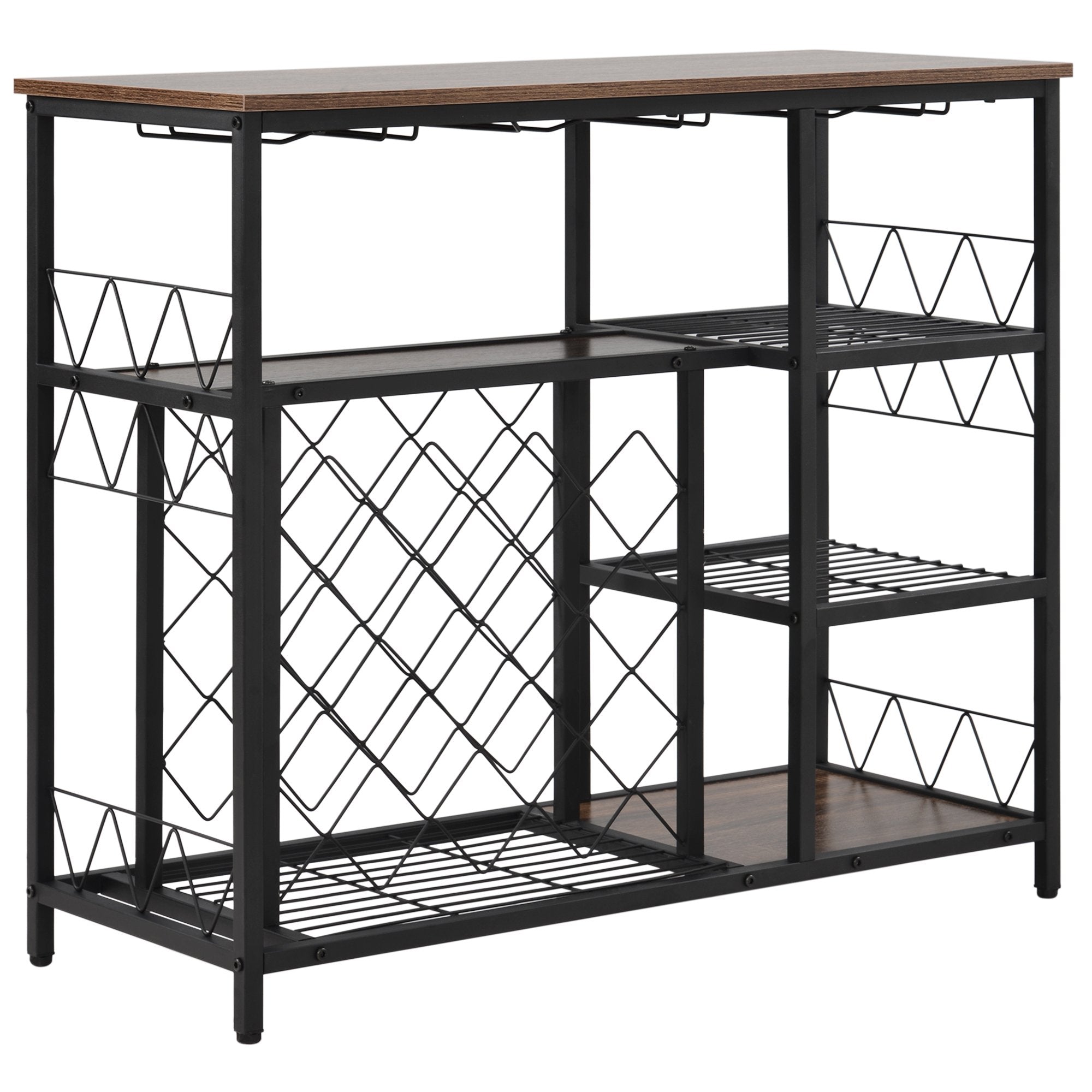 Modern Industrial Home Kitchen Dining Room Metal Wine Rack Table with Glass Holder, Freestanding Wine Bar Cabinet Console Table Buffet Table with 21 Bottles for Small Places, Brown Finish