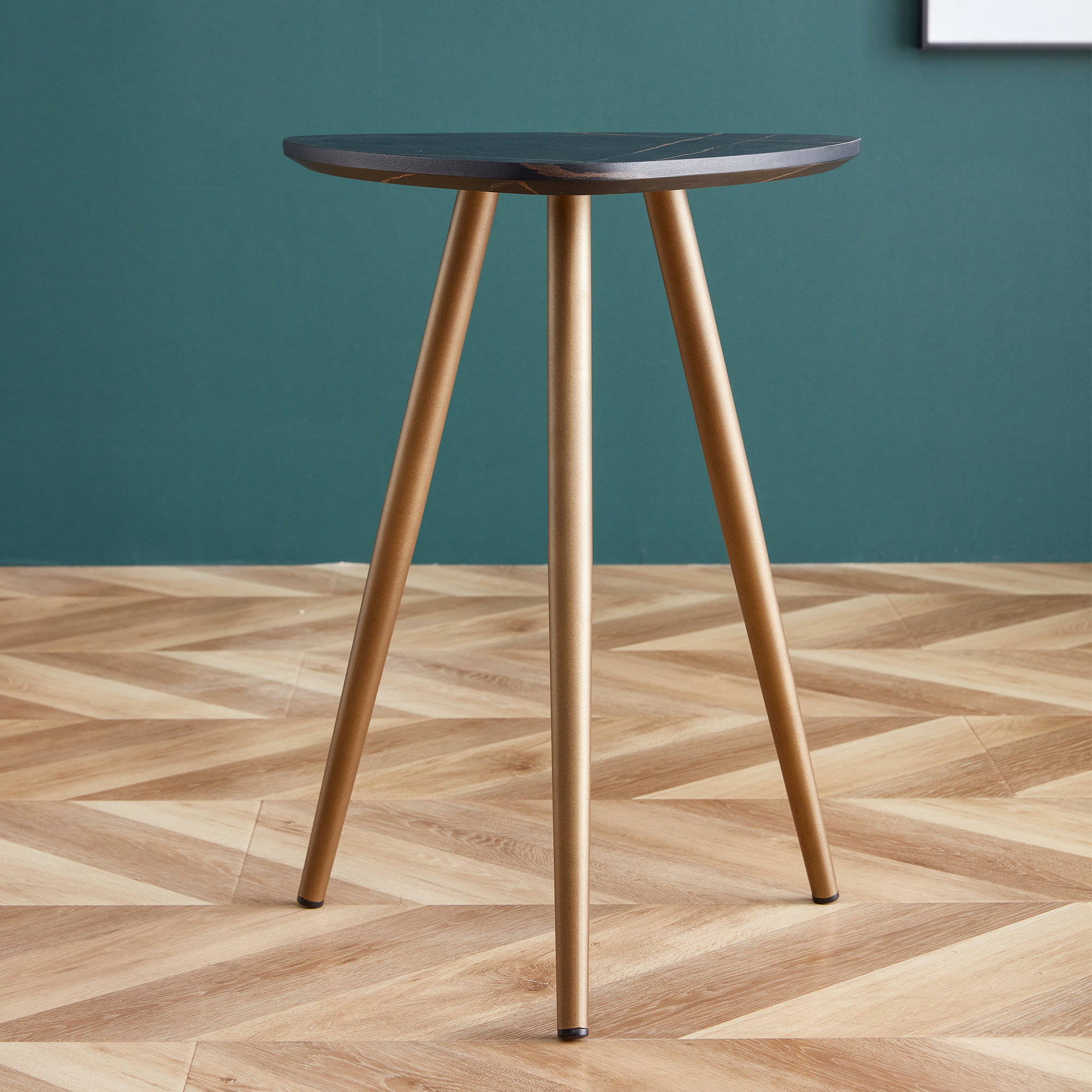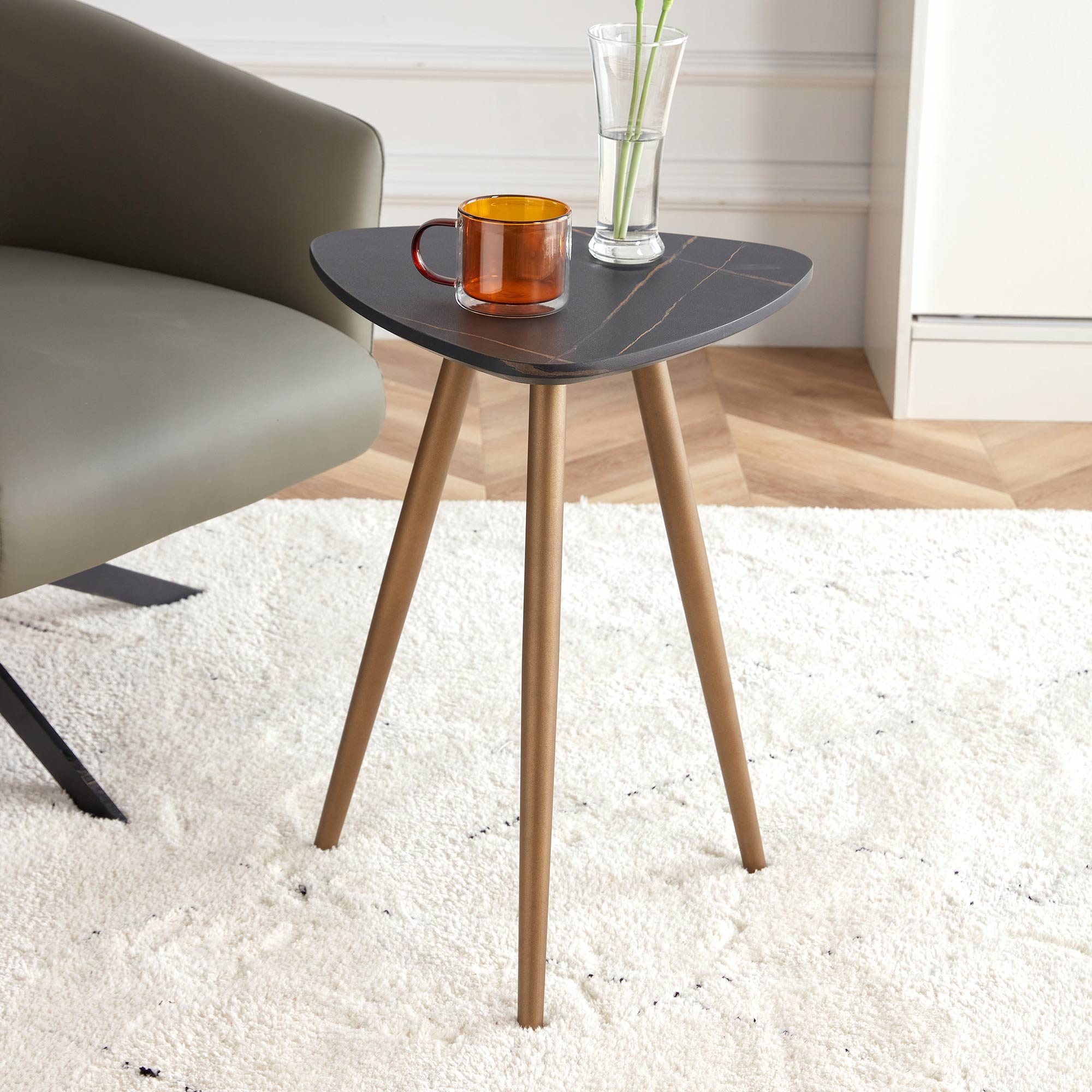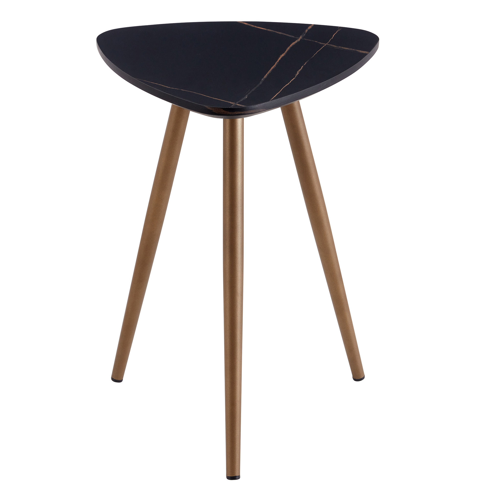 3.The end table featuring a black marble-like tabletop with three dark gold metal legs, adds a stylish style with its clean lined design.