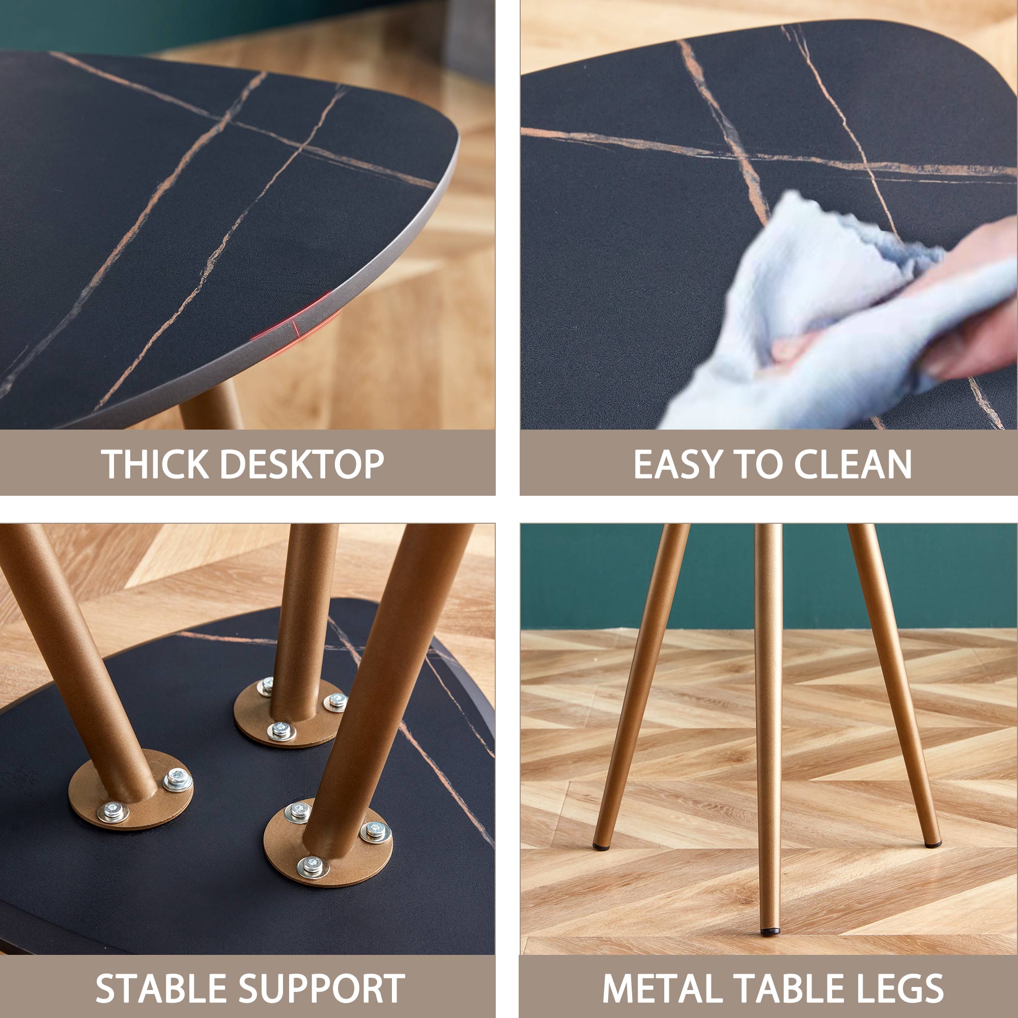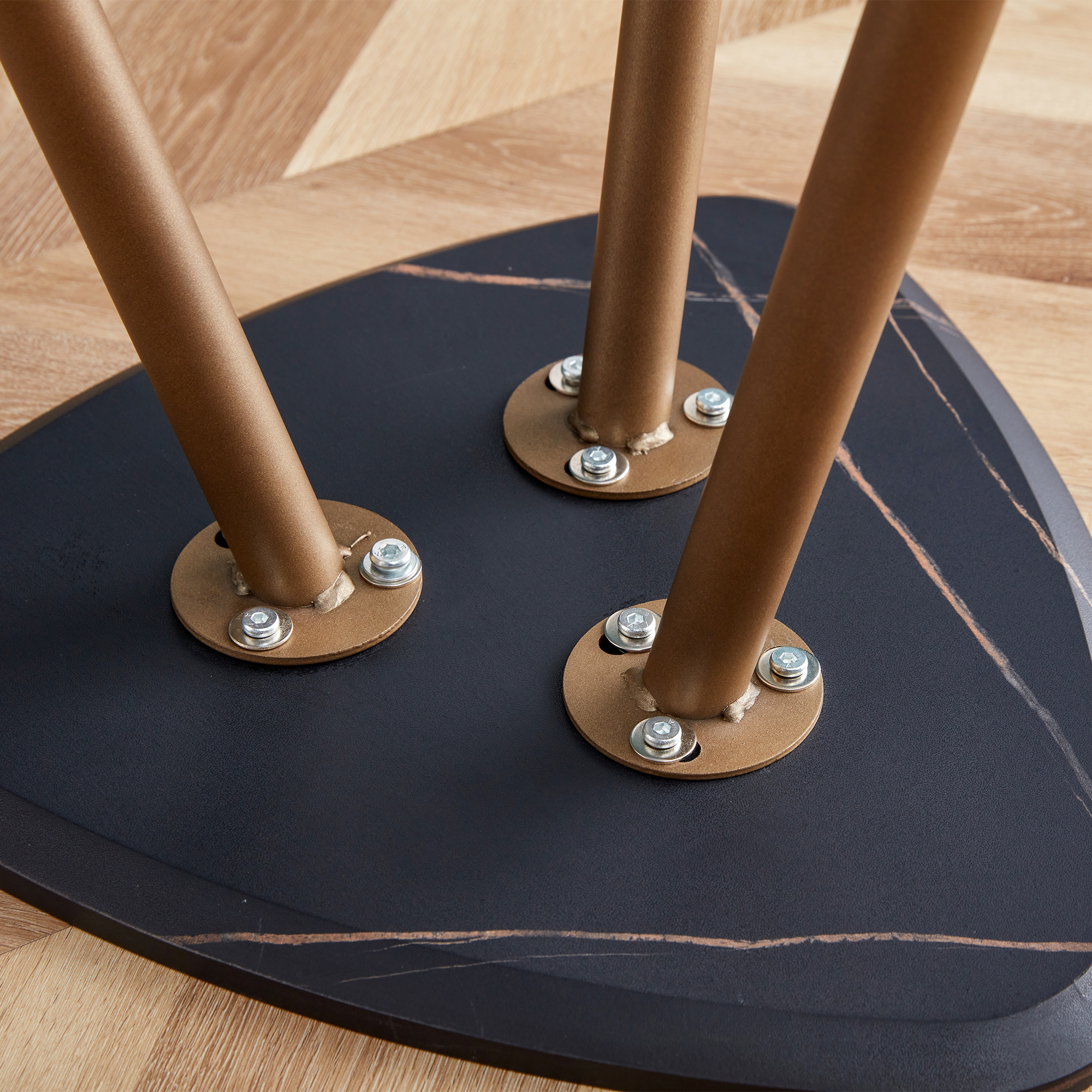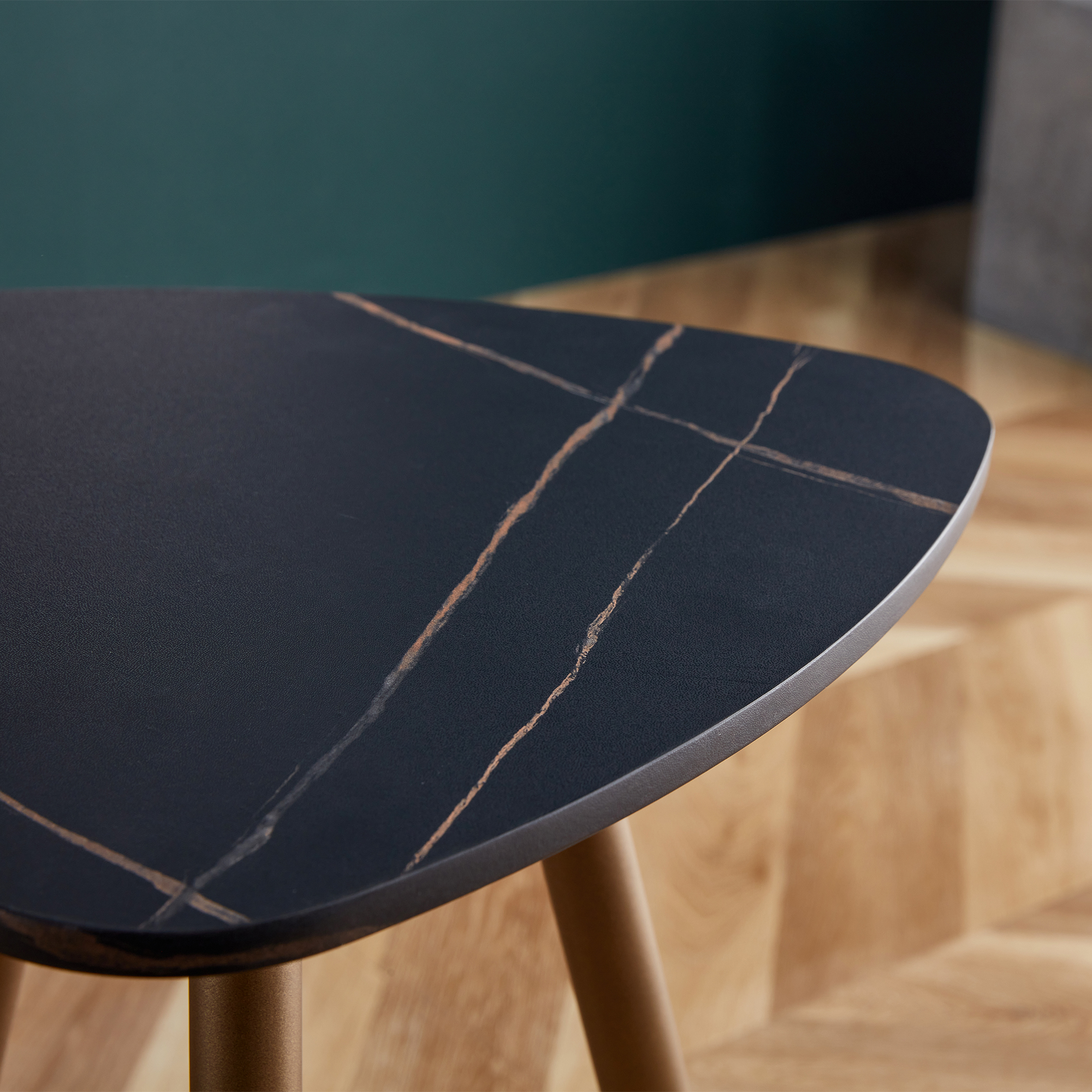 3.The end table featuring a black marble-like tabletop with three dark gold metal legs, adds a stylish style with its clean lined design.