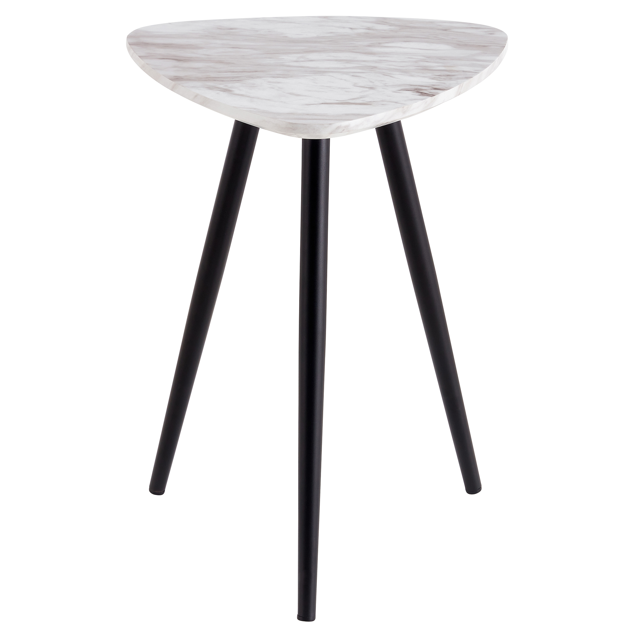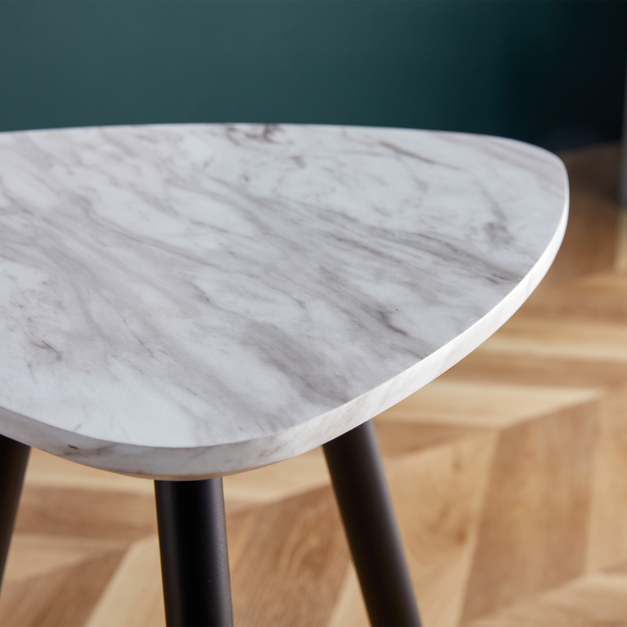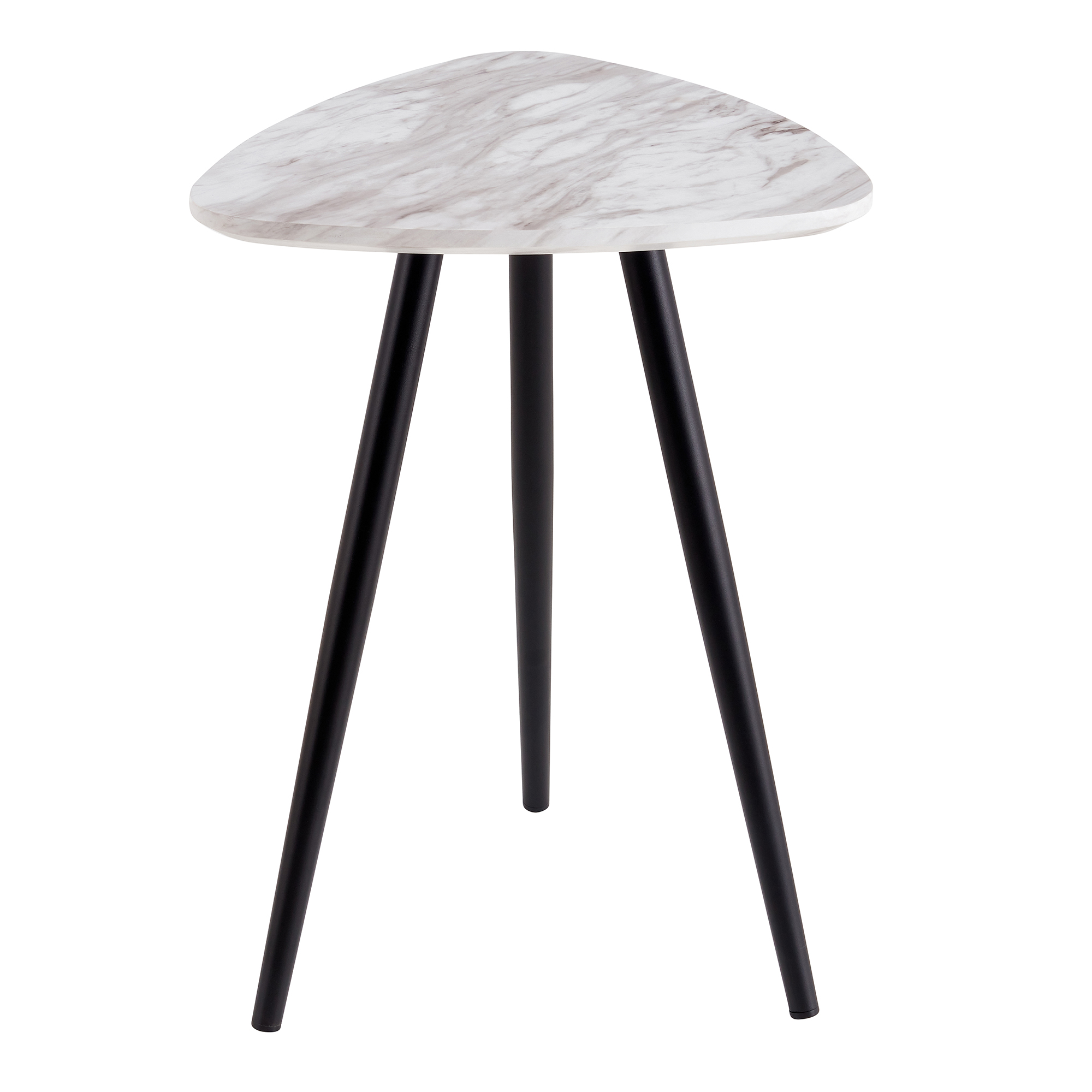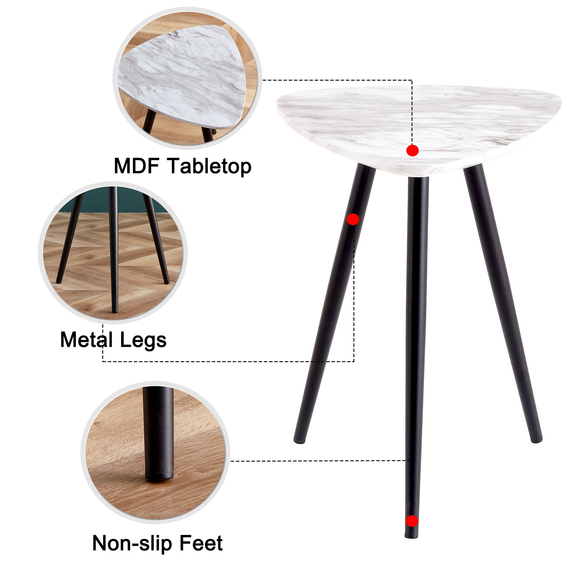 3.The end table featuring a black marble-like tabletop with three dark gold metal legs, adds a stylish style with its clean lined design.
