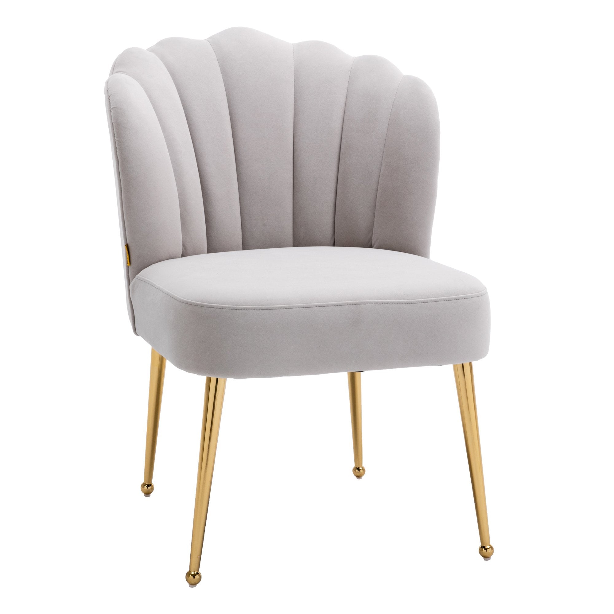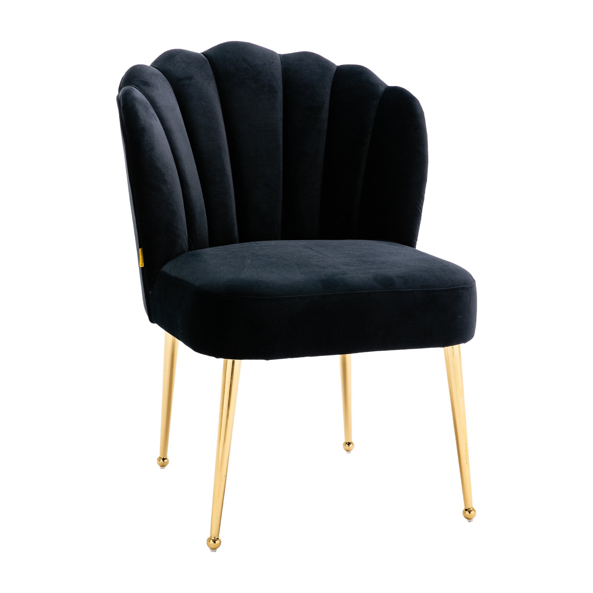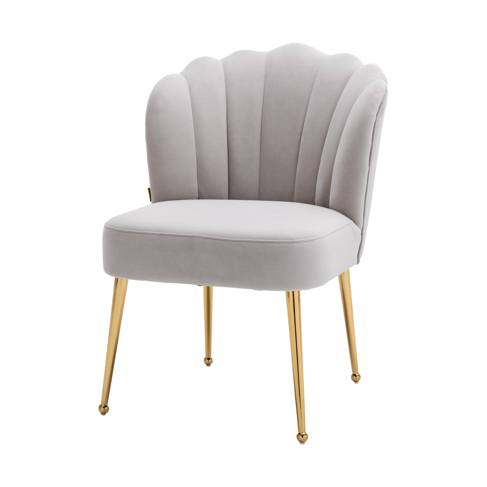 This modern style accent chair is perfect for small spaces, whether you pull it up to your dining table or complete your living room with an extra seat. Elegantly upholstered velvet curves meet sleek metal legs, and the scalloped shell backrest creates an artistic elegance that gives this chair a contemporary flair and adds a chic ambiance to your dining room, den or bedroom.