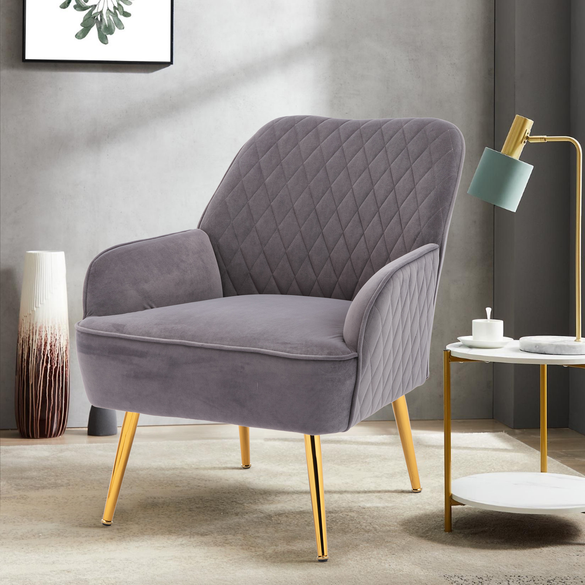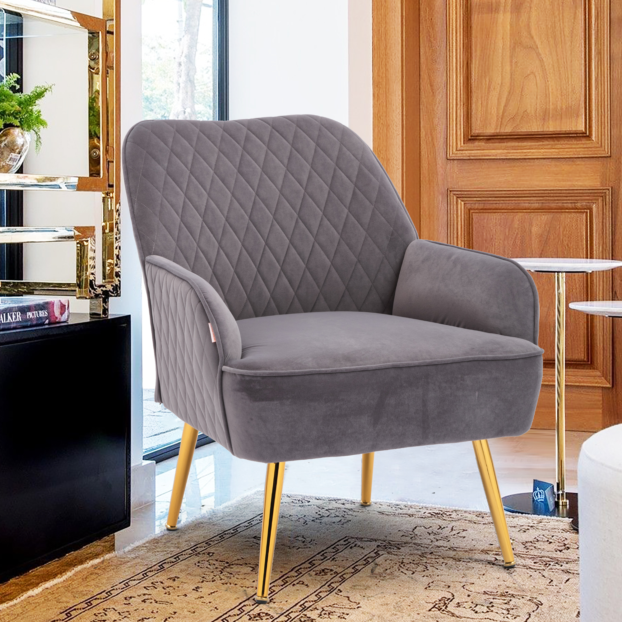 | 2.The Velvet upholstered accent chair features a padded seat, curved back and neat arm, which can hold you like embracing in the arms, and keep you lounging and relaxing in cushioned comfort. | |