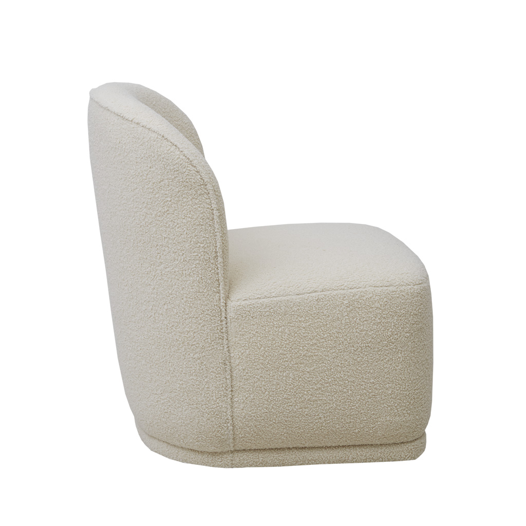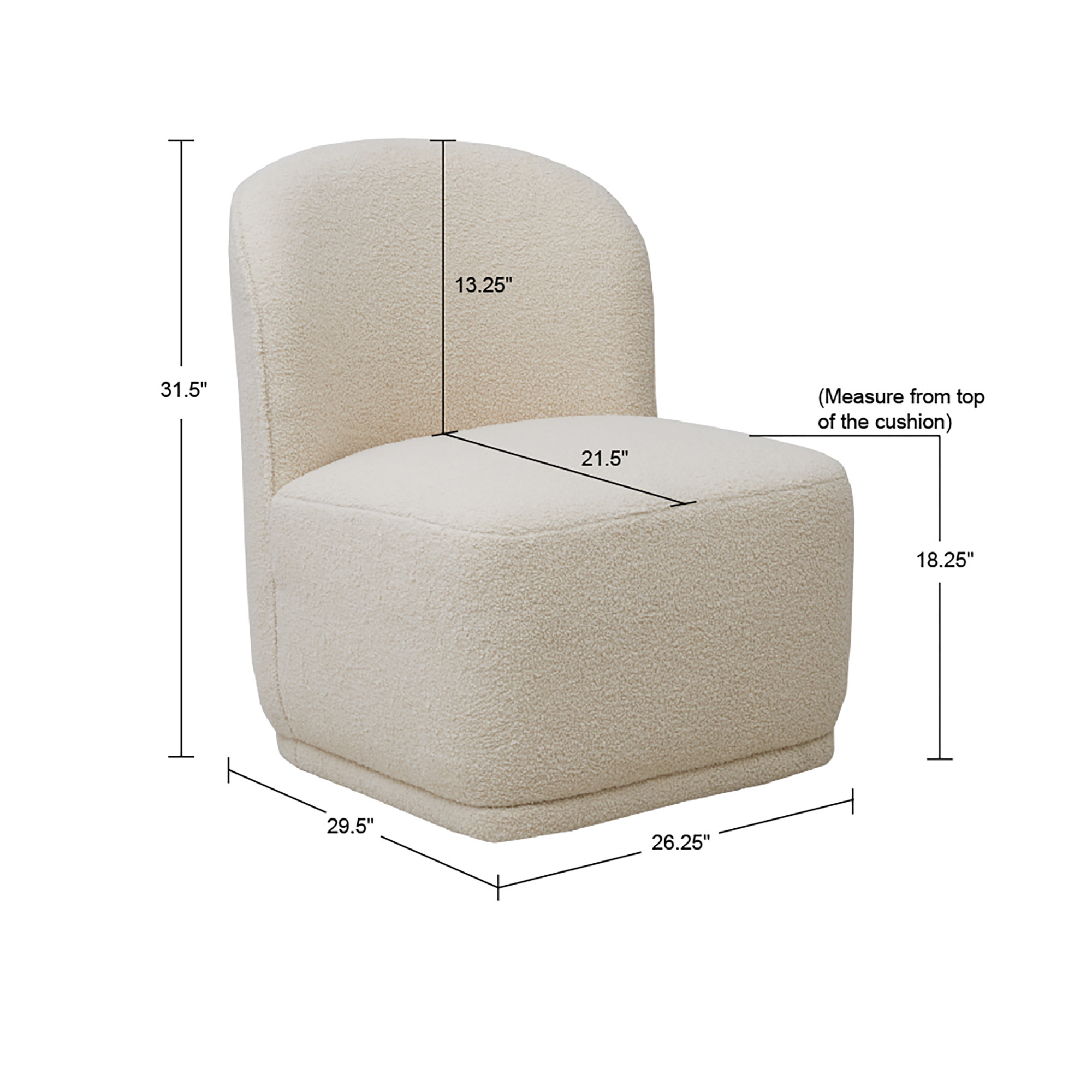 Long Descriptions | The Madison Park Irene Armless Swivel Chair offers a modern sophisticated update to your living room. Upholstered in an ivory faux boucle fabric, this swivel chair flaunts a rounded design and curved back to create a chic minimalistic profile. The hidden swivel base allows the chair to fully rotate 360 degrees. Perfect for small spaces, this swivel chair brings an inviting look and cozy comfort to your home decor. Ready right out of the box! No assembly is required. |