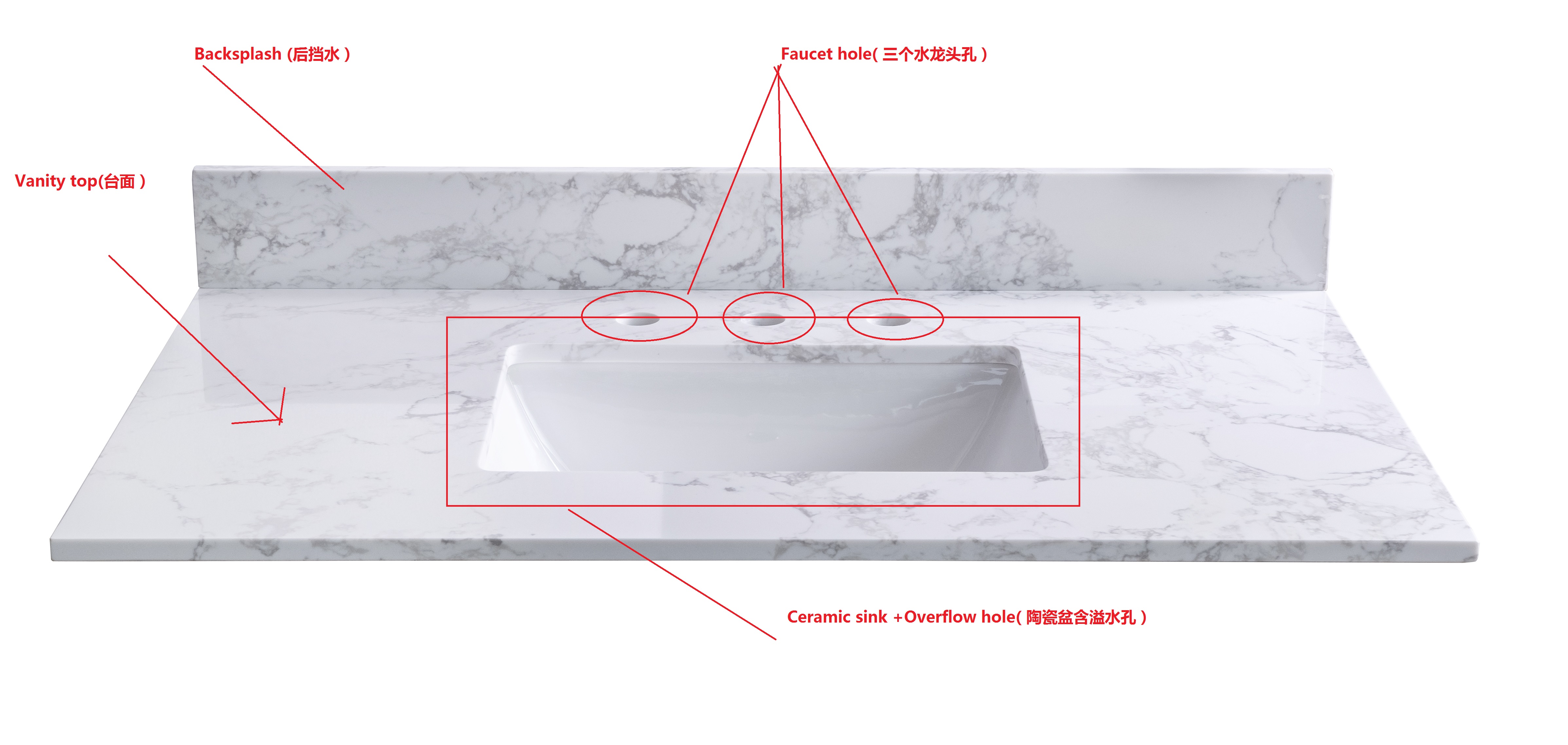 Product includes: Stone vanity top + backsplash+ceramic sink and detail drawings inch