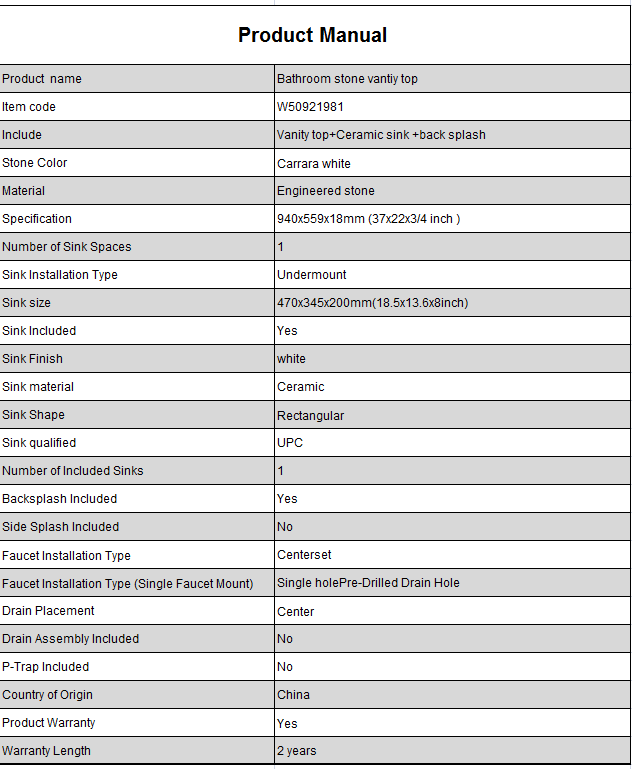 - [PACKAGE INCLUDED] Vanity top with assembled rectangular under mount bowl matching 4" high Backsplash Besides extremely solid package - very firm carton box with foam is used to transport top making sure a safe delivery (Attention) Faucet and side splash NOT included.
