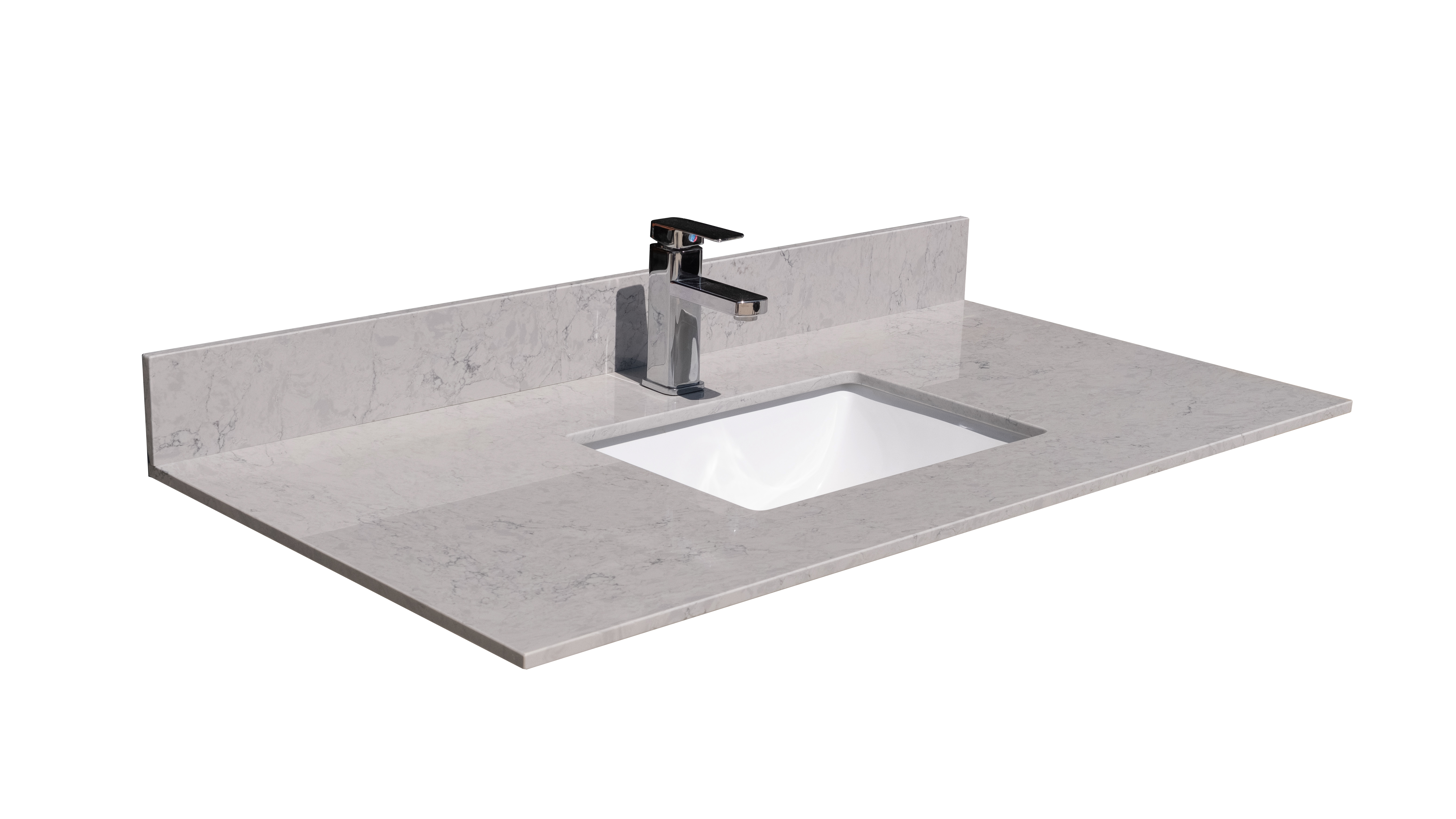 The vanity tops are made of beautiful Engineered stone. All exterior sides are polished for a luxurious look. Each model is complemented with a ceramic Rectangle undermount sink. The matching backsplash is included in each package.