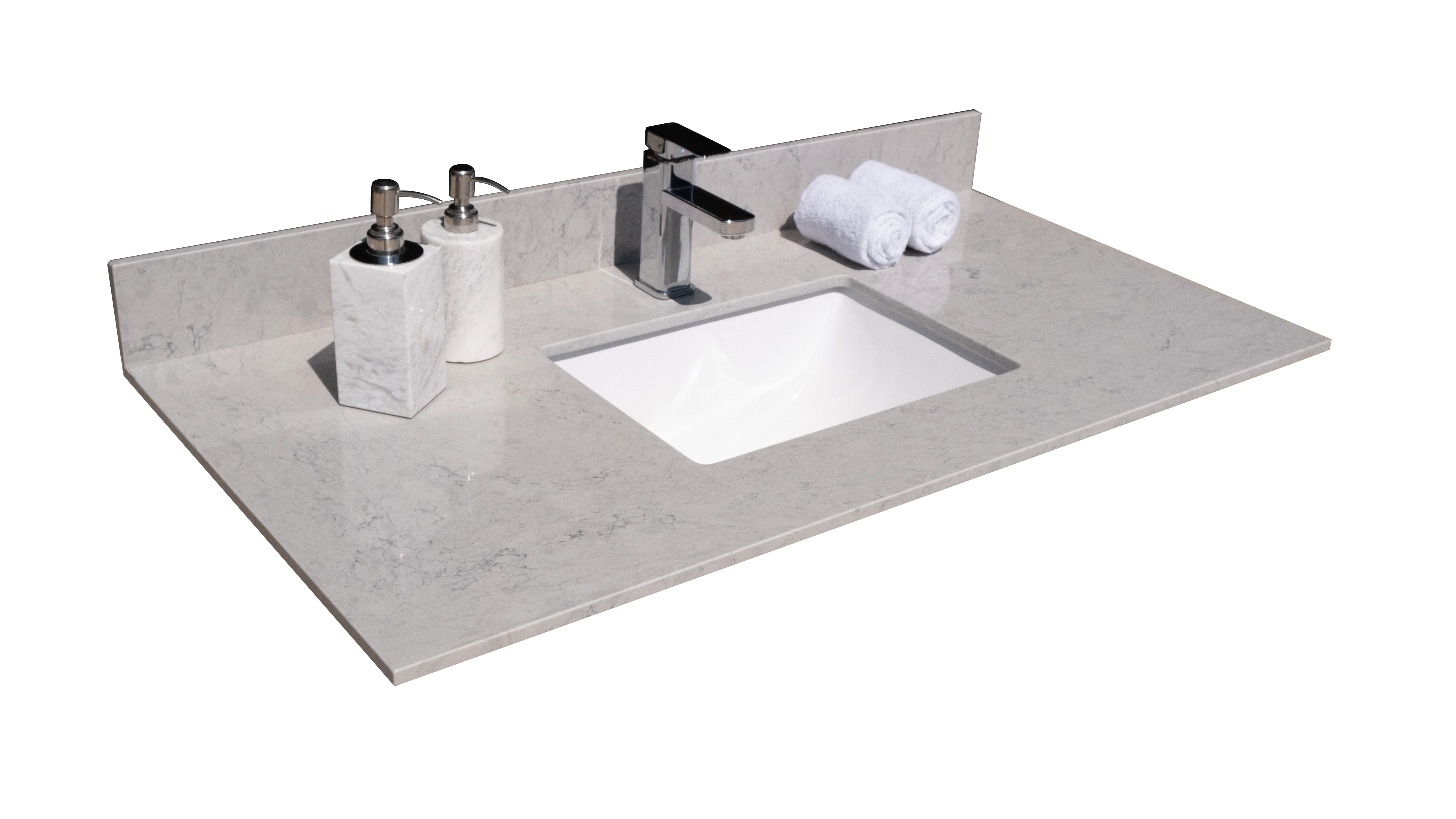 - [PACKAGE INCLUDED] Vanity top with assembled rectangular under mount bowl matching 4" high Backsplash Besides extremely solid package - very firm carton box with foam is used to transport top making sure a safe delivery (Attention) Faucet and side splash NOT included