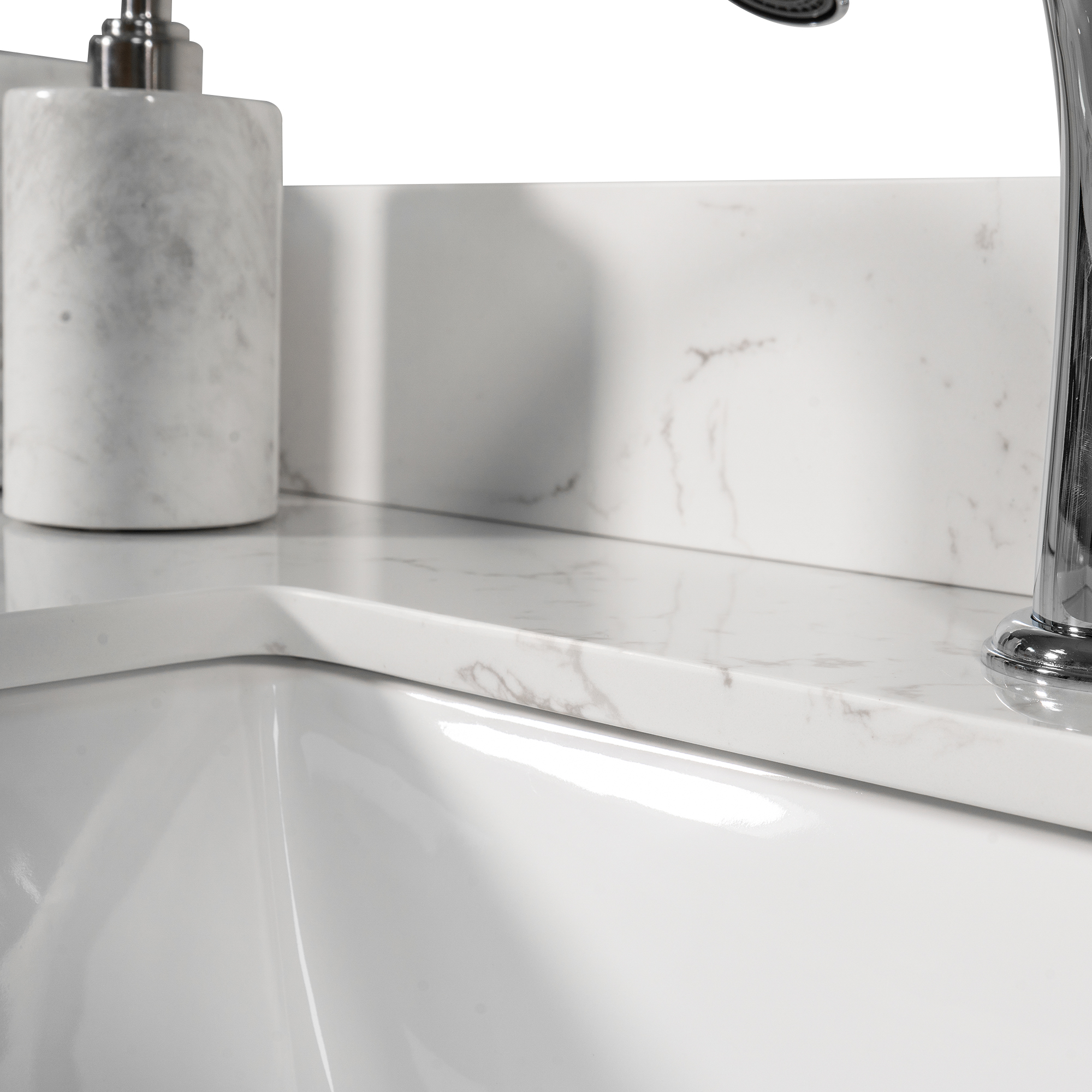 - [Easy to Installation] Top pre-drilled for 8-inch widespread faucet Assembled stylish rectangular white vitreous china under-mount bowl with safety overflow hole This top is perfect for quick and easy remodels Obtain the beauty and durability of marble without hiring a professional