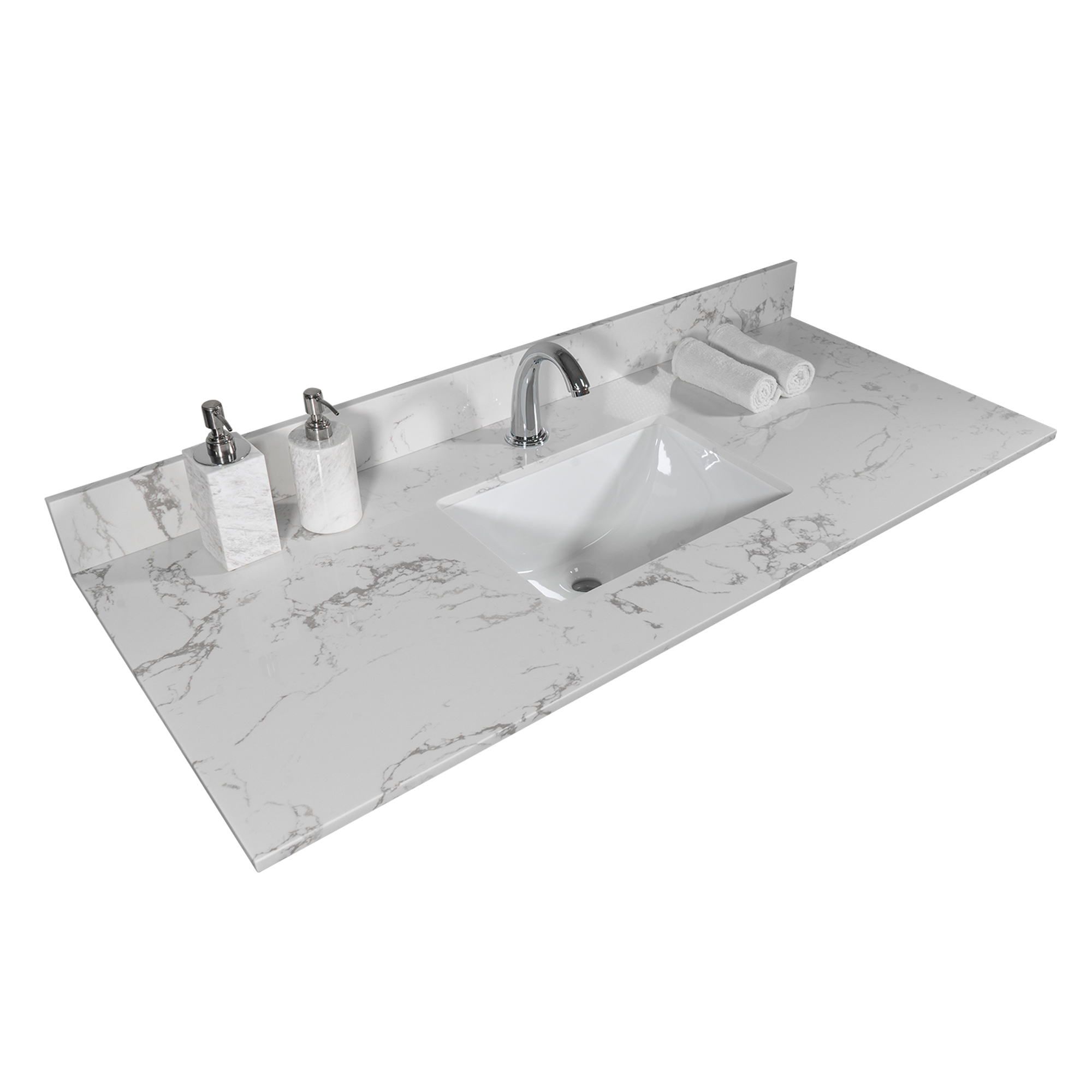 - [PACKAGE INCLUDED] Vanity top with assembled rectangular under mount bowl matching 4" high Backsplash Besides extremely solid package - very firm carton box with foam is used to transport top making sure a safe delivery (Attention) Faucet and side splash NOT included