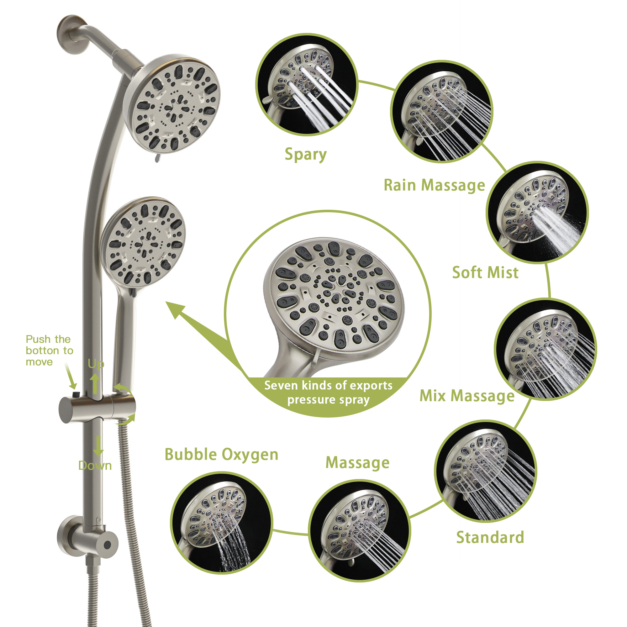 - Each shower has 7 Settings: rain, massage, spray and other modes. Each model has its own advantages. You can choose the shower mode according to your preferences, and you can enjoy massage-like comfort in the shower.