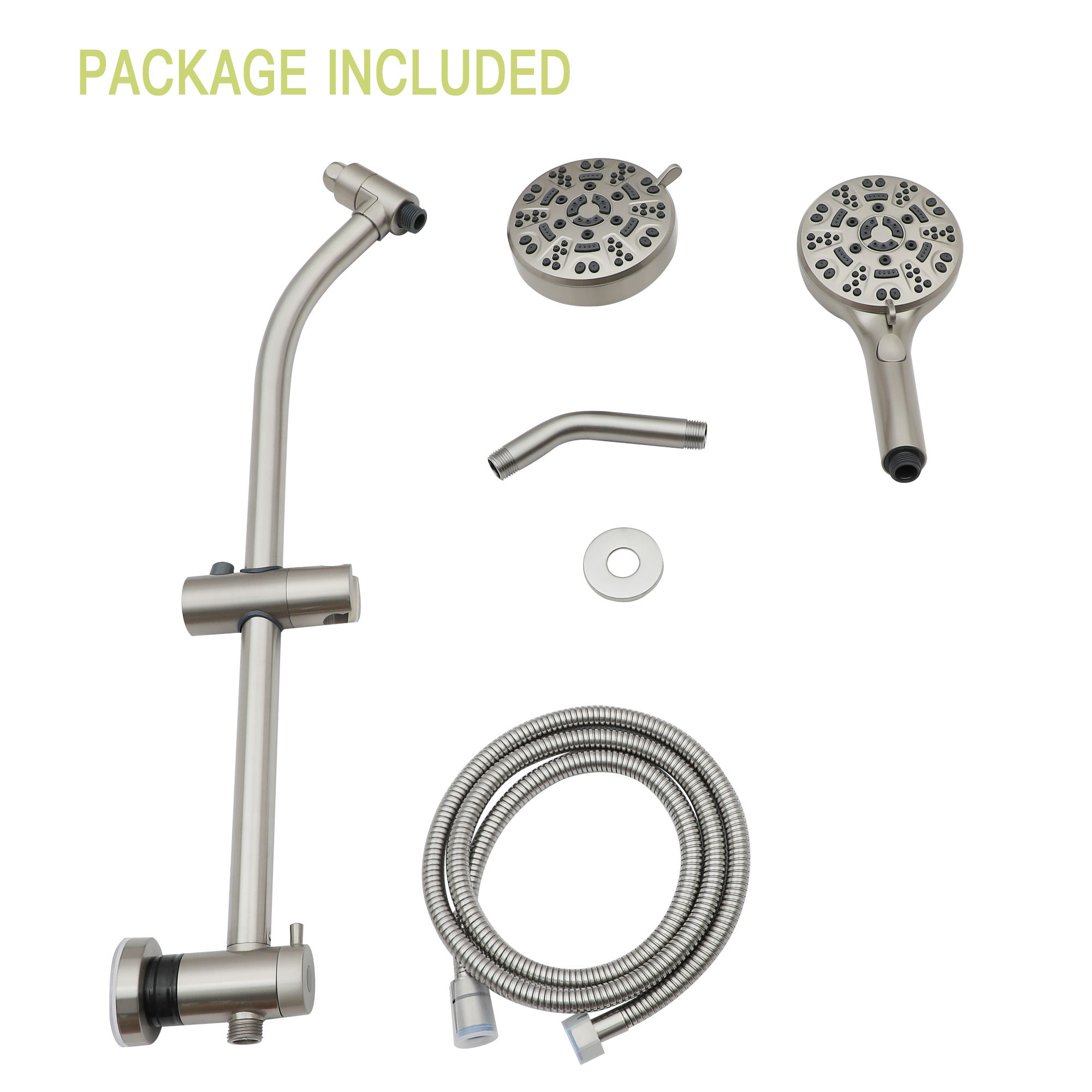 - The set includes an adjustable slide bar, which can be adjusted to suit the height of the shower. Whether the elderly, children, or adults use are a very good choice. What's included: 4.7-inch shower head and adjustable hand-held shower, 25.5-inch sliding adjustable rod, adjustable Angle shower holder, 59-inch stainless steel shower hose, stainless steel shower arm with enamel cover, gasket, plumber's tape, installation/operator's manual, etc.
