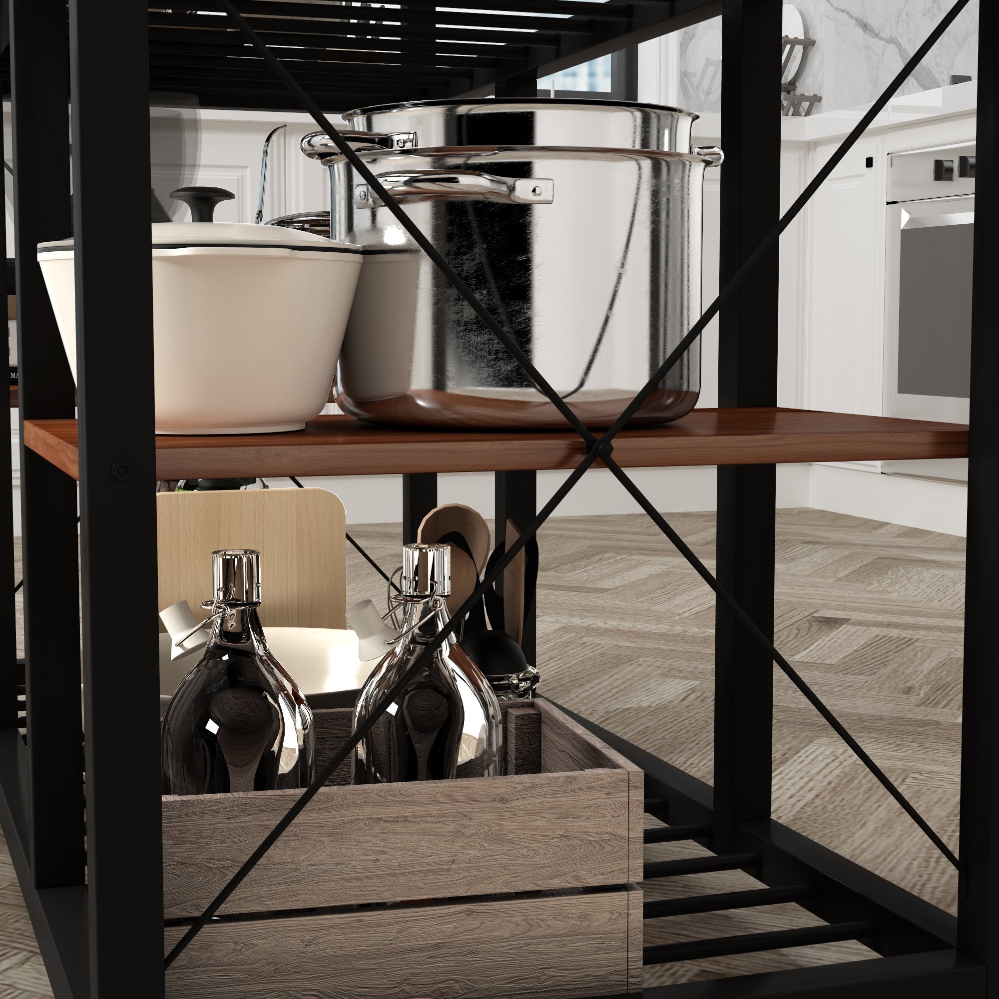Spacious Kitchen Prep Table---If you happen to own a small kitchen room and no counter space, preparing food may be easy to run out of areas. With 47.2x23.6inch spacious tabletop, this prep table will offer you enough space to enjoy your cooking time with your sweethearts. With 4 open shelves (2 side shelves), pots, pans, wine bottles or other adds and ends can be easily touched within arm's reach.