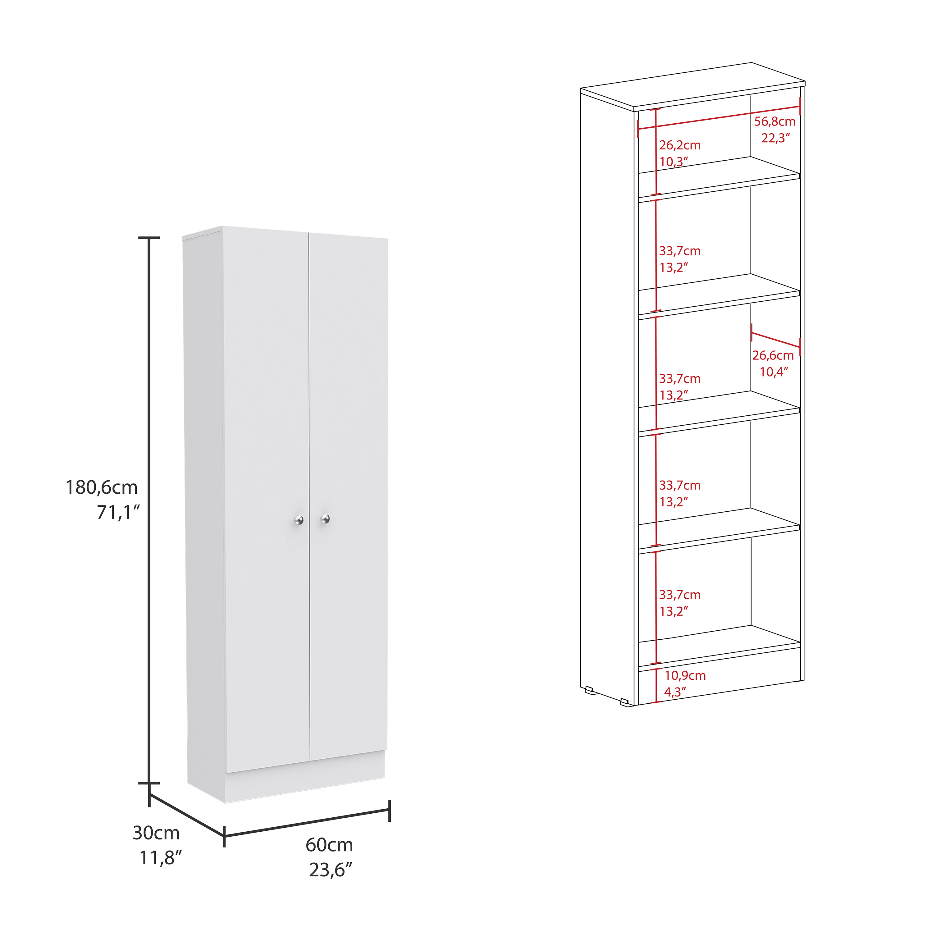 Add expansive storage space to any area of your home without taking up too much square footage, thanks to the TUHOME Free Standing 5-shelf Multistorage Cabinet. It features 5 deep, fixed shelves behind a pair of doors, making it ideal for organizing all your dry goods in a single place. Use it in your kitchen or bedroom as a handy wardrobe for casual clothes, in the garage for gear storage, or in the bathroom as a linen closet. The storage organizer cabinet is crafted from lightweight wood laminate with a bright white finish, accented with polished metal hardware and hidden hinges. Tall and slim, adding this cabinet to any corner or adjacent to your existing fixtures is easy. Its crisp white finish emphasizes the modern lines and easily complements any style of decor. Unclutter your life with the TUHOME Free Standing 5 Shelf Wood Pantry Multistorage Cabinet.Its size (23,6''W X 11,8''D X 70,8''H) fits perfect in any room. Includes Single Door cabinet with five internal shelves (22,0''W X 12,9''H) (11 lb max suggested load capacity)