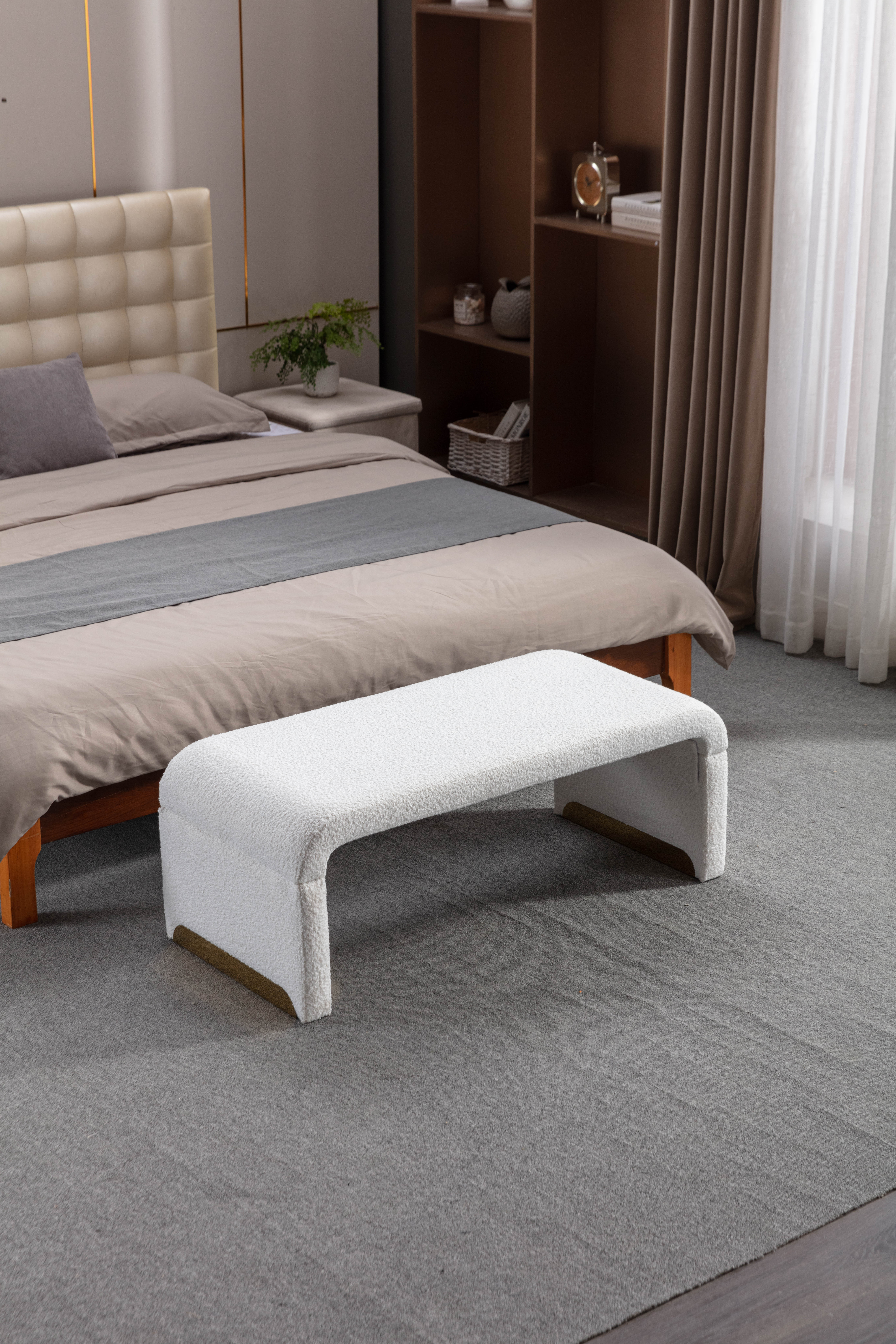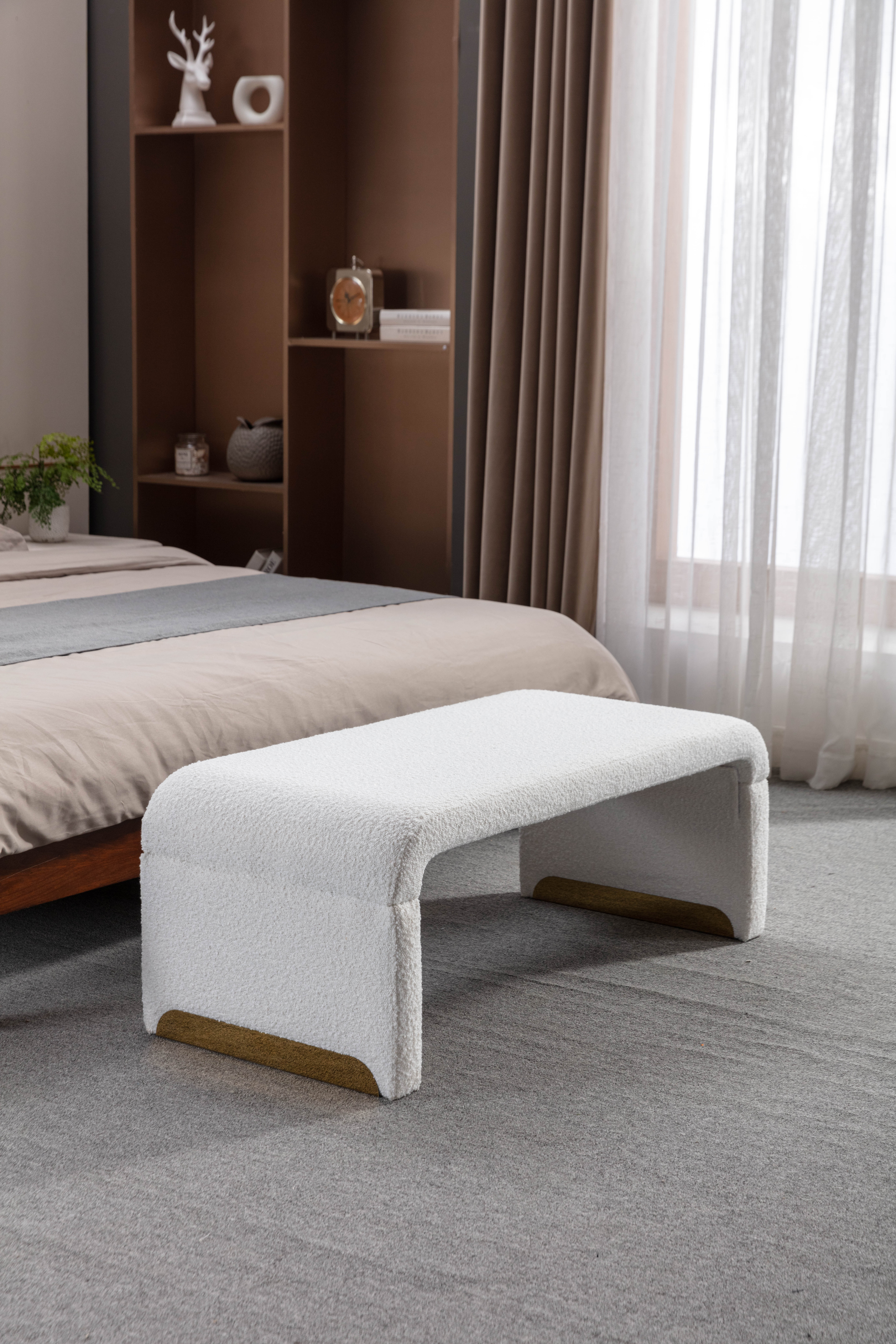1.Product Pomposition:Boucle Material+Foam Filled+Wooden Frame+Gold Metal Legs;2.Product Size-Weight:Length19.69"×Width43.31"×Height16.14";Weight:26.5lbs;3.Package Size-Weight:43.7"×5.5"×20";Weight:30lbs;4.Product Assembling:It can be assembled by one person in 15 minutes;5.Applicable Scope:Indoor,Bedroom Bench,Shoes Bench,Out of the door and so on.6.AppLicable Age:5-70 Ages;7.Weight Capacity:200lbs;8.Product Care:Spot wipe clean with a soft, dry cloth;